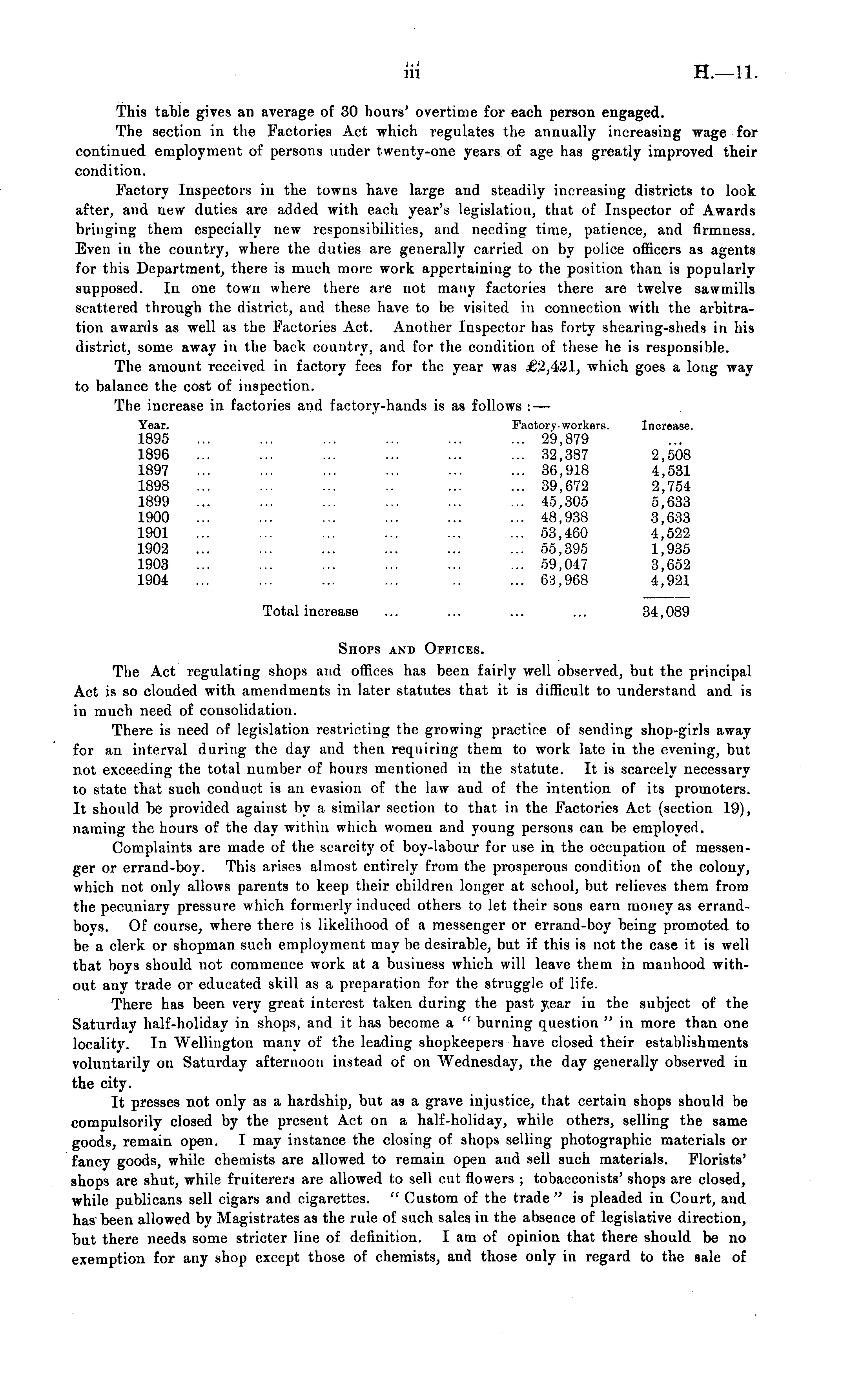 This table gives an average of 30 hours' overtime for each person engaged. The section in the Factories Act which regulates the annually increasing wage for continued employment of persons under twenty-one years of age has greatly improved their condition. Factory Inspectors in the towns have large and steadily increasing districts to look after, and new duties are added with each year's legislation, that of Inspector of Awards bringing them especially new responsibilities, and needing time, patience, and firmness. Even in the country, where the duties are generally carried on by police officers as agents for this Department, there is much more work appertaining to the position than is popularly supposed. In one town where there are not many factories there are twelve sawmills scattered through the district, and these have to be visited in connection with the arbitration awards as well as the Factories Act. Another Inspector has forty shearing-sheds in his district, some away in the back country, and for the condition of these he is responsible. The amount received in factory fees for the year was £2,421, which goes a long way to balance the cost of inspection. The increase in factories and factory-hands is as follows : — Year. Factory-workers. Increase. 1895 ... ... ... ... ... ... 29,879 1896 ... ... ... ... ... ... 32,387 2,508 1897 ... ... ... ... ... ... 36,918 4,531 1898 ... ... ... .. ... ... 39,672 2,754 1899 ... ... ... ... ... ... 45,305 5,633 1900 ... ... ... ... ... ... 48,938 3,633 1901 ... ... ... ... ... ... 53,460 4,522 1902 ... ... ... ... ... ... 55,395 1,935 1903 ... ... ... ... ... ... 59,047 3,652 1904 ... ... ... ... .. ... 63,968 4,921 Total increase ... ... ... ... 34,089 Shops and Offices. The Act regulating shops and offices has been fairly well observed, but the principal Act is so clouded with amendments in later statutes that it is difficult to understand and is in much need of consolidation. There is need of legislation restricting the growing practice of sending shop-girls away for an interval during the day and then requiring them to work late in the evening, but not exceeding the total number of hours mentioned in the statute. It is scarcely necessary to state that such conduct is an evasion of the law and of the intention of its promoters. It should be provided against by a similar section to that in the Factories Act (section 19), naming the hours of the day within which women and young persons can be employed. Complaints are made of the scarcity of boy-labour for use in the occupation of messenger or errand-boy. This arises almost entirely from the prosperous condition of the colony, which not only allows parents to keep their children longer at school, but relieves them from the pecuniary pressure which formerly induced others to let their sons earn money as errandbovs. Of course, where there is likelihood of a messenger or errand-boy being promoted to be a clerk or shopman such employment may be desirable, but if this is not the case it is well that boys should not commence work at a business which will leave them in manhood without any trade or educated skill as a preparation for the struggle of life. There has been very great interest taken during the past year in the subject of the Saturday half-holiday in shops, and it has become a " burning question " in more than one locality. In Wellington many of the leading shopkeepers have closed their establishments voluntarily on Saturday afternoon instead of on Wednesday, the day generally observed in the city. It presses not only as a hardship, but as a grave injustice, that certain shops should be compulsorily closed by the present Act on a half-holiday, while others, selling the same goods, remain open. I may instance the closing of shops selling photographic materials or fancy goods, while chemists are allowed to remain open and sell such materials. Florists' shops are shut, while fruiterers are allowed to sell cut flowers ; tobacconists' shops are closed, while publicans sell cigars and cigarettes. " Custom of the trade" is pleaded in Court, and has - been allowed by Magistrates as the rule of such sales in the absence of legislative direction, but there needs some stricter line of definition. lam of opinion that there should be no exemption for any shop except those of chemists, and those only in regard to the sale of