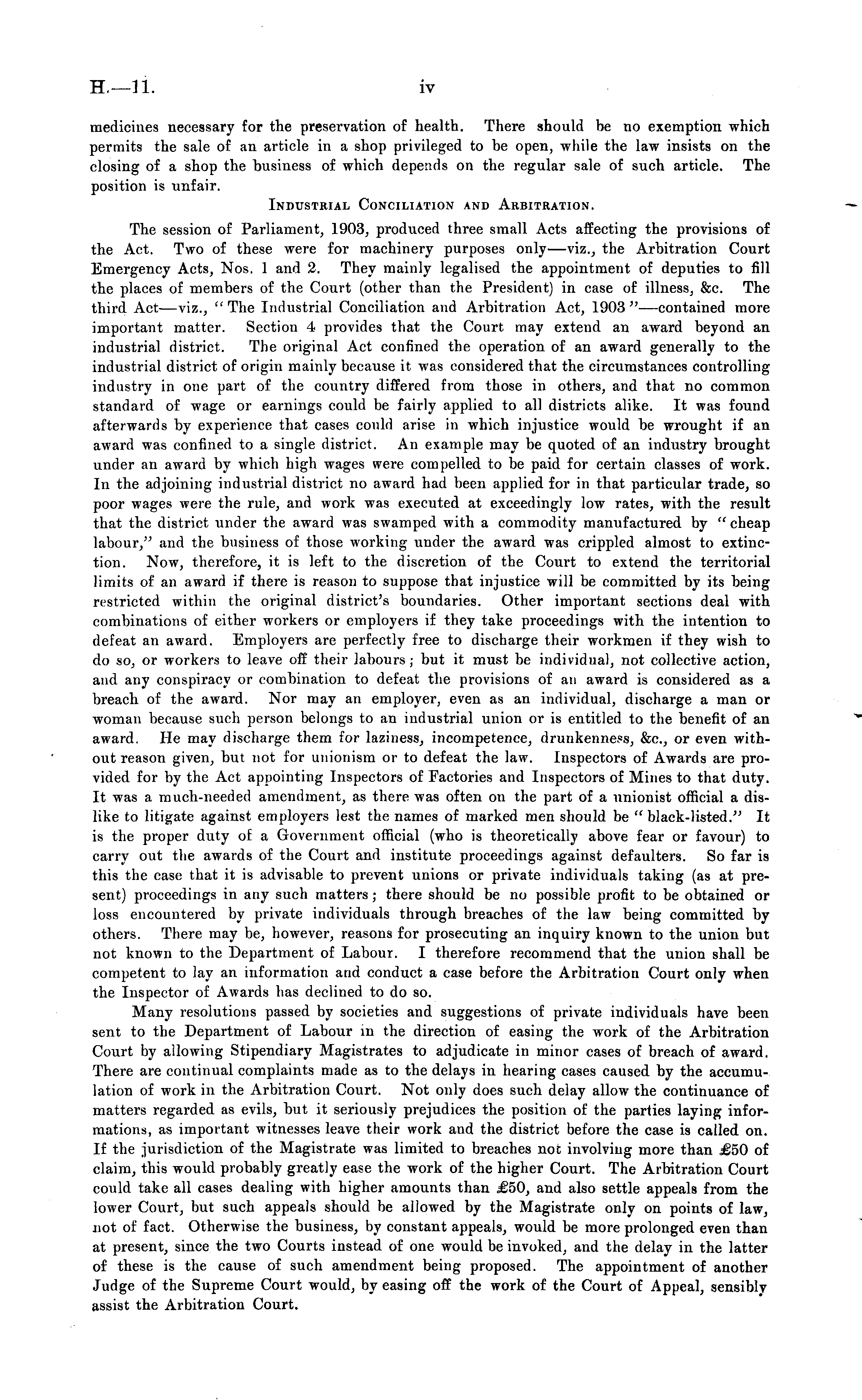 medicines necessary for the preservation of health. There should be no exemption which permits the sale of an article in a shop privileged to be open, while the law insists on the closing of a shop the business of which depends on the regular sale of such article. The position is unfair. Industrial Conciliation and Arbitration. The session of Parliament, 1903, produced three small Acts affecting the provisions of the Act. Two of these were for machinery purposes only—viz., the Arbitration Court Emergency Acts, Nos. 1 and 2. They mainly legalised the appointment of deputies to fill the places of members of the Court (other than the President) in case of illness, &c. The third Act—viz., " The Industrial Conciliation and Arbitration Act, 1903 "■—contained more important matter. Section 4 provides that the Court may extend an award beyond an industrial district. The original Act confined the operation of an award generally to the industrial district of origin mainly because it was considered that the circumstances controlling industry in one part of the country differed from those in others, and that no common standard of wage or earnings could be fairly applied to all districts alike. It was found afterwards by experience that cases could arise in which injustice would be wrought if an award was confined to a single district. An example may be quoted of an industry brought under an award by which high wages were compelled to be paid for certain classes of work. In the adjoining industrial district no award had been applied for in that particular trade, so poor wages were the rule, and work was executed at exceedingly low rates, with the result that the district under the award was swamped with a commodity manufactured by " cheap labour," and the business of those working under the award was crippled almost to extinction. Now, therefore, it is left to the discretion of the Court to extend the territorial limits of an award if there is reason to suppose that injustice will be committed by its being restricted within the original district's boundaries. Other important sections deal with combinations of either workers or employers if they take proceedings with the intention to defeat an award. Employers are perfectly free to discharge their workmen if they wish to do so, or workers to leave off their labours; but it must be individual, not collective action, and any conspiracy or combination to defeat the provisions of an award is considered as a breach of the award. Nor may an employer, even as an individual, discharge a man or woman because such person belongs to an industrial union or is entitled to the benefit of an award. He may discharge them for laziness, incompetence, drunkenness, &c, or even without reason given, but not for unionism or to defeat the law. Inspectors of Awards are provided for by the Act appointing Inspectors of Factories and Inspectors of Mines to that duty. It was a much-needed amendment, as there was often on the part of a unionist official a dislike to litigate against employers lest the names of marked men should be "black-listed." It is the proper duty of a Government official (who is theoretically above fear or favour) to carry out the awards of the Court and institute proceedings against defaulters. So far is this the case that it is advisable to prevent unions or private individuals taking (as at present) proceedings in any such matters; there should be no possible profit to be obtained or loss encountered by private individuals through breaches of the law being committed by others. There may be, however, reasons for prosecuting an inquiry known to the union but not known to the Department of Labour. I therefore recommend that the union shall be competent to lay an information and conduct a case before the Arbitration Court only when the Inspector of Awards has declined to do so. Many resolutions passed by societies and suggestions of private individuals have been sent to the Department of Labour in the direction of easing the work of the Arbitration Court by allowing Stipendiary Magistrates to adjudicate in minor cases of breach of award. There are continual complaints made as to the delays in hearing cases caused by the accumulation of work in the Arbitration Court. Not only does such delay allow the continuance of matters regarded as evils, but it seriously prejudices the position of the parties laying informations, as important witnesses leave their work and the district before the case is called on. If the jurisdiction of the Magistrate was limited to breaches not involving more than £50 of claim, this would probably greatly ease the work of the higher Court. The Arbitration Court could take all cases dealing with higher amounts than £50, and also settle appeals from the lower Court, but such appeals should be allowed by the Magistrate only on points of law, not of fact. Otherwise the business, by constant appeals, would be more prolonged even than at present, since the two Courts instead of one would be invoked, and the delay in the latter of these is the cause of such amendment being proposed. The appointment of another Judge of the Supreme Court would, by easing off the work of the Court of Appeal, sensibly assist the Arbitration Court.