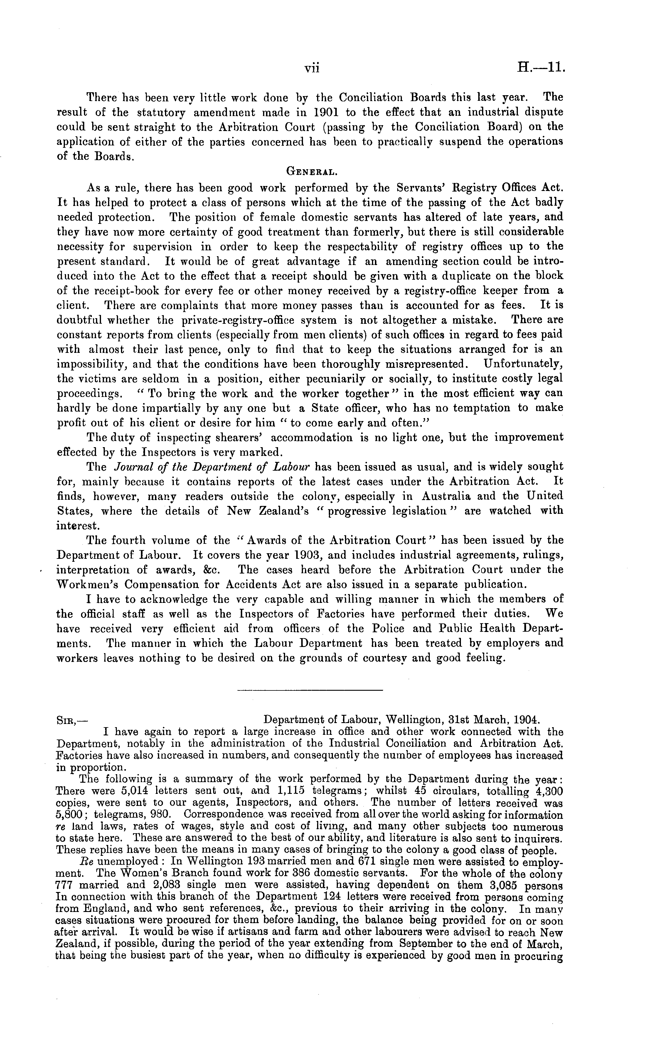 Sir, — Department of Labour, Wellington, 31st March, 1904. I have again to report a large increase in office and other work connected with the Department, notably in the administration of the Industrial Conciliation and Arbitration Act. Factories have also increased in numbers, and consequently the number of employees has increased in proportion. The following is a summary of the work performed by the Department during the year: There were 5,014 letters sent out, and 1,115 telegrams; whilst 45 circulars, totalling 4,300 copies, were sent to our agents, Inspectors, and others. The number of letters received was 5,800; telegrams, 980. Correspondence was received from all over the world asking for information re land laws, rates of wages, style and cost of living, and many other subjects too numerous to state here. These are answered to the best of our ability, and literature is also sent to inquirers. These replies have been the means in many cases of bringing to the colony a good class of people. Be unemployed : In Wellington 193 married men and 671 single men were assisted to employment. The Women's Branch found work for 386 domestic servants. For the whole of the colony 777 married and 2,083 single men were assisted, having dependent on them 3,085 persons In connection with this branch of the Department 124 letters were received from persons coming from England, and who sent references, &c, previous to their arriving in the colony. In many cases situations were procured for them before landing, the balance being provided for on or soon after arrival. It would be wise if artisans and farm and other labourers were advised to reach New Zealand, if possible, during the period of the year extending from September to the end of March, that being the busiest part of the year, when no difficulty is experienced by good men in procuring