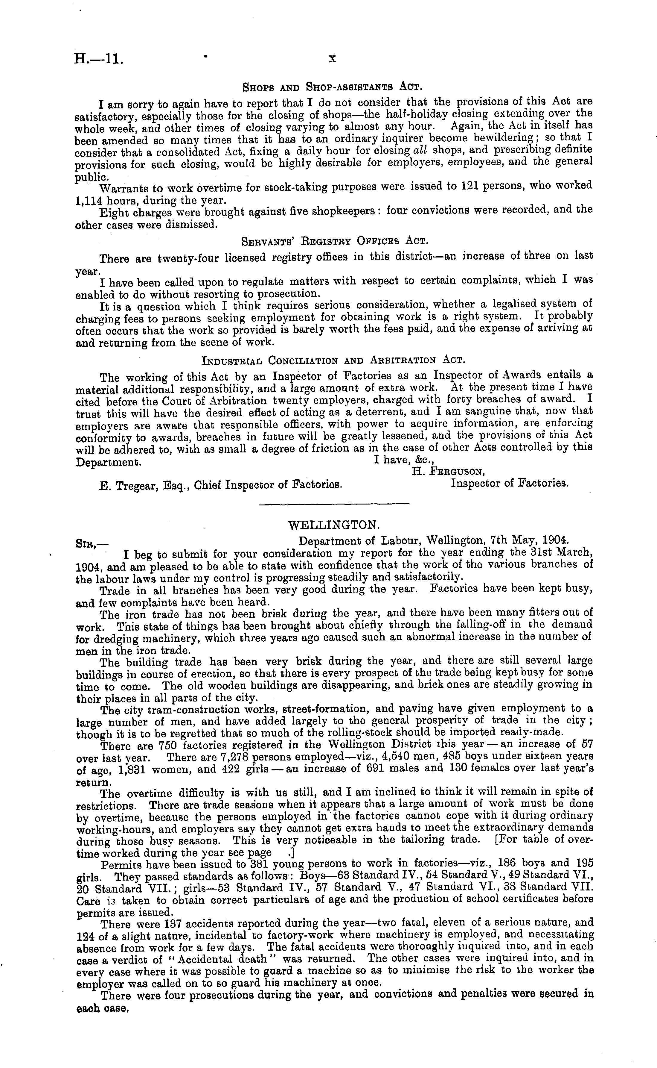 Shops and Shop-assistants Act. I am sorry to again have to report that I do not consider that the provisions of this Act are satisfactory, especially those for the closing of shops—the half-holiday closing extending over the whole week, and other times of closing varying to almost any hour. Again, the Act in itself has been amended so many times that it has to an ordinary inquirer become bewildering; so that I consider that a consolidated Act, fixing a daily hour for closing all shops, and prescribing definite provisions for such closing, would be highly desirable for employers, employees, and the general public. Warrants to work overtime for stock-taking purposes were issued to 121 persons, who worked 1,114 hours, during the year. Eight charges were brought against five shopkeepers; four convictions were recorded, and the other cases were dismissed. Seevants' Registby Offices Act. There are twenty-four licensed registry offices in this district—an increase of three on last year. I have been called upon to regulate matters with respect to certain complaints, which I was enabled to do without resorting to prosecution. It is a question which I think requires serious consideration, whether a legalised system of charging fees to persons seeking employment for obtaining work is a right system. It probably often occurs that the work so provided is barely worth the fees paid, and the expense of arriving at and returning from the scene of work. Industeiad Conciliation and Aebiteation Act. The working of this Act by an Inspector of Factories as an Inspector of Awards entails a material additional responsibility, and a large amount of extra work. At the present time I have cited before the Court of Arbitration twenty employers, charged with forty breaches of award. I trust this will have the desired effect of acting as a deterrent, and I am sanguine that, now that employers are aware that responsible officers, with power to acquire information, are enforcing conformity to awards, breaches in future will be greatly lessened, and the provisions of this Act will be adhered to, with as small a degree of friction as in the case of other Acts controlled by this Department. I have, &c, H. Fbeguson, E. Tregear, Esq., Chief Inspector of Factories. Inspector of Factories.