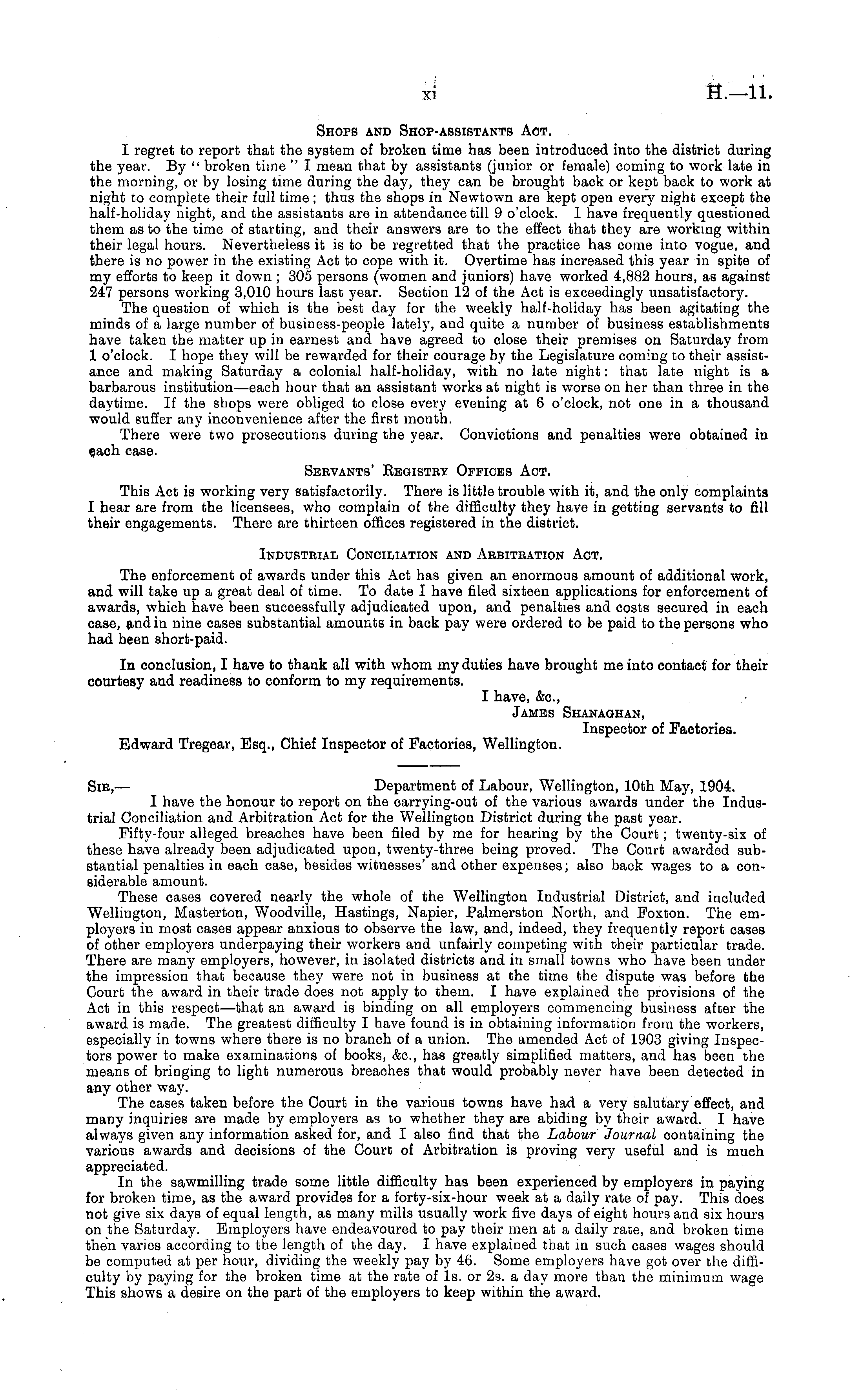 Sic, — Department of Labour, Wellington, 10th May, 1904. I have the honour to report on the carrying-out of the various awards under the Industrial Conciliation and Arbitration Act for the Wellington District during the past year. Fifty-four alleged breaches have been filed by me for hearing by the Court; twenty-six of these have already been adjudicated upon, twenty-three being proved. The Court awarded substantial penalties in each case, besides witnesses' and other expenses; also back wages to a considerable amount. These cases covered nearly the whole of the Wellington Industrial District, and included Wellington, Masterton, Woodville, Hastings, Napier, Palmerston North, and Foxton. The employers in most cases appear anxious to observe the law, and, indeed, they frequently report cases of other employers underpaying their workers and unfairly competing with their particular trade. There are many employers, however, in isolated districts and in small towns who have been under the impression that because they were not in business at the time the dispute was before the Court the award in their trade does not apply to them. I have explained the provisions of the Act in this respect—that an award is binding on all employers commencing business after the award is made. The greatest difficulty I have found is in obtaining information from the workers, especially in towns where there is no branch of a union. The amended Act of 1903 giving Inspectors power to make examinations of books, &c, has greatly simplified matters, and has been the means of bringing to light numerous breaches that would probably never have been detected in any other way. The cases taken before the Court in the various towns have had a very salutary effect, and many inquiries are made by employers as to whether they are abiding by their award. I have always given any information asked for, and I also find that the Labour Journal containing the various awards and decisions of the Court of Arbitration is proving very useful and is much appreciated. In the sawmilling trade some little difficulty has been experienced by employers in paying for broken time, as the award provides for a forty-six-hour week at a daily rate of pay. This does not give six days of equal length, as many mills usually work five days of eight hours and six hours on the Saturday. Employers have endeavoured to pay their men at a daily rate, and broken time then varies according to the length of the day. I have explained that in such cases wages should be computed at per hour, dividing the weekly pay by 46. Some employers have got over the difficulty by paying for the broken time at the rate of Is. or 2s. a day more than the minimum wage This shows a desire on the part of the employers to keep within the award.