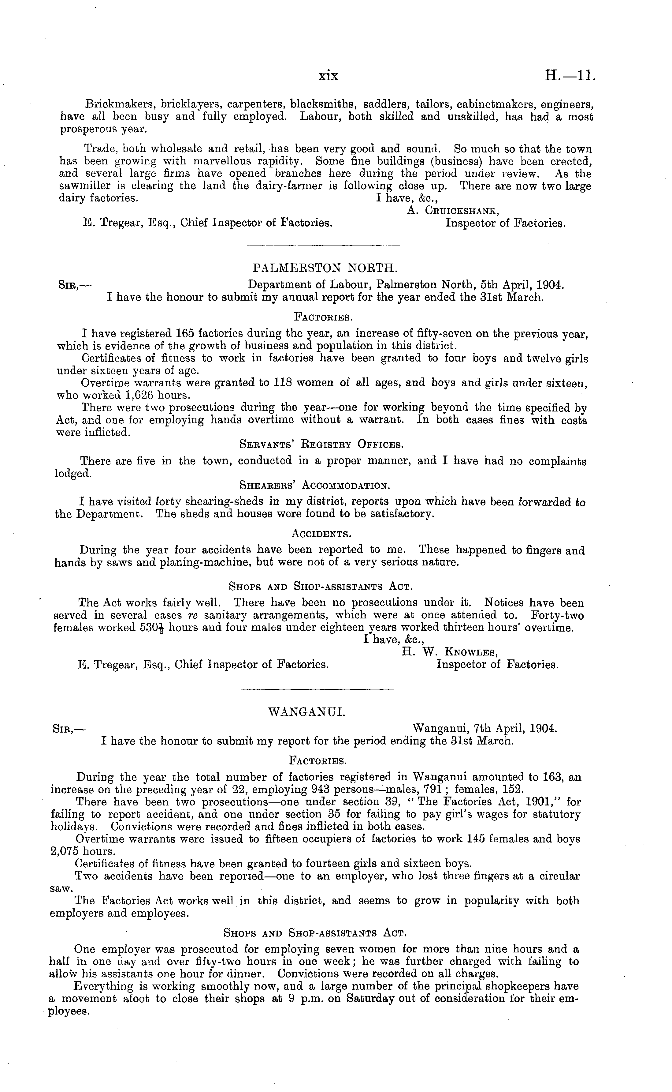 WANGANUI. Sic, — Wanganui, 7th April, 1904. I have the honour to submit my report for the period ending the 31st March. Factories. During the year the total number of factories registered in Wanganui amounted to 163, an increase on the preceding year of 22, employing 943 persons—males, 791 ; females, 152. There have been two prosecutions—one under section 39, " The Factories Act, 1901," for failing to report accident, and one under section 35 for failing to pay girl's wages for statutory holidays. Convictions were recorded and fines inflicted in both cases. Overtime warrants were issued to fifteen occupiers of factories to work 145 females and boys 2,075 hours. Certificates of fitness have been granted to fourteen girls and sixteen boys. Two accidents have been reported—one to an employer, who lost three fingers at a circular saw. The Factories Act works well in this district, and seems to grow in popularity with both employers and employees. Shops and Shop-assistants Act. One employer was prosecuted for employing seven women for more than nine hours and a half in one day and over fifty-two hours in one week; he was further charged with failing to allow his assistants one hour for dinner. Convictions were recorded on all charges. Everything is working smoothly now, and a large number of the principal shopkeepers have a movement afoot to close their shops at 9 p.m. on Saturday out of consideration for their employees.