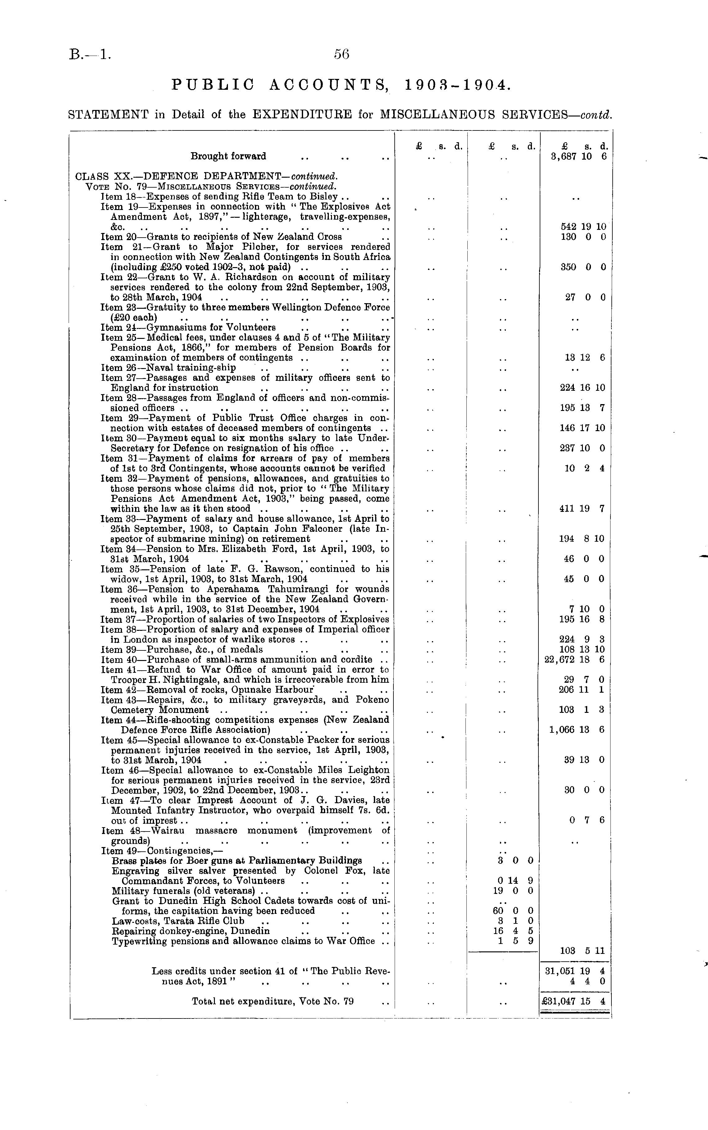 £ s. d. £ s. d. £ s. d. 3,687 10 6 Brought f orwara CLASS XX.—DEFENCE DEPARTMENT—ccmiwiwed. Vote No. 79 —Miscellaneous Services— continued. Item 18—Expenses of senaing Rifle Team to Bisley Item 19—Expenses in connection with " The Explosives Act Amenament Aot, 1897," — lighterage, travelling-expenses, &o. Item 20—Grants to recipients of New Zealana Cross Item 21—Grant to Major Pilcher, for services rendered in connection with New Zealand Contingents in South Africa (including £250 voted 1902-3, not paid) Item 22—Grant to W. A. Richardson on account of military services rendered to the colony from 22nd September, 1903, to 28th March, 1904 Item 23—Gratuity to three members Wellington Defence Force (£20eaoh) Item 24—Gymnasiums for Volunteers Item 25—Medical fees, under clauses 4 and 5 of "The Military Pensions Act, 1866," for members of Pension Boards for examination of members of contingents Item 26—Naval training-ship Item 27 —Passages and expenses of military officers sent to England for instruction Item 28 —Passages from England of officers and non-commis-sioned officers Item 29 —Payment of Public Trust Office charges in connection with estates of deceased members of contingents .. Item 30—Payment equal to six months salary to late UnderSecretary for Defence on resignation of his office Item 31—Payment of claims for arrears of pay of members of 1st to 3rd Contingents, whose aocounts cannot be verified Item 32—Payment of pensions, allowances, and gratuities to those persons whose claims did not, prior to " The Military Pensions Act Amendment Act, 1903," being passed, come within the law as it then stood Item 33—Payment of salary and house allowance, 1st April to 25th September, 1903, to Captain John Falconer (late Inspector of submarine mining) on retirement Item 34—Pension to Mrs. Elizabeth Ford, 1st April, 1903, to 31st Maroh, 1904 Item 35—Pension of late F. G. Rawson, continued to his widow, 1st April, 1903, to 31st March, 1904 Item 36—Pension to Aperahama Tahumirangi for wounds received while in the servioe of the New Zealand Government, 1st April, 1903, to 31st December, 1904 Item 37 —Proportion of salaries of two Inspectors of Explosives Item 38—Proportion of salary and expenses of Imperial officer in London as inspector of warlike stores Item 39—Purchase, &c, of medals Item 40—Purchase of small-arms ammunition and cordite .. Item 41—Refund to War Office of amount paid in error to TrooporH. Nightingale, and which is irrecoverable from him Item 42—Removal of rocks, Opunake Harbour' Item 43—Repairs, &c, to military graveyards, and Pokeno Cemetery Monument Item 44—Rifle-shooting competitions expenses (New Zealand Defence Force Rifle Association) Item 45—Special allowance to ex-Constable Packer for serious permanent injuries received in tho service, 1st April, 1903, to 31st March, 1904 Item 46—Special allowance to ex-Constable Miles Leighton for serious permanent injuries received in the service, 23rd j December, 1902, to 22nd December, 1903.. Item 47 —To clear Imprest Account of J. G. Davies, late Mounted Infantry Instructor, who overpaid himself 7s. 6d. out of imprest Item 48—Wairau massacre monument (improvement of grounds) Item 49—Contingencies,— Brass plates for Boer guns at Parliamentary Buildings Engraving silver salver presented by Colonel Fox, late Commandant Forces, to Volunteers .. .. .. j Military funerals (old veterans) .. .. .. Grant to Dunedin High School Cadets towards cost of uniforms, the capitation having been reduced .. ,. Law-costs, Tarata Rifle Club Repairing donkey-engine, Dunedin Typewriting pensions and allowanoe claims to War Office .. 542 19 10 130 0 0 350 0 0 27 0 0 13 12 6 224 16 10 195 13 7 146 17 10 237 10 0 10 2 4 411 19 7 194 8 10 46 0 0 45 0 0 7 10 0 195 16 8 224 9 3 108 13 10 22,672 18 6 29 7 0 206 11 1 103 1 3 1,066 13 6 39 13 0 30 0 0 0 7 6 30 0 0 14 9 19 0 0 60 0 0 3 10 16 4 5 15 9 103 5 11 Less credits under section 41 of " The Public Revenues Act, 1891 " 31,051 19 4 4 4 0 Total net expenditure, Vote No. 79 £31,047 15 4