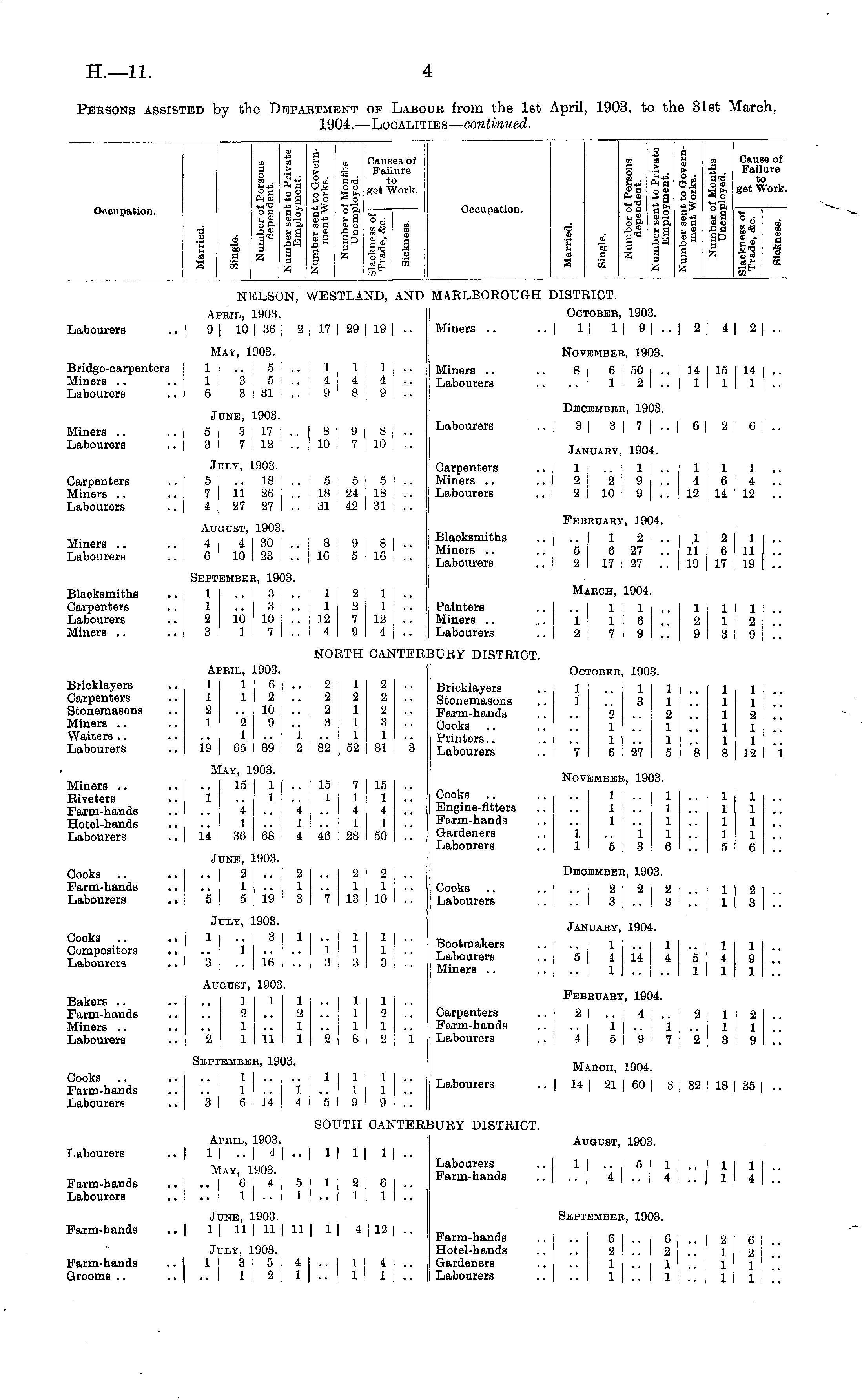 Occupation. co a o GO . *3,+= -? *=" ft © o a i- ® 0 a o © a w fl © "cv > ft a" 51 *s >» fl o ©.a CO ft 0 w jaw 3 B a H © > OS 4S O ©■a to a © a X " a a 55 CO X 43 . aa o © S >■ £ "o ft »H 3 © CD ■9 a as 3 A Caus Fail t. get V ies of lure o York. Occupation. fl o CO . Jh +j » fl ft © O fl 13 0> I 5 3 55 © 43 cd > ft a © S a o ©^3 CO ft ga J3H a 3 55 fl © Ss ° g i* ©"S tc a ©a a 3 55 co fl-d o © oft s-a © CD •2 a ao a 55 Caus Fail ti get V 36 of lure n o Vork, <6 © ■a © GO a x ©u %■% ai " SH Tib © fl M o X © i 2 © a x °cj s« 0 . fl ® o » .5 EH to co £ © S 3 in nelson, westland, and )N, MARLBOROUGH DISTRICT. April, 1903. Labourers .. | 9 | 10 [ 36 j 2 | 17 | 29 | 19 | .. l i I 2 October, 1903. Miners .. .. | 1] 1|9|..|2|4|2|.. May, 1903. November, 1903. Bridge-carpenters 1 .. 6 1.. 1 1 I 1 Miners .. .. 1 3 5 .. 4 ' 4 I 4 .. Labourers .. 6 8 I 81 I .. 9 ' 8 | 9 .. Miners .. .. 8 6 , 50 j .. I 14 I 15 I 14 | .. Labourers .. .. ll 2 I .. | 1 | 1 | 1 | .. June, 1903. Miners .. .. I 5 i 8 I 17 .. I 8 I 9 I 8 I .. Labourers .. | 3 I 7 ! 12 .. | 10 I 7 I 10 | .. December, 1903. Labourers .. | 3 | 8 | 7 | .. | 6 | 2 | 6 | .. January, 1904. July, 1903. Carpenters .. 5 ] .. 18 ..15 5 5 Miners .. .. 7 | 11 26 .. ! 18 24 18 .. Labourers .. 4 | 27 27 ..31 42 31 .. Carpenters ..J 1 I .. I 1 ..1.1 1 1 Miners .. .. 2 2 j 9 .. | 4 6 4 .. Labourers .. I 2 10 9 .. I 12 14 12 .. August, 1903. Miners .. .. I 4 4 I 80 I .. I 8 I 9 I 8 I .. Labourers .. I 6 10 | 23 I .. ' 16 5 I 16 I .. February, 1904. Blaoksmiths ..,.. 1 2 .. 1 2 1 .. Miners .. .. | 5 6 27 .. 11 6 11 .. Labourers .. I 2 17 27 .. 19 17 19 September, 1903. Blaoksmiths ... 1 .. 3.. 1 2 1 .. Carpenters ..! 1 .. 3 .. 1 2 1 .. Labourers .. 2 10 I 10 ... 12 7 12 Miners .. ..j 3 1 I 7 .. I 4 9 4.. March, 1904. Painters .. .. I Ills.. 1 11 Miners .. ... 1 ; 16.. 2 12.. Labourers .. 2 7 I 9 | .. 9 39 .. NORTH CANTER: :ter: 3URY DISTRICT. April, 1903. Bricklayers .. 1 1 ! 6 2 12.. Carpenters .. 1 1 2.. 2 2 2.. Stonemasons .. 2 10 2 1 2 .. Miners .. .. 1 2 9.. 8 1 3.. Waiters .. .. .. 1 .. 1 .. 1 1 .. Labourers .. 19 65 89 2 82 52 | 81 3 October, 1903. Bricklayers .. 1 .. 1 1 .. 1 1 .. Stonemasons .. 1 .. 3 1 .. 1 1 .. Farm-hands .. .. 2.. 2.. 1 2.. Cooks .. .. .. 1 .. 1 .. 1 1 .. Printers.. .. .. 1 .. 1 .. 1 1 .. Labourers .. 7 6 27 5 8 8 12 1 1 1 2 1 1 12 3 *8 i May, 1903. Miners 15 1 .. 15 7 15 .. Riveters .. 1 .. 1..1 1 1 .. Farm-hands .. .. 4.. 4.. 4 4.. Hotel-hands .. .. 1 .. 1 .. 1 1 .. Labourers .. 14 36 68 4 46 28 50 .. i 15 1 4 1 50 November, 1903. Cooks .. .. .. 1 .. 1 .. 1 1 .. Engine-fitters .. .. 1 .. 1 1 1 .. Farm-hands .. .. 1 .. 1 .. 1 1 ,. Gardeners .. 1 .. 1 1 .. 1 1 Labourers .. 1 5 3 6.. 5 6.. 14 June, 1903. Cooks .. .. .. 2 .. I 2 .. 2 2.. Farm-hands .. .. 1 ..il .. 1 1 Labourers .. 5 5 19 I 3 7 13 10 .. Ji December, 1903. Cooks .. ..j ... 21 21 2|..11121.. Labourers .. | ..I 8 | .. | 3..' 1 | 8 .. July, 1903. Cooks .. .. | 1 | .. 8 11 .. I 1 1 | .. Compositors .. .. 1 .. .. 1 1 1" [ .. Labourers .. 8 | .. 16 j .. 3 ! 3 3 .. January, 1904. Bootmakers .. .. 1 .. l .. j 1 1 Labourers .. 5 114 4 5J4 9.. Miners .. .. ..j 1 .. .. ill 1 August, 1903. Bakers .. ..I.. Ill 1 .. 1 1 .. Farm-hands .. .. 2 .. 2.. 1 2.. Miners .. .. I .. 1 I .. 1 .. 1 1 Labourers .. 2 1:1112821 February, 1904. Carpenters ..[ 2 .. I 4 j .. 2 1:2 Farm-hands .. .. 1 .. 1 .. 11 Labourers .. | 4 519 7 2 8 I 9 .. September, 1903. March, 1904. Cooks .. .. .. 1 I .. i .. 1 | 1 j 1 j .. Farm-hands .. .. 1..I 1 .. li 1 .. Labourers .. 3 6 i 14 | 4 5 I 9 I 9 .. Labourers .. | 14 | 21 | 60 | 3 | 32 | 18 | 35 | .. SOUTH canter: JURY DISTRICT. April 1903. Labourers .. | 1 | ..' | 4 | .. | 1 | 1 | 1 | .. May, 1903. Farm-hands ..j .. I 6 j 41 51 II 2 1 61.. Labourers ..I ..I 1 | .. I 1 I .. | ll it.. August, 1903. Labourers .. I 1 .. I 51 1 I .. I 1: 11.. Farm-hands ..[ .. | 4 I .. [ 4 I .. ) 1 | 4 .. June, 1903. Farm-hands .. | 1 | 11 | 11 | 11 | 1 | 4 | 12 | .. September, 1903. July, 1903. Farm-hands ..I II 31 51 4 I .. I II 4 | .. Grooms .. .. | .. | l|2|l|..|l|l|,. Farm-hands .. .. 6.. 6..|2 6. Hotel-hands .. .. 2 2.. 1 2 Gardeners .. .. 1 .. 1 .. 1 l Labourers .. .. 1 ., 1 ..1 1 '"