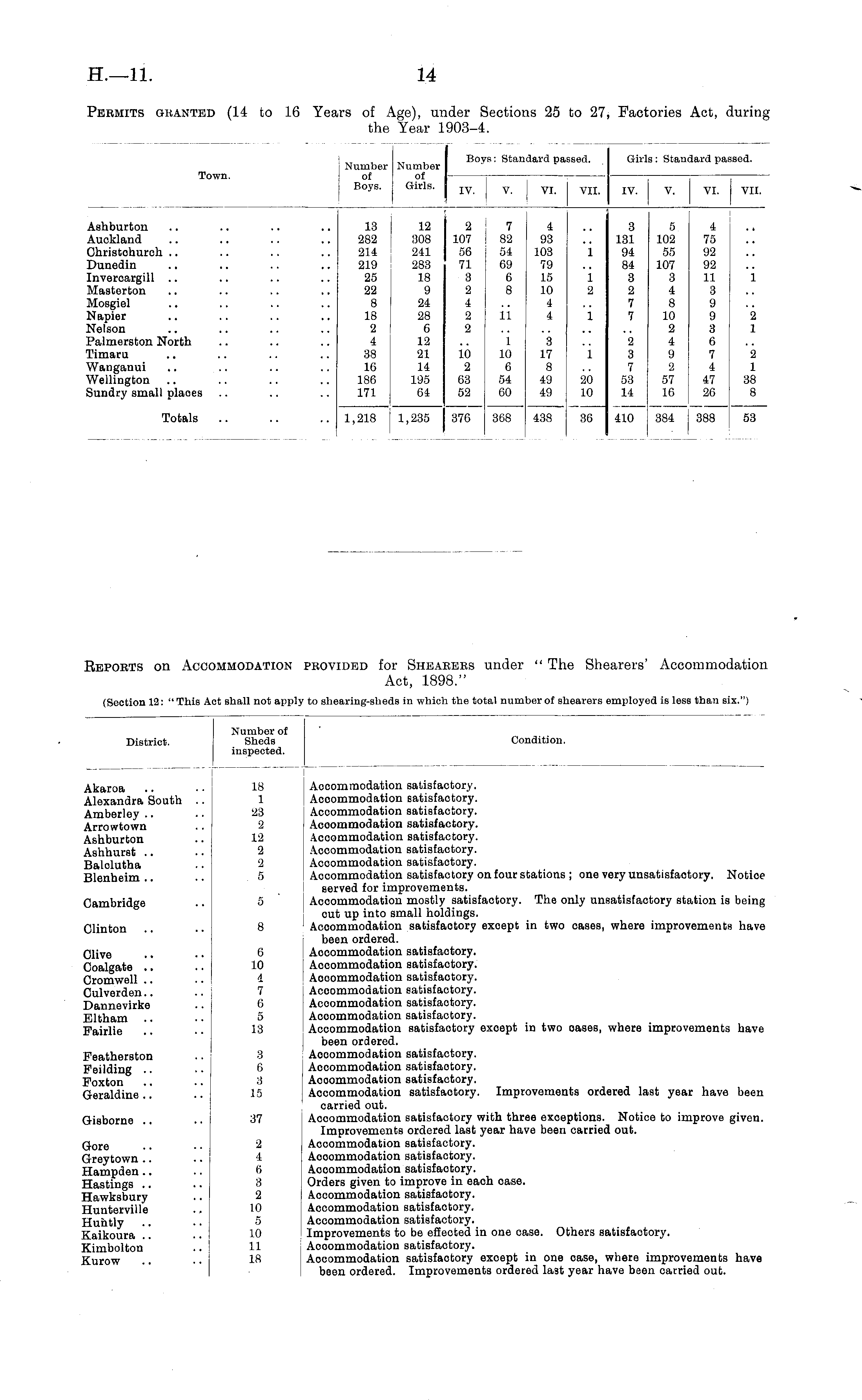 'ermits granted ( to Years of Age), un the Year 1 ler Sections 25 to '. 103-4. to 27 'actories .Ct, luring Town. Number Number of of Roys. Girls. Boys: Standard passed. Girls: Standard passed. IV. V. VI. VII. IV. V. VI. VII. Ashburton Auckland Christchurch .. Dunedin Invercargill .. Masterton Mosgiel Napier Nelson Palmerston North Timaru Wanganui Wellington Sundry small places 13 | 12 2 i 7 4 .. 3 5 4 282 308 107 I 82 93 .. 131 102 75 214 241 56 54 103 1 94 55 92 219 283 71 69 79 .. 84 107 92 25 18 3 6 15 1 3 3 11 1 22 9 2 8 10 2 2 4 3.. 8 24 4 .. 4 .. 7 8 9 18 ! 28 2 11 4 1 7 10 9 2 ...... 2 6 2 2 3 1 4 ' 12 .. 1 3 .. 2 4 6 38 21 10 10 17 1 3 9 7 2 16 14 2 6 8.. 7 2 4 1 186 195 63 54 49 20 53 57 47 38 ..171 64 52 60 49 10 14 16 26 8 13 282 214 219 25 22 8 18 2 4 38 16 186 171 12 308 241 283 18 9 24 28 6 12 21 14 195 64 2 107 56 71 3 2 4 2 2 7 82 54 69 6 8 ii 4 93 103 79 15 10 4 4 i i 2 i 10 2 63 52 l 10 6 54 60 3 17 8 49 49 l 20 10 Totals .. 1,218 1,235 376 368 438 36 410 384 388 | 53 438 36 Reports on Acco ommodation provided for Shearers under " The Shearers' Accommodation Act, 1898." (Section 12: "This Ac .ct shall not apply to shearing-sheds in which the total number of shearers employed is less than six.") District. Number of Sheds inspected. Condition. Akaroa Alexandra South Amberley .. Arrowtown Ashburton Ashhurst .. Balolutha Blenheim .. 18 1 23 2 12 2 2 5 Accommodation satisfactory. Accommodation satisfactory. Accommodation satisfactory. Aooommodation satisfactory. Accommodation satisfactory. Accommodation satisfactory. Accommodation satisfactory. Accommodation satisfactory on four stations ; one very unsatisfactory. Notioe served for improvements. Accommodation mostly satisfactory. The only unsatisfactory station is being cut up into small holdings. Aooommodation satisfactory exoept in two cases, where improvements have been ordered. Aooommodation satisfactory. Accommodation satisfactory. Aooommodation satisfactory. Accommodation satisfactory. Aooommodation satisfactory. Aooommodation satisfactory. Accommodation satisfactory except in two oases, where improvements have been ordered. Aooommodation satisfactory. Accommodation satisfactory. Aooommodation satisfactory. Accommodation satisfactory. Improvements ordered last year have been carried out. Accommodation satisfactory with three exceptions. Notice to improve given. Improvements ordered last year have been carried out. Accommodation satisfactory. Aooommodation satisfactory. Accommodation satisfactory. Orders given to improve in each case. Aooommodation satisfactory. Accommodation satisfactory. Accommodation satisfactory. Improvements to be effected in one case. Others satisfactory. Accommodation satisfactory. Aooommodation satisfactory exoept in one case, where improvements have been ordered. Improvements ordered last year have been carried out. Cambridge 5 Clinton 8 Olive Coalgate .. Cromwell .. Culverden.. Dannevirke Eltham .. Fairlie 6 10 4 7 6 5 18 Feathers ton Feilding .. Foxton Geraldine .. 3 6 3 15 Gisborne .. 37 Oore Greytown .. Hampden .. Hastings .. Hawksbury Hunterville Huhtly Kaikoura .. Kimbolton 2 4 6 3 2 10 5 10 11 18 JKurow