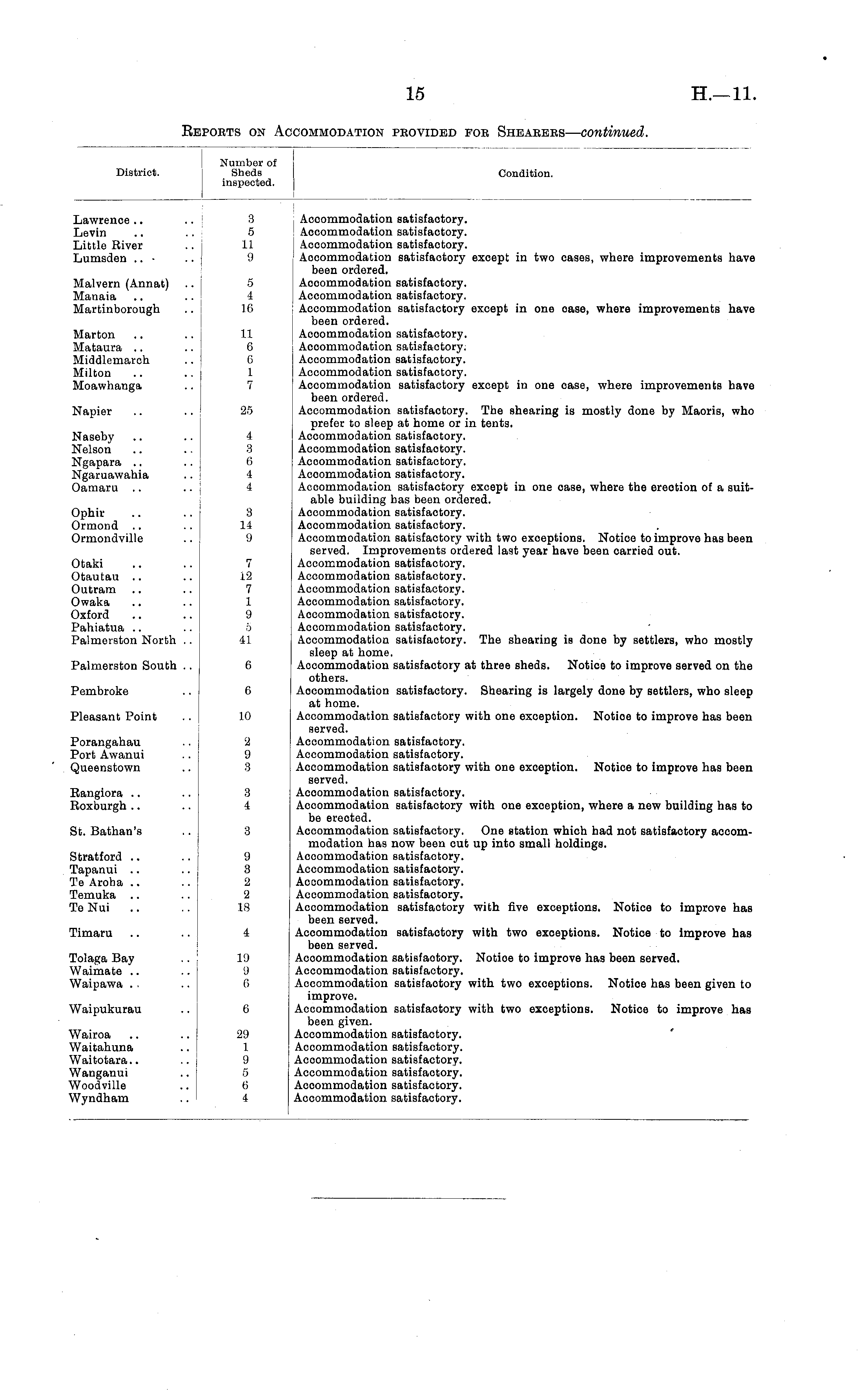 District. Number of Sheds inspected. Condition. Lawrence Levin Little River Lumsden .. - 3 5 11 9 Accommodation satisfactory. Accommodation satisfactory. Accommodation satisfactory. Accommodation satisfactory except in two cases, where improvements have been ordered. Aooommodation satisfactory. Accommodation satisfactory. Accommodation satisfactory except in one oase, where improvements have been ordered. Aooommodation satisfactory. Aooommodation satisfactory. Accommodation satisfactory. Accommodation satisfactory. Accommodation satisfactory except in one case, where improvements have been ordered. Accommodation satisfactory. The shearing is mostly done by Maoris, who prefer to sleep at home or in tents. Accommodation satisfactory. Accommodation satisfactory. Aooommodation satisfactory. Aooommodation satisfactory. Accommodation satisfactory except in one oase, where the ereotion of a suitable building has been ordered. Accommodation satisfactory. Accommodation satisfactory. Accommodation satisfactory with two exceptions. Notice to improve has been served. Improvements ordered last year have been carried out. Accommodation satisfactory. Accommodation satisfactory. Accommodation satisfactory. Accommodation satisfactory. Accommodation satisfactory. Accommodation satisfactory. Accommodation satisfactory. The shearing is done by settlers, who mostly sleep at home. Accommodation satisfactory at three sheds. Notioe to improve served on the others. Aooommodation satisfactory. Shearing is largely done by settlers, who sleep at home. Accommodation satisfactory with one exception. Notioe to improve has been served. Malvern (Annat) Manaia Martinborough 5 4 16 Marton Mataura .. Middlemarch Milton Moawhanga 11 6 6 1 7 Napier 25 Naseby Nelson Ngapara Ngaruawahia Oamaru 4 3 6 4 4 Ophir Ormond Ormondville 3 14 9 Otaki Otautau Outram Owaka Oxford Pahiatua Palmerston North .. 7 12 7 1 9 5 41 Palmerston South .. 6 Pembroke 6 Pleasant Point 10 Porangahau Port Awanui Queenstown 2 9 3 Accommodation satisfactory. Accommodation satisfactory. Accommodation satisfactory with one exception. Notice to improve has been served. Aooommodation satisfactory. Accommodation satisfactory with one exception, where a new building has to be ereoted. Accommodation satisfactory. One station which had not satisfactory accommodation has now been cut up into small holdings. Aooommodation satisfactory. Accommodation satisfactory. Accommodation satisfactory. Accommodation satisfactory. Accommodation satisfactory with five exceptions. Notice to improve has been served. Accommodation satisfactory with two exceptions. Notioe to improve has been served. Accommodation satisfactory. Notice to improve has been served. Accommodation satisfactory. Accommodation satisfactory with two exceptions. Notice has been given to improve. Accommodation satisfactory with two exceptions. Notice to improve has been given. Accommodation satisfactory. Accommodation satisfactory. Accommodation satisfactory. Accommodation satisfactory. Accommodation satisfactory. Accommodation satisfactory. Rangiora Roxburgh 3 4 St. Bathan's 3 Stratford Tapanui Te Aroha Temuka Te Nui 9 3 2 2 18 Timaru 4 Tolaga Bay Waimate Waipawa 19 9 6 Waipukurau 6 Wairoa Waitahuna Waitotara.. Wanganui Woodville Wyndham 29 1 9 5 6 4
