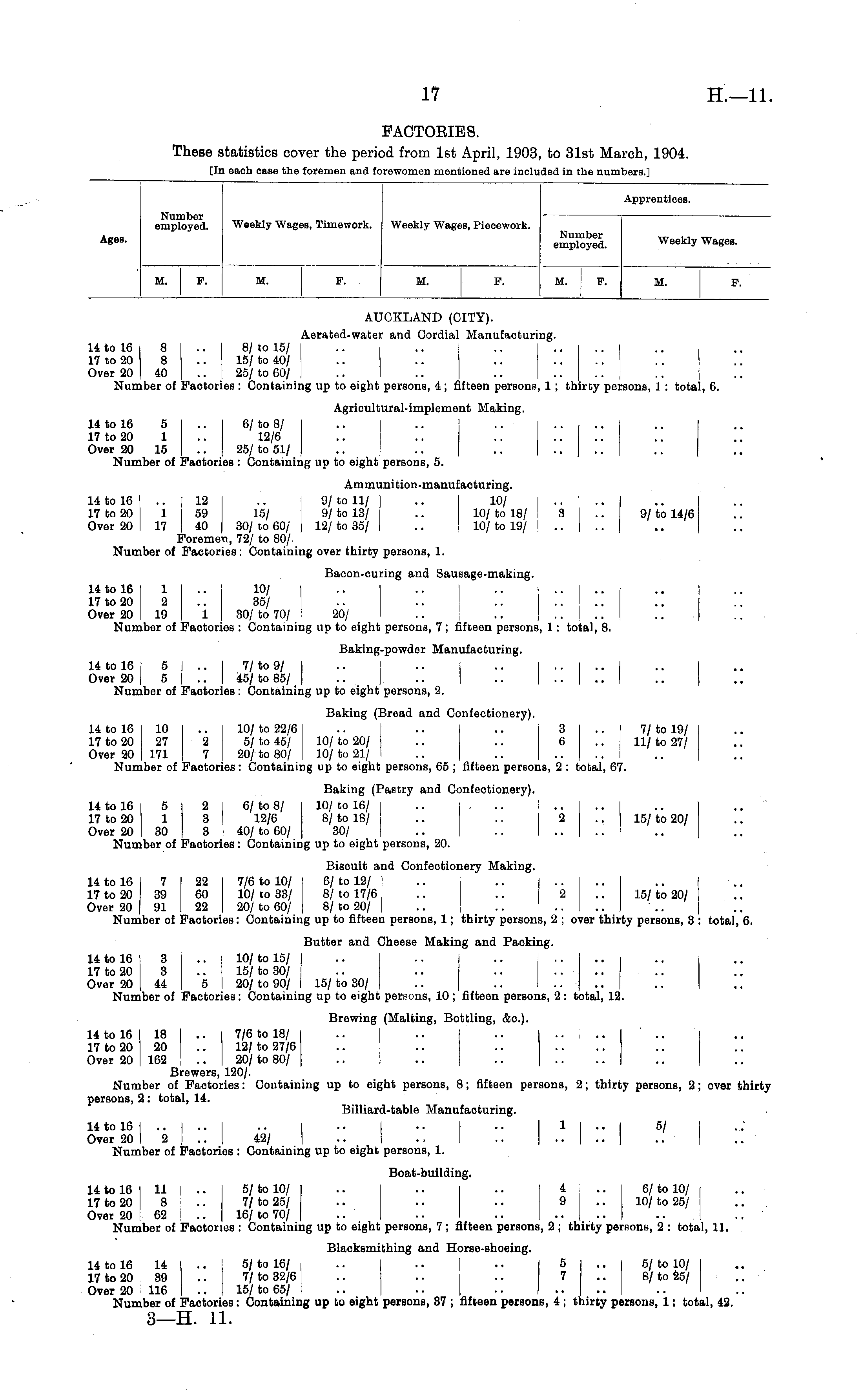 Apprentices. Number employed. Weekly Wages, Timework. Weekly Wages, Piecework. Ages. Number employed. Weekly Wages. M. F. M. P. M. E, M. F. M. F. AUCKLAND (CITY). Aerated-water and Cordial Manufacturing. 14 to 16 8 .. 8/ to 15/ | 17 to 20 8 .. 15/ to 40/ : Over 20 40 .. 25/ to 60/ Number of Factories: Containing up to eight persons, 4; fifteen persons, 1 ; thirty persons, 1 : total, 6. Agrioultural-implement Making. 14 to 16 5 .. 6/ to 8/ .. .. .. .. .. .. I 17 to 20 1 .. 12/6 .. .. .. .... Over 20 15 .. 25/ to 51/ Number of Faotories : Containing up to eight persons, 5. Ammunition-manufaoturing. 14 to 16 12 .. 9/ to 11/ .. 10/ .. j .. 17 to 20 1 59 15/ 9/ to 13/ .. 10/ to 18/ 3 .. 9/ to 14/6 Over 20 17 40 30/ to 60/ 12/ to 35/ .. 10/ to 19/ Foremen, 72/ to 80/. Number of Faotories: Containing over thirty persons, 1. Bacon-curing and Sausage-making. 14 to 16 I 1 .. 10/ I .. .. .. .. I .. 17 to 20 ' 2 35/ .. .. .. .... Over 20 19 1 30/ to 70/ 20/ Number of Faotories : Containing up to eight persons, 7 ; fifteen persons, 1 : total, 8. Baking-powder Manufacturing. 14 to 16 I 5 i .. I 7/ to 9/ I .. | .. j .. I .. I ' .. | .. I Over 20 | 5 | .. I 45/ to 85/ | .. .. .. .. | .. I Number of Faotories: Containing up to eight persons, 2. Baking (Bread and Confectionery). 14 to 16 I 10 .. 10/ to 22/6: .. .. .. 3 .. 7/ to 19/ 17 to 20 27 2 5/ to 45/ 10/ to 20/ .. .. 6 .. 11/ to 27/ Over 20 I 171 7 20/ to 80/ I 10/ to 21/ Number of Factories : Containing up to eight persons, 65 ; fifteen persons, 2 : total, 67. Baking (Pastry and Confectionery). 14 to 16 5 2 6/ to 8/ 10/ to 16/ .. I - • • • • • • • • I 17 to 20 1 3 12/6 8/ to 18/ .. .. 2 .. 15/ to 20/ Over 20 30 3 ! 40/ to 60/ 30/ .. I Number of Faotories: Containing up to eight persons, 20. Biscuit and Confectionery Making. 14 to 16 7 22 7/6 to 10/ 6/ to 12/ .. .. I .. 17 to 20 39 60 10/ to 33/ 8/ to 17/6 .. .. 2 .. 15/ to 20/ Over 20 91 22 20/ to 60/ 8/ to 20/ .. .. I .. Number of Factories: Containing up to fifteen persons, 1; thirty persons, 2 ; over thirty persons, 3 : total, 6. Butter and Cheese Making and Packing. 14 to 16 3 .. 10/to 15/ .. .. .. .. .. .. I 17 to 20 3 .. 15/ to 30/ Over 20 44 5 20/ to 90/ 15/ to 30/ Number of Factories : Containing up to eight persons, 10 ; fifteen persons, 2 : total, 12. Brewing (Malting, Bottling, &c). 14 to 16 I 18 .. 7/6 to 18/ 17 to 20 | 20 .. 12/ to 27/6 .. .. .. .... Over 20 I 162 .. 20/ to 80/ Brewers, 120/. Number of Factories: Containing up to eight persons, 8; fifteen persons, 2; thirty persons, 2; over Shirty persons, 2 : total, 14. Billiard-table Manufacturing. 14 to 16 I .. | .. I .. I • • I • • I •• I 1 I .. I 5/ I Over 20 I 2 | .. 42/ .. ., I .. .. | .. Number of Factories : Containing up to eight persons, 1. Boat-building. 14 to 16 I 11 .. 5/ to 10/ .. .. .. 4 .. 6/ to 10/ 17 to 20 8 .. 7/ to 25/ .. .. .. 9 .. 10/ to 25/ Over 20 i 62 .. 16/ to 70/ Number of Faotories : Containing up to eight persons, 7 ; fifteen persons, 2 ; thirty persons, 2 : total, 11. Blaoksmithing and Horse-shoeing. 14 to 16 14 .. 5/to 16/ .. .. .. 5 .. 5/to 10/ I 17 to 20 39 .. 7/ to 32/6 .. .. .. 7 .. 8/ to 25/ [ Over 20 116 .. 15/ to 65/ .. .. | Number of Faotories : Containing up to eight persons, 37 ; fifteen persons, 4 ; thirty persons, 1: total, 42. 3—H. 11.