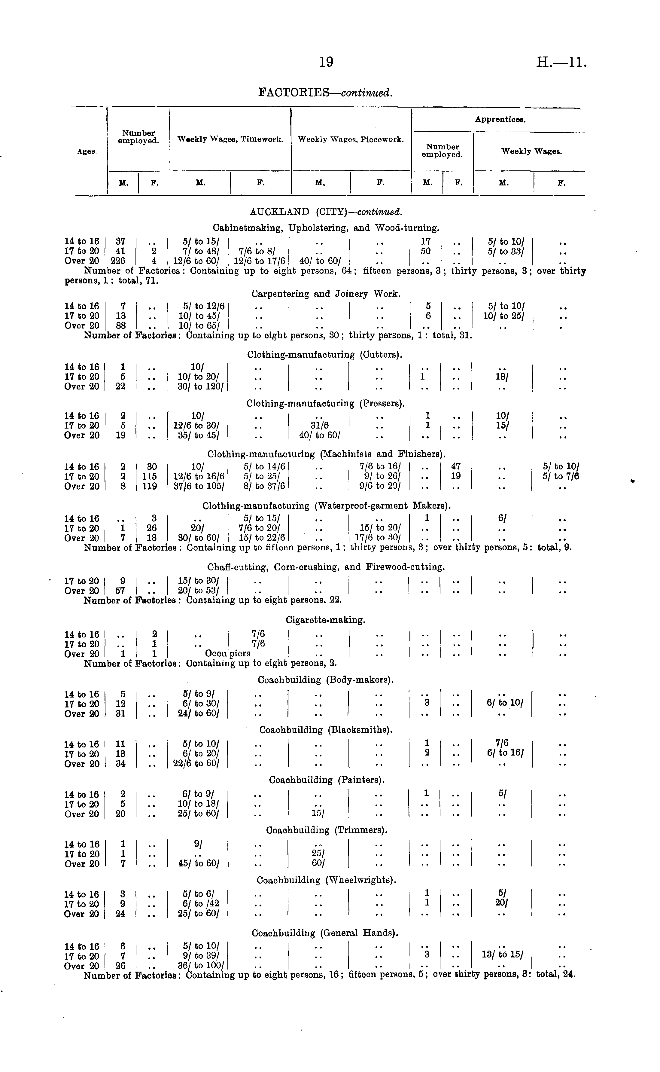 Number employed. Apprentices. Weekly Wages, Timework. Weekly Wages, Piecework. Ages. Number employed. Weekly Wages. II. F. M. F. M. F. I | M. F. M. F. AUCKLAND (CITY)—continued. Cabinetmaking, Upholstering, and Wood-turning. 'A to 16 I 37 .. j 5/ to 15/ .. .. .. 17 I .. 5/ to 10/ I .7 to 20 | 41 2 I 7/ to 48/ 7/6 to 8/ .. .. 50 ' .. 5/ to 33/ )ver 20 | 226 4 | 12/6 to 60/ 12/6 to 17/6 40/ to 60/ Number of Factories : Containing up to eight persons, 64; fifteen persons, 3 ; thirty persons, 3; over thirty jersons, 1 : total, 71. Carpentering and Joinery Work. L4 to 16 7 .. 5/ to 12/61 .. .. .. 5 .. I 5/ to 10/ L7 to 20 13 .. 10/ to 45/ .. .. .. 6 .. 10/ to 25/ 3ver 20 88 .. 10/ to 65/ I Number of Factories : Containing up to eight persons, 30 ; thirty persons, 1 : total, 31. Clothing-manufacturing (Cutters). 14 to 16 1 10/ .. .. .. .... L7 to 20 5 .. 10/ to 20/ .. .. .. 1 .. 18/ )ver 20 22 .. 30/ to 120/ .. .. .. .... Clothing-manufaoturing (Pressers). .4 to 16 2 10/ .. .. .. 1 .. 10/ .7 to 20 5 .. 12/6 to 30/ .. 31/6 .. 1 .. 15/ )ver 20 | 19 .. 35/ to 45/ .. 40/ to 60/ Clothing-manufacturing (Machinists and Finishers). .4 to 16 2 I 30 | 10/ 5/ to 14/6 .. 7/6 to 16/ 47 .. 5/ to 10/ .7 to 20 2 115 12/6 to 16/6 5/to 25/ .. 9/to 26/ .. 19 .. 5/to 7/6 )ver 20 8 I 119 I 37/6 to 105/ 8/ to 37/6 .. 9/6 to 29/ Clothing-manufacturing (Waterproof-garment Makers). :4tol6 .. 3 .. 5/to 15/ .. .. 1 .. 6/ .7 to 20 | 1 26 20/ 7/6 to 20/ .. 15/ to 20/ )ver 20 I 7 18 30/ to 60/ 15/ to 22/6 .. 17/6 to 30/ Number of Factories : Containing up to fifteen persons, 1; thirty persons, 3 ; over thirty persons, 5: total, 9. Chaff-cutting, Corn-orushing, and Firewood-cutting. .7 to 20 | 9 1 .. I 15/ to 30/ I .. I .. I .. I .. I .. I .. I )ver 20 I 57 I .. I 20/ to 53/ I .. .. .. I .. | .. | .. I Number of Faotories : Containing up to eight persons, 22. Cigarette-making. L4 to 16 .. 2 .. 7/6 .. .. .... L7 to 20 .. 1 .. 7/6 .. .. .... )ver 20 1 1 Ocou piers Number of Factories: Containing up to eight persons, 2. Coaohbuilding (Body-makers). : 4 to 16 5 .. 5/ to 9/ 17 to 20 12 .. 6/ to 30/ .. .. .. 3 .. 6/ to 10/ )ver 20 31 .. 24/ to 60/ Coaohbuilding (Blaoksmiths). .4 to 16 11 5/ to 10/ .. .. .. 1 .. 7/6 .7 to 20 13 .. 6/ to 20/ .. .. .. 2 .. 6/ to 16/ )ver 20 34 .. 22/6 to 60/ .. .. .. .. .... Coaohbuilding (Painters). .4 to 16 2 1.. 6/ to 9/ .. .. .. 1 .. 5/ .7 to 20 5 .. 10/ to 18/ )ver 20 20 I .. 25/ to 60/ .. 15/ Coaohbuilding (Trimmers). .4 to 16 1 | .. 9/ .. . - .. .... L7 to 20 1 I .. .. .. 25/ _)ver 20 7 .. 45/ to 60/ .. 60/ Coaohbuilding (Wheelwrights). .4 to 16 3 5/ to 6/ .. .. .. 1 .. 5/ .7 to 20 9 6/ to /42 .. .. .. 1 .. 20/ )ver 20 24 .. 25/ to 60/ Coaohbuilding (General Hands). 14 to 16 6 .. 5/ to 10/ .. i .. .. .. I .. .7 to 20 7 .. 9/ to 39/ .. .. .. 3 .. 13/ to 15/ )ver 20 26 .. 36/ to 100/ .. .. .. .... Number of Faotories: Containing up to eight persons, 16; fifteen persons, 5; over thirty persons, 3: total, 24.