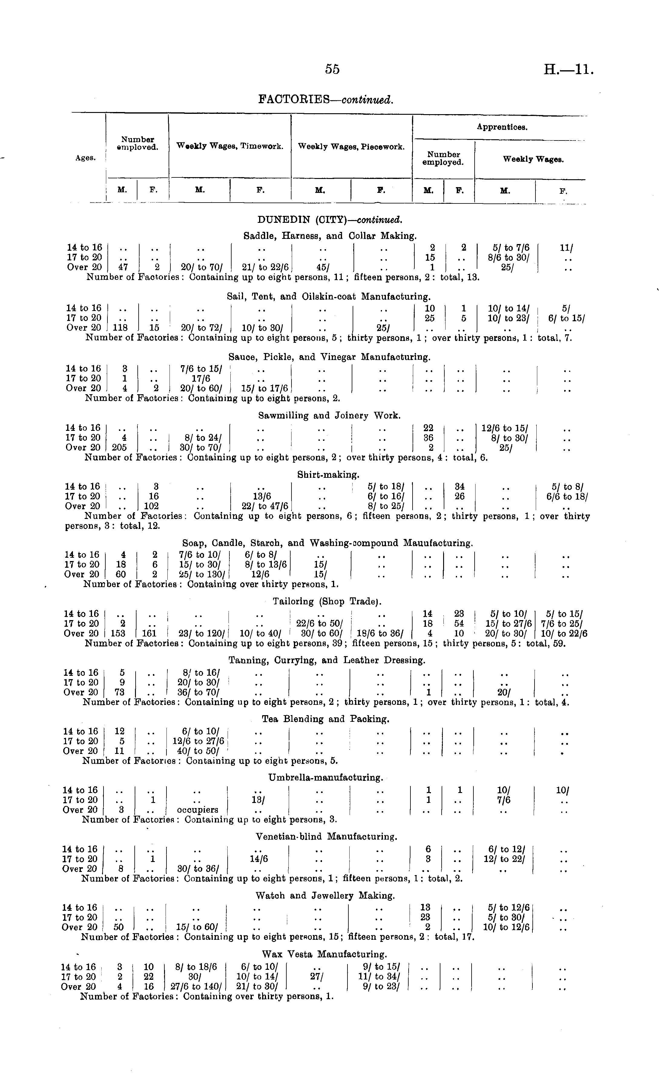 Number emploved. Ages. Apprentices. Weekly Wages, Timework. Weekly Wages, Piecework. Number employed. Weekly Wages. I M. I F. M. F. M. F. M. F. M. F. DUNEDIN (CITY)—continued. Saddle, Harness, and Collar Making. 14 to 16 .. .. .. .. .. .. 2 12 5/ to 7/6 11/ 17 to 20 .. .. .. .. .. .. 15 | .. 8/6 to 30/ Over 20 47 2 20/ to 70/ 21/ to 22/6 45/ .. 1 i .. 25/ Number of Faotories: Containing up to eight persons, 11; fifteen persons, 2 : total, 13. Sail, Tent, and Oilskin-coat Manufacturing. 14 to 16 I .. .. .. .. .. .. 10 1 10/ to 14/ 5/ 17 to 20 .. .. .. .. .. .. 25 5 10/ to 23/ : 6/ to 15/ Over 20 I 118 15 20/ to 72/ 10/ to 30/ .. 25/ Number of Faotories : Containing up to eight persons, 5 ; thirty persons, 1 ; over thirty persons, 1 : total, 7. Sauoe, Pickle, and Vinegar Manufacturing. 14 to 16 | 3 I 7/6 to 15/ .. .. .. [ .. .. .. I 17 to 20 I 1 .. 17/6 .. .. .. .... Over 20 i 4 2 j 20/ to 60/ j 15/ to 17/6 Number of Factories: Containing up to eight persons, 2. Sawmilling and Joinery Work. 14 to 16 .. .. .. .. .. I .. 22 I .. 12/6 to 15/ 17 to 20 4 .. 8/ to 24/ .. .. .. 36 j .. 8/to 30/ Over 20 205 .. i 30/ to 70/ .. .. .. 2 | .. 25/ Number of Factories : Containing up to eight persons, 2; over thirty persons, 4 : total, 6. Shirt-making. 14 to 16 : .. 3 .. .. .. 5/ to 18/ 34 .. 5/ to 8/ 17 to 20 .. 16 .. 13/6 .. 6/ to 16/ .. 26 .. 6/6 to 18/ Over 20 .. 102 .. 22/ to 47/6 .. 8/ to 25/ Number of Factories: Containing up to eight persons, 6 ; fifteen persons, 2 ; thirty persons, 1 ; over thirty persons, 3 : total, 12. Soap, Candle, Staroh, and Washing-compound Mauufacturing. 14 to 16 4 2 7/6 to 10/ 6/ to 8/ 17 to 20 18 6 15/ to 30/ 8/ to 13/6 15/ .. .... Over 20 60 2 25/ to 130/ 12/6 15/ .. .... Number of Factories : Containing over thirty persons, 1. Tailoring (Shop Trade). 14 to 16 I .. .. .. .. .. .. 14 23 i 5/ to 10/ 5/ to 15/ 17 to 20 I 2 .. .. .. 22/6 to 50/ .. 18 54 15/ to 27/6 7/6 to 25/ Over 20 I 153 161 23/ to 120/ ' 10/ to 40/ 30/ to 60/ 18/6 to 36/ 4 10 20/ to 30/ 10/ to 22/6 Number of Factories : Containing up to eight persons, 39 ; fifteen persons, 15 ; thirty persons, 5 : total, 59. Tanning, Currying, and Leather Dressing. 14 to 16 5 .. 8/ to 16/ 17 to 20 9 .. 20/ to 30/ Over 20 73 .. 36/ to 70/ .. .. .. 1 .. 20/ Number of Factories : Containing up co eight persons, 2 ; thirty persons, 1; over thirty persons, 1: total, 4. Tea Blending and Paoking. 14 to 16 | 12 I .. 6/ to 10/ .. .. .. .. .. I 17 to 20 5 .. 12/6 to 27/6 .. .. .. .... Over 20 | 11 i .. 40/to 50/ Number of Factories : Containing up to eight persons, 5. Umbrella-manufaoturing. 14 to 16 .... .. .. .. .. 11 10/ 10/ 17 to 20 .. 1 .. 13/ .. .. 1 .. 7/6 Over 20 3 .. occupiers Number of Factories : Containing up to eight persons, 3. Venetian-blind Manufacturing. 14 to 16 .. .. .. | .. .. .. | 6 .. 6/ to 12/ 17 to 20 .. 1 .. 14/6 .. .. 3 .. 12/ to 22/ Over 20 8 .. 30/ to 36/ ( Number of Factories: Containing up to eight persons, 1; fifteen persons, 1: total, 2. Watoh and Jewellery Making. 14 to 16 : .. .. .. .. .. .. I 13 .. 5/ to 12/6 17 to 20 .. .. .. .. .. 23 .. 5/ to 30/ Over 20 , 50 .. 15/ to 60/ .. .. .. 2 .. 10/ to 12/6 Number of Factories : Containing up to eight persons, 15; fifteen persons, 2 : total, 17. Wax Vesta Manufacturing. 14 to 16 3 | 10 8/ to 18/6 6/ to 10/ .. 9/ to 15/ j .. 17 to 20 2 1 22 30/ 10/ to 14/ 27/ 11/ to 84/ .. Over 20 4 I 16 27/6 to 140/ 21/ to 30/ .. 9/ to 23/ I .. Number of Faotories: Containing over thirty persons, 1.