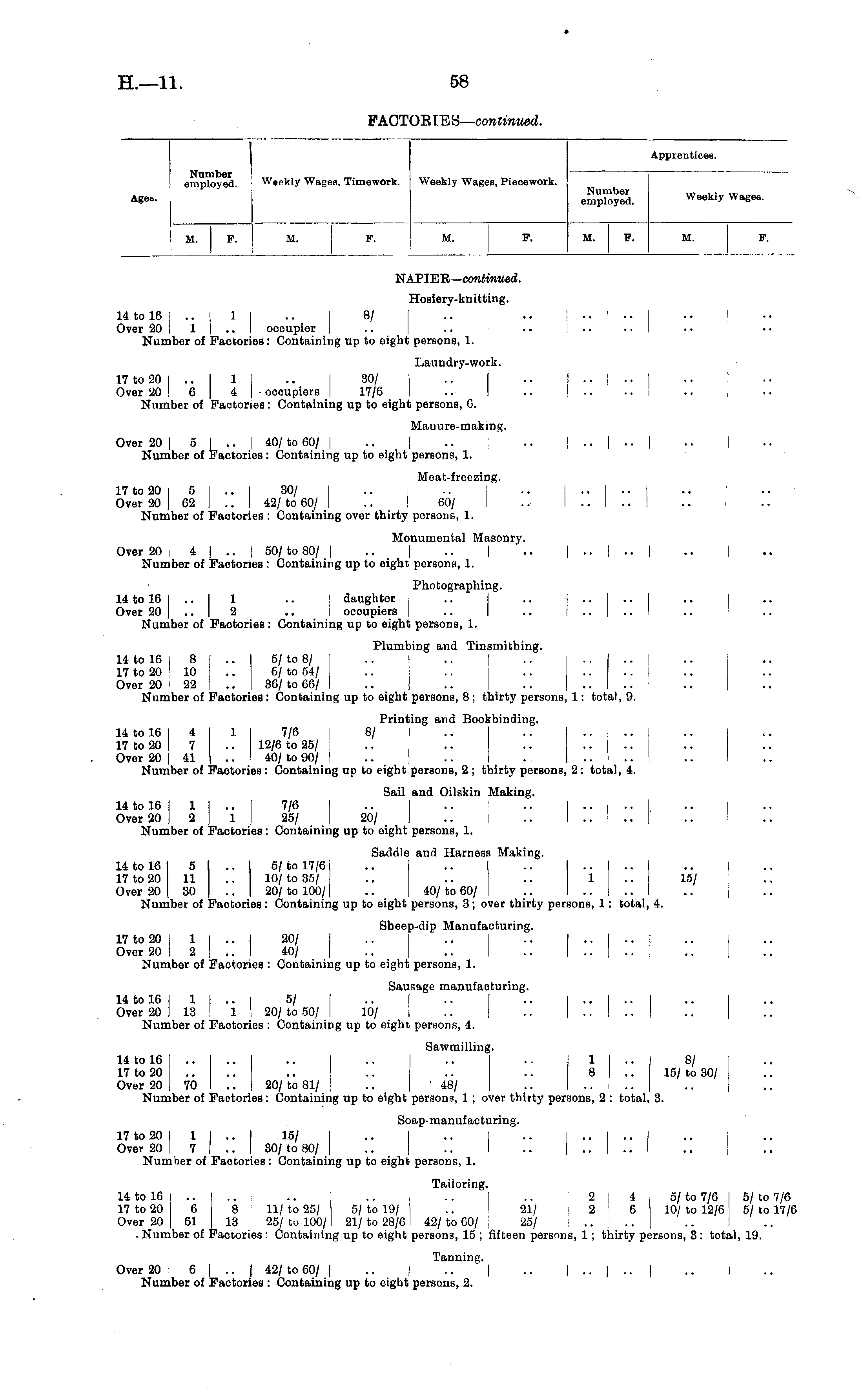 Number employed. Weekly Wages, Timework. Apprentices. Weekly Wages, Piecework. Age». Number employed. Weekly Wages. I I M. F. M. P. M, F. M. F. M. P. NAPIER— continued. Hosiery-knitting. 14 to 16 I .. I 1 I .. j 8/ I .. .. .. 1 .. I Over 20 I 1 | .. oooupier I Number of Faotories: Containing up to eight persons, 1. Laundry-work. 17 to 20 I .. I 1 I .. j 30/ I .. .. Over 20 ! 6 | 4 | ■ occupiers I 17/6 .. .. Number of Faotories: Containing up to eight persons, 6. Manure-making. Over 20 | 5 | .. | 40/ to 60/ | .. | .. | .. | .. | .. | .. | Number of Factories: Containing up to eight persons, 1. Meat-freezing. 17 to 20 I 5 I .. | 30/ I .. .. .. .. I .. | .. | Over 20 ) 62 | .. I 42/ to 60/ I .. I 60/ I .. I .. ! .. I Number of Factories : Containing over thirty persons, 1. Monumental Masonry. Over 20 l 4 | .. | 50/ to 80/ | .. | .. | .. | .. | .. | .. | Number of Factories : Containing up to eight persons, 1. Photographing. 14 to 16 j .. I 1 .. daughter j Over 20 | .. I 2 .. occupiers | .. .. I .. Number of Factories: Containing up to eight persons, 1. Plumbing and Tinsmithing. 14 to 16 j 8 .. I 5/ to 8/ 17 to 20 ' 10 .. 6/ to 54/ Over 20 I 22 .. : 36/ to 66/ .. .. .. .. | .. Number of Factories: Containing up to eight persons, 8; thirty persons, 1: total, 9. Printing and Bookbinding. 14 to 16 4 1 7/6 i 8/ I .. .. .. .. | 17 to 20 I 7 .. 12/6 to 25/ .. .. .. .... Over 20 | 41 .. 40/ to 90/ Number of Factories: Containing up to eight persons, 2 ; thirty persons, 2: total, 4. Sail and Oilskin Making. 14 to 16 I 1 j .. 7/6 .. .. .. I .. I .. I .. | Over 20 I 2 I 1 | 25/ 20/ I .. .. I .. I .. | .. I Number of Factories : Containing up to eight persons, 1. Saddle and Harness Making. 14 to 16 5 .. 5/ to 17/6 .. .. .. .... 17 to 20 11 .. 10/ to 35/ .. .. .. 1 .. 15/ Over 20 30 .. 20/to 100/ .. 40/to 60/ Number of Factories: Containing up to eight persons, 3; over thirty persons, 1: total, 4. Sheep-dip Manufacturing. 17 to 20 1 1 | .. I 20/ .. .. .. I .. I .. I Over 20 I 2 I .. | 40/ Number of Factories : Containing up to eight persons, 1. Sausage manufacturing. 14 to 16 I 1 I .. I 5/ .. .. .. I .. I .. I .. I Over 20 I 13 | 1 I 20/ to 50/ I 10/ | Number of Factories : Containing up to eight persons, 4. Sawmilling. 14 to 16 .. .. I .. I .. .. .. 1 .. | 8/ 17 to 20 .. .. .. .. .. 8 .. 15/ to 30/ Over 20 70 .. S 20/ to 81/ .. 48/ Number of Faotories: Containing up to eight persons, 1 ; over thirty persons, 2 : total, 3. Soap-manufacturing. 17 to 20 I 1 | .. I 15/ I .. I .. [ .. I .. I .. | .. I Over 20 | 7 I .. I 30/ to 80/ I .. .. I .. ..!..' Number of Factories: Containing up to eight persons, 1. Tailoring. 14 to 16 I .. .. .. .. .. .. I 2 j 4 5/ to 7/6 I 5/ to 7/6 17 to 20 | 6 8 11/to 25/ 5/to 19/ I .. 21/ 2:6 10/to 12/6 1 5/to 17/6 Over 20 | 61 13 25/ to 100/ 21/ to 28/6 : 42/ to 60/ \ 25/ - Number of Factories : Containing up to eight persons, 15 ; fifteen persons, 1 ; thirty persons, 3 : total, 19. Tanning. Over 20 I 6 | .. | 42/ to 60/ | .. , .. | .. | ..{.... ,| .. I Number of Factories : Containing up to eight persons, 2.