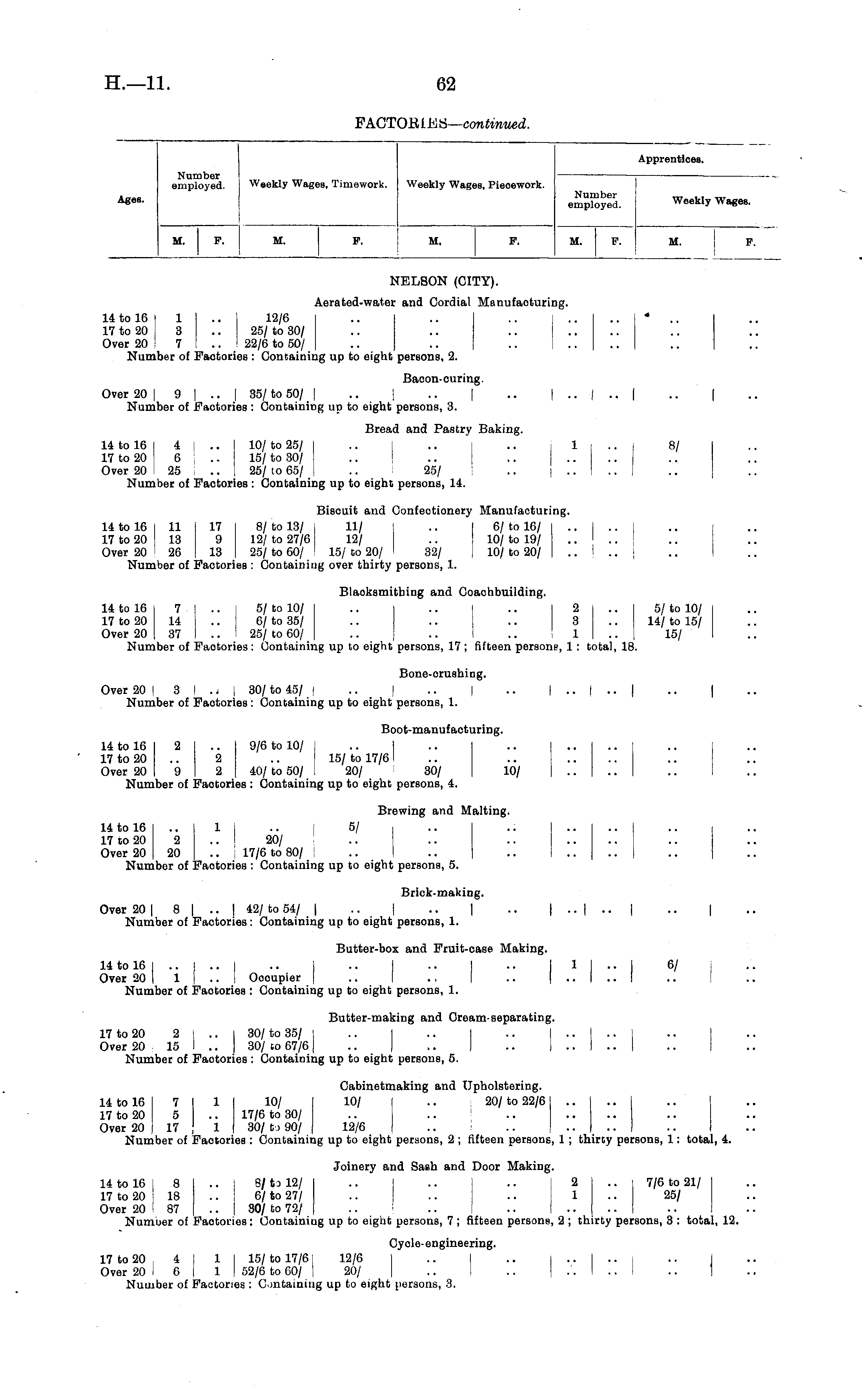 Number employed. Weekly Wages, Timework. Weekly Wages, Piecework. Apprentices. Ages. Number employed. Weekly Wages. M. F. M. F. M. F. M. F. M. F. NELSON (CITY). Aerated-water and Cordial Manufacturing. 14 to 16 | 1 .. I 12/6 .. .. .. | .. .. I * .. 17 to 20 | 3 .. I 25/ to 30/ Over 20 7 .. 22/6 to 50/ .. .. .. Number of Faotories : Containing up to eight persons, 2. Bacon-curing. Over 20 j 9 | .. | 35/ to 50/ | .. | .. [ .. j .. | .. | .. | Number of Factories : Containing up to eight persons, 3. Bread and Pastry Baking. 14 to 16 4 .. 10/ to 25/ .. .. .. 1 .. 8/ 17 to 20 6 .. 15/ to 30/ Over 20 25 .. 25/ to 65/ .. 25/ Number of Factories : Containing up to eight persons, 14. Biscuit and Confectionery Manufacturing. 14 to 16 I 11 i 17 8/ to 13/ | 11/ .. I 6/ to 16/ 17 to 20 13 I 9 12/ to 27/6: 12/ .. 10/ to 19/ .. Over 20 26 i 13 25/ to 60/ : 15/ to 20/ 32/ I 10/ to 20/ .. I .. Number of Factories : Containing over thirty persons, 1. Blaoksmithing and Coachbuilding. 14 to 16 7 .. 5/ to 10/ .. .. .. I 2 I .. 5/ to 10/ 17 to 20 14 .. 6/ to 35/ .. .. .. 8 .. 14/ to 15/ Over 20 37 .. 25/ to 60/ .. .. .. ! 1 | .. 15/ Number of Faotories: Containing up to eight persons, 17 ; fifteen persons, 1 : total, 18. Bone-orushiog. Over 20 | 3 : .. j 30/ to 45/ [ .. | .. | .. | .. | .. | .. | Number of Factories : Containing up to eight persons, 1. Boot-manufacturing. 14 to 16 2 .. I 9/6 to 10/ | .. I .. .. | .. 17 to 20 .. 2 .. 15/ to 17/6 Over 20 9 2 | 40/ to 50/ I 20/ 30/ 10/ .... Number of Faotories : Containing up to eight persons, 4. Brewing and Malting. 14 to 16 .. 1 i .. 5/ 17 to 20 2 20/ .. .. .. .... Over 20 20 .. : 17/6 to 80/ Number of Factories : Containing up to eight persons, 5. Brick-making. Over 20 | 8 | .. | 42/ to 54/ | .. | .. | .. | .. | .. | .. | Number of Factories: Containing up to eight persons, 1. Butter-box and Fruit-case Making. 14 to 16 I .. I .. | .. I .. .. I .. 1 | .. I 6/ Over 20 I 1 | .. I Occupier | .. ., .. .. |l .. I Number of Faotories : Containing up to eight persons, 1. Butter-making and Cream-separating. 17 to 20 2 ... | 30/ to 35/ I .. | .. I .. .. I .. I .. I Over 20 15 I .. j 30/ to 67/61 .. ,. .. .. I .. Number of Factories : Containing up to eight persons, 5. Cabinetmaking and Upholstering. 14 to 16 7 1 11 10/ 10/ .. 20/ to 22/6 .. I .. I 17 to 20 5 .. 17/6 to 30/ .. .. .. .. .. | Over 20 17 ] 1 I 30/ to 90/ 12/6 .. .. .. I .. I Number of Factories : Containing up to eight persons, 2 ; fifteen persons, 1 ; thirty persons, 1: total, 4. Joinery and Sash and Door Making. 14 to 16 I 8 .. 8/ to 12/ .. I .. .. 12 .. 7/6 to 21/ 17 to 20 : 18 .. 6/ to 27/ .. .. .. 1 .. 25/ Over 20 . 87 .. 30/ to 72/ Number of Factories: Containing up to eight persons, 7 ; fifteen persons, 2 ; thirty persons, 3 : total, 12. Cycle-engineering. 17 to 20 4 1 11 15/ to 17/61 12/6 I .. .. I ..[-.. i .. j Over 20 I 6 | 1 | 52/6 to 60/ I 20/ .. .. .... Number of Factories : Containing up to eight persons, 3.