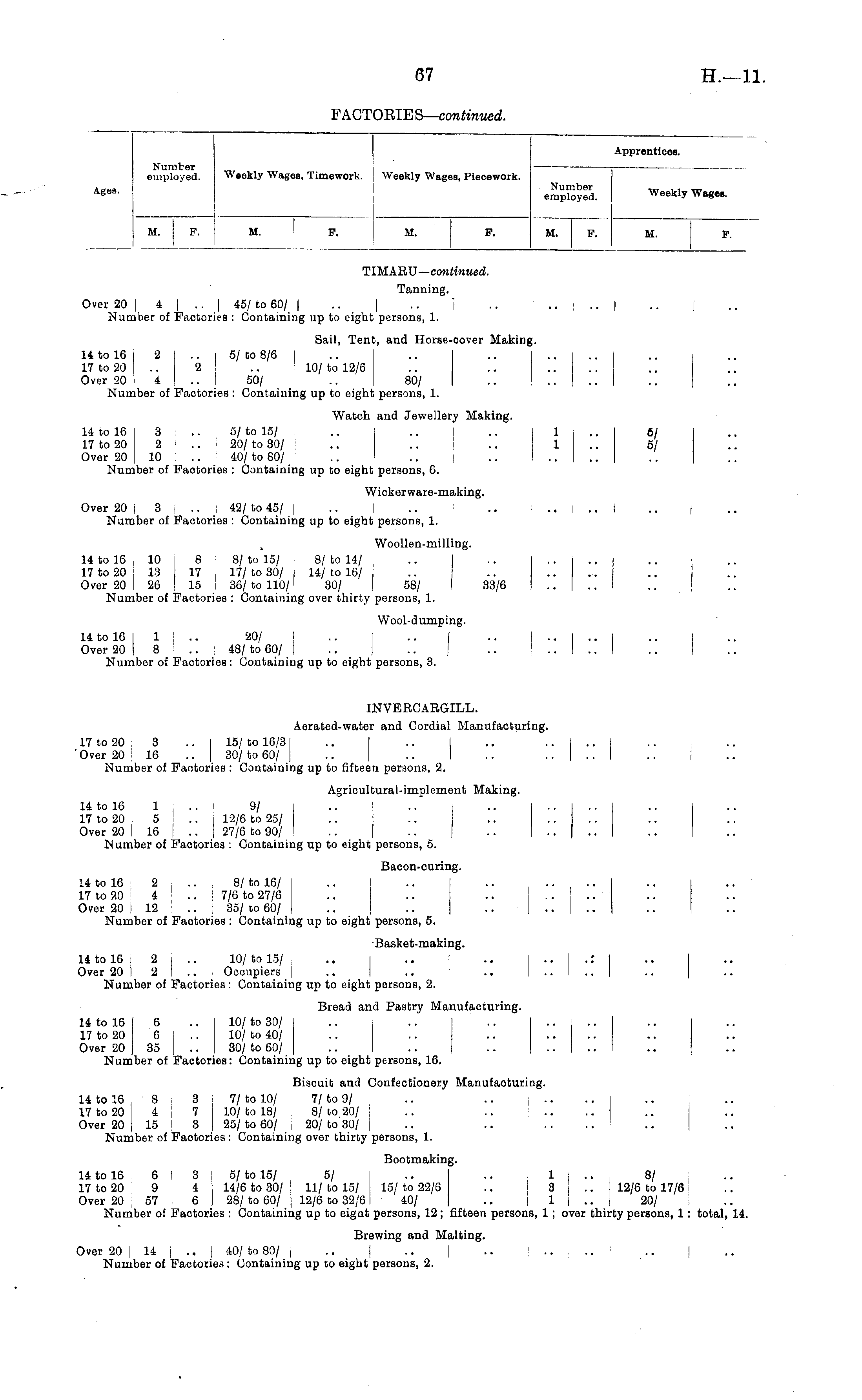 Number employed. Weekly Wages, Timework. Ages. Weekly Wages, Piecework. Number employed. Apprentices. Weekly Wages. M. F. M. F. M. P. M. P. M P. TIMARU— continued. Tanning. Over 20 | 4 | .. | 45/ to 60/ | .. | .. .. | Number of Factories : Containing up to eight persons, 1. Sail, Tent, and Horse-cover Making. 14 to 16 1 2 j .. I 5/ to 8/6 17 to 20 .. 2 1 .. 10/ to 12/6 Over 20 I 4 I .. 50/ .. 80/ .. .... Number of Factories : Containing up to eight persons, 1. Watch and Jewellery Making. 14 to 16 I 8 i .. 5/ to 15/ .. I .. .. 1 .. 5/ 17 to 20 2 ■ .. 20/ to 30/ .. .. .. 1 .. 5/ Over 20 | 10 I .. 40/ to 80/ Number of Faotories : Containing up to eight persons, 6. Wickcrware-making. Over 20 , 3 | ... 42/ to 45/ [ .. .. .. I .. | .. I Number of Factories : Containing up to eight persons, 1. Woollen-milling. 14 to 16 , 10 8 8/ to 15/ 8/ to 14/ | 17 to 20 | 13 17 17/ to 30/ 14/ to 16/ Over 20 I 26 15 36/ to 110/ 30/ 58/ 33/6 Number of Factories : Containing over thirty persons, 1. Wool-dumping. 14 to 16 I 1 I .. 20/ .. I .. | .. | .. I .. j .. I Over 20 I 8 i .. | 48/ to 60/ i .. .. .. .. I .. I Number of Factories: Containing up to eight persons, 3. INVERCARGILL. Aerated-water and Cordial Manufacturing. 17 to 20 ; 3 .. [ 15/ to 16/31 .. I .. I .. .. I .. I Over 20 I 16 | 30/ to 60/ J .. .. .. .. .. I Number of Faotories : Containing up to fifteen persons, 2. Agricultural-implement Making. 14 to 16 1 , .. 9/ | .. .. .. I .. .. .. j 17 to 20 5 .. 12/6 to 25/ | Over 20 I 16 j .. j 27/6 to 90/ | .. .. .. I .. Number of Factories : Containing up to eight persons, 5. Bacon-curing. 14 to 16 2 .. 8/ to 16/ 17 to 20 4 .. 7/6 to 27/6 .. .. .. .... Over 20 , 12 j ... 35/ to 60/ Number of Faotories : Containing up to eight persons, 5. Basket-making. 14 to 16: 2 1 .. 10/ to 15/ I .. I j .. .: I Over 20 I 2 i .. | Occupiers | .. .. .. .... Number of Factories: Containing up to eight persons, 2. Bread and Pastry Manufacturing. 14 to 16 6 .. 10/ to 30/ 17 to 20 6 .. 10/ to 40/ Over 20 35 .. 30/ to 60/ Number of Factories: Containing up to eight persons, 16. Biscuit and Confectionery Manufacturing. 14 to 16 8 3 7/ to 10/ . 7/ to 9/ .. .. 17 to 20 I 4 j 7 10/ to 18/ . 8/ to 20/ : Over 20 | 15 ] 3 1 25/ to 60/ , 20/ to 30/ Number of Factories: Containing over thirty persons, 1. Bootmaking. 14 to 16 6 I 3 5/ to 15/ 5/ .. .. 1 .. 8/ 17 to 20 9 4 14/6 to 30/ 11/ to 15/ 15/ to 22/6 .. 8 .. 12/6 to 17/6 Over 20 57 I 6 28/ to 60/ 12/6 to 32/6 40/ .. 1 | ., 20/ Number of Factories : Containing up to eigut persons, 12 ; fifteen persons, 1 ; over thirty persons, 1: total, 14. Brewing and Malting. Over 20 | 14 j .. j 40/ to 80/ | .. | .. | .. | .. | .. I Number of Factories: Containing up to eight persons, 2.