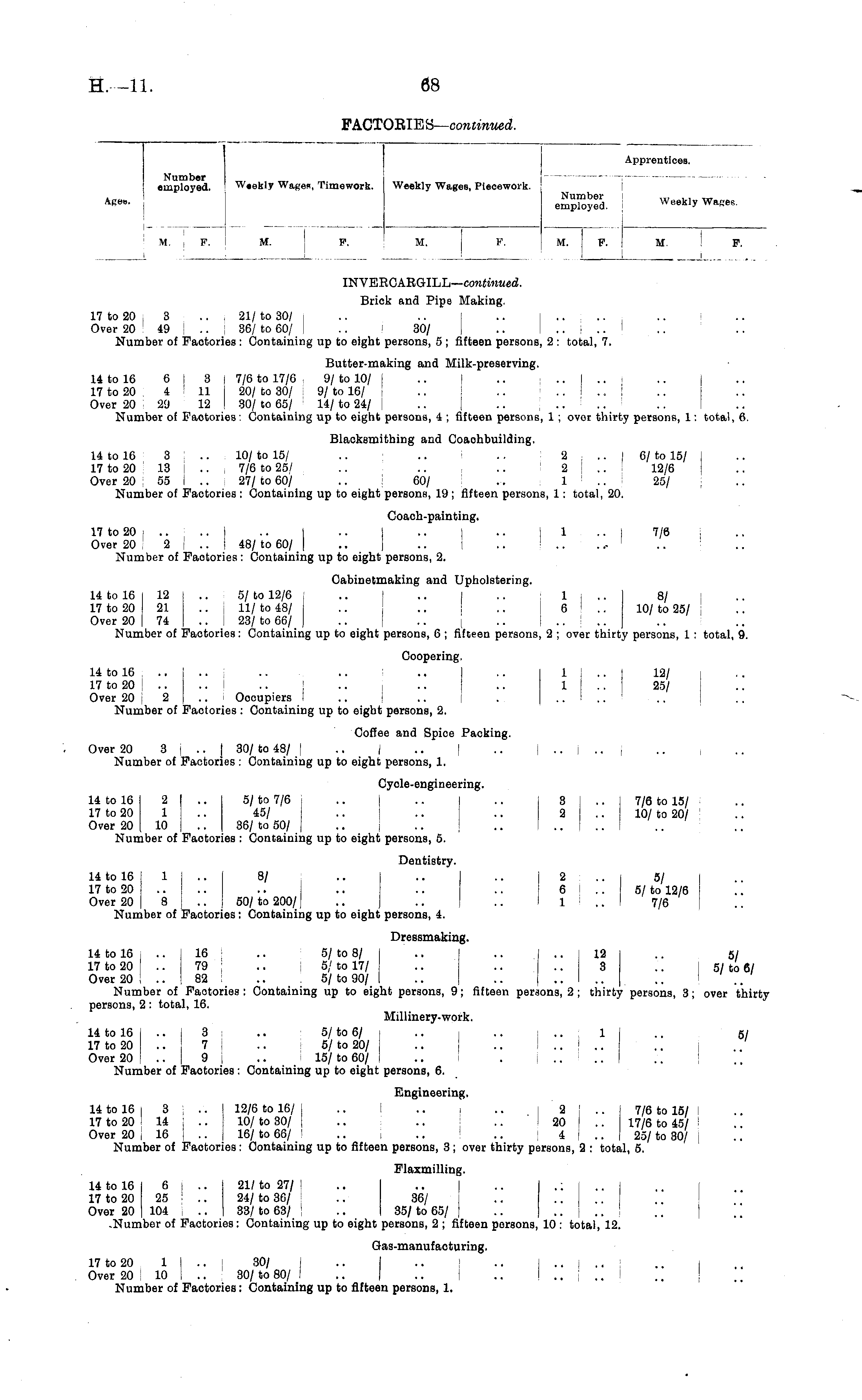 Ages. Number employed. Weekly Wages, Timework. M. i F. M. F. Weekly Wages, Piecework. M. P. Number employed. M. F. Apprentices. Weekly Wases. M. F I M. F. M. F. M. P. M. F. | M. F. INVERCARGILL— continued. Brick and Pipe Making. 17 to 20 .3 .. 21/ to 30/ Over 20 ! 49 .. 36/ to 60/ .. 30/ .. Number of Factories : Containing up to eight persons, 5 ; fifteen persons, 2 : total, 7. Butter-making and Milk-preserving. 14 to 16 6 ! 3| 7/6 to 17/6 9/ to 10/ • .. .. .. I .. I 17 to 20 4 11 j 20/ to 30/ 9/ to 16/ Over 20 29 12 I 30/ to 65/ 14/ to 24/ Number of Faotories : Containing up to eight persons, 4 ; fifteen persons, 1 ; over thirty persons, 1: total, 6. Blacksmithing and Coaohbuilding. 14 to 16 3 10/ to 15/ .. .. .. 2 ... | 6/ to 15/ I 17 to 20 13 ! ... 7/6 to 25/ .. .. .. 2 | .. 12/6 Over 20 : 55 i .. : 27/ to 60/ .. 60/ .. 1 ! .. 25/ Number of Factories : Containing up to eight persons, 19 ; fifteen persons, 1: total, 20. Coaoh-painting. 17 to 20 .. .. I .. I .. I .. .. II .. I 7/6 Over 20 2 i .. j 48/ to 60/ | Number of Faotories : Containing up to eight persons, 2. Cabinetmaking and Upholstering. 14 to 16 12 .. 5/ to 12/6 .. .. I .. 1 : .. 8/ 17 to 20 21 .. : 11/to 48/ .. .. .. 6 ! .. 10/to 25/ Over 20 74 .. i 23/ to 66/ Number of Factories: Containing up to eight persons, 6 ; fifteen persons, 2 ; over thirty persons, 1 : total, 9. Coopering. 14 to 16 .. .. .. .. .. I .. 1 .. 12/ 17 to 20 : .. .. .. .. .. .. 1 .. 25/ Over 20 2 .. Oocupiers I Number of Factories : Containing up to eight persons, 2. Coffee and Spice Packing. Over 20 3 | .. J 30/ to 48/ j .. | .. .. ... Number of Factories : Containing up to eight persons, 1. Cycle-engineering. 14 to 16 2 1.. 5/ to 7/6 i .. .. I .. 3 .. 7/6 to 15/ 17 to 20 1 .. 45/ .. .. .. 2 .. 10/ to 20/ ' Over 20 10 | .. 36/ to 50/ | Number of Factories : Containing up to eight persons, 5. Dentistry. 14 to 16 I 1 j .. 8/ .. .. .. 2 .. 5/ 17 to 20 .. .. .. .. .. .. 6 5/ to 12/6 Over 20 j 8 | .. 50/ to 200/ .. .. .. 1 7/6 Number of Factories: Containing up to eight persons, 4. Dressmaking. 14 to 16 ,.. I 16 ... 5/ to 8/ .. .. | .. 12 .. 5/ 17 to 20 .. I 79 .. 5/ to 17/ .. .. .. 3 .. 5/ to 6/ Over 20 .. : 82 .. 5/ to 90/ .. .. .. .. .. Number of Factories : Containing up to eight persons, 9; fifteen persons, 2 ; thirty persons, 3; over thirty persons, 2 : total, 16. Millinery-work. 14 to 16 3 .. 5/to 6/ I .. .. | .. 1 .. 5/ 17 to 20 .. 7 : .. 5/ to 20/ I Over 20 9 | .. 15/ to 60/ Number of Factories : Containing up to eight persons, 6. Engineering, 14 to 16 i 3 .. 12/6 to 16/ .. .. .. I 2 I .. 7/6 to 15/ 17 to 20 i 14 ; .. 10/ to 30/ j .. .. .. 20 I .. 17/6 to 45/ Over 20 i 16 | .. 16/ to 66/ .. .. .. 4 i .. 25/ to 30/ , Number of Faotories: Containing up to fifteen persons, 3 ; over thirty persons, 2 : total, 5. Flaxmilling. 14 to 16 6 ■ .. 21/ to 27/ .. .. .. I .. I .. I 17 to 20 25 .. 24/ to 36/ .. 36/ .. Over 20 104 .. 33/ to 63/ .. 35/ to 65/ j .. -Number of ITaotories: Containing up to eight persons, 2 ; fifteen persons, 10 : total, 12. Gas-manufaoturiDg. 17 to 20 1 I .. I 30/ I .. I .. .. I .. i .. .. 1 Over 20 10 I .. 30/ to 80/ I .. | .. .. Number of Faotories: Containing up to fifteen persons, 1.