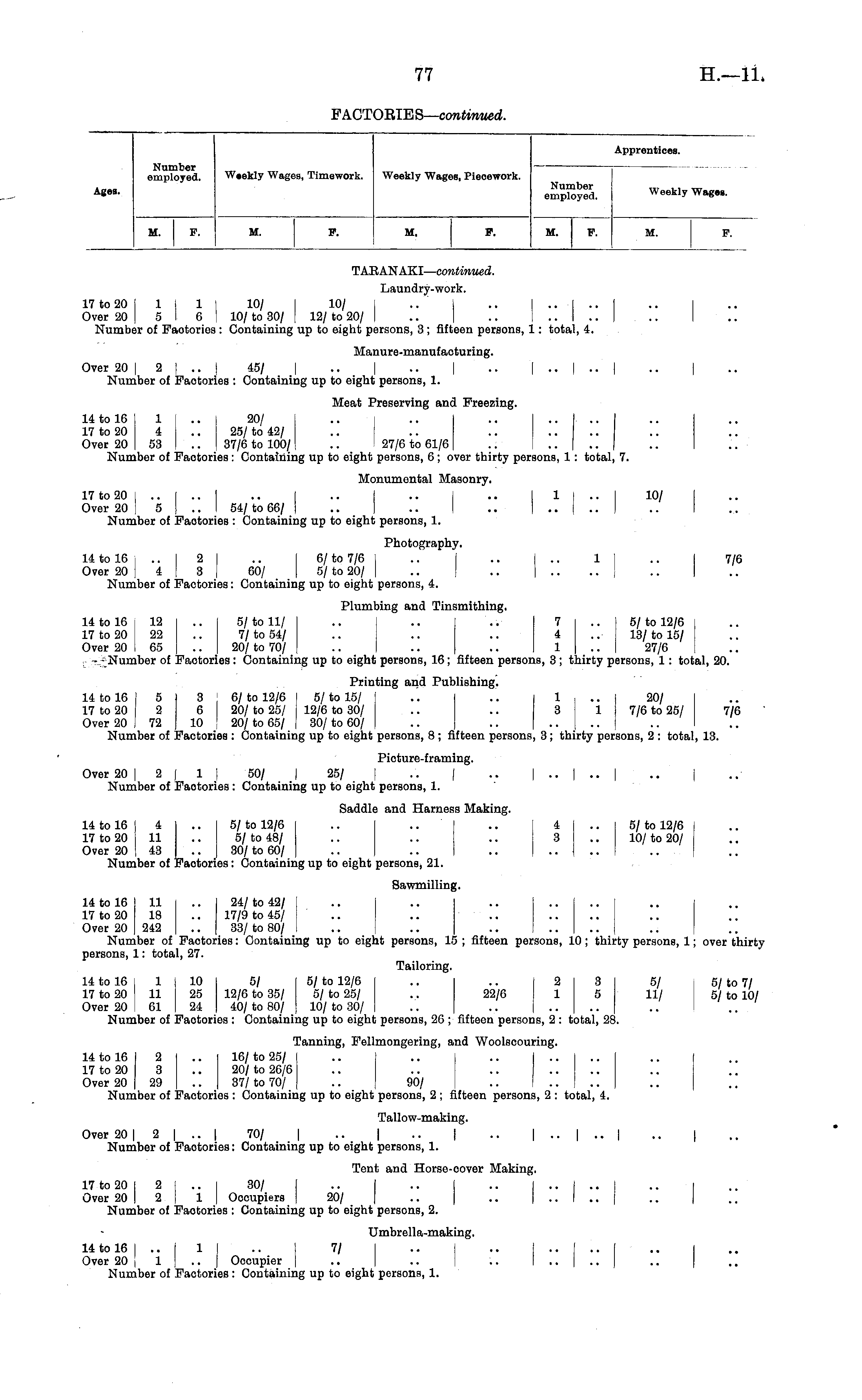 Apprentices. Number employed. Weekly Wages, Timework. Weekly Wages, Piecework. Number employed. Weekly Wages. Ages. M. F. M. F. M. F. M. F. M. F. TARANAKI — continued. Laundry-work. 17 to 20 I 1 I 1 | 10/ I 10/ | .. I .. I .. I .. I .. I Over 20 | 5 I 6 | 10/ to 30/ | 12/ to 20/ | .. .. .. I .. I Number of Faotories : Containing up to eight persons, 3 ; fifteen persons, 1: total, 4. Manure-manufacturing. Over 20 | 2 | .. | 45/ | .. | .. | .. | .. | ..' | .. | Number of Factories : Containing up to eight persons, 1. Meat Preserving and Freezing. 14 to 16 1 .. 20/ .. | 17 to 20 4 .. 25/ to 42/ Over 20 53 .. 37/6 to 100/ .. ' 27/6 to 61/6 Number of Factories : Containing up to eight persons, 6 ; over thirty persons, 1 : total, 7. Monumental Masonry. 17 to 20 I .. I .. I .. I .. I .. I .. I 1 I .. I 10/ I Over 20 | 5 I .. I 54/ to 66/ I .. .. I .. .. I .. I .. I Number of Faotories : Containing up to eight persons, 1. Photography. 14 to 16 | .. I 2 I .. I 6/ to 7/6 I .. ' I .. I .. 11 .. I 7/6 Over 20 | 4 I 3 | 60/ 5/ to 20/ j .. .. | .. .. .. | Number of Factories: Containing up to eight persons, 4. Plumbing and Tinsmithing. 14 to 16 12 .. 5/ to 11/ .. .. .. 7 .. 5/ to 12/6 17 to 20 22 .. 7/ to 54/ .. .. .. 4 .. 13/ to 15/ Over 20 65 .. 20/ to 70/ .. .. .. 1 .. 27/6 - - Number of Faotories : Containing up to eight persons, 16 ; fifteen persons, 3 ; thirty persons, 1 : total, 20. Printing and Publishing. 14 to 16 | 5 3 16/ to 12/6 5/ to 15/ .. .. 1 .. 20/ 17 to 20 2 6 j 20/ to 25/ 12/6 to 30/ .. .. 3 1 7/6 to 25/ 7/6 Over 20 I 72 10 | 20/ to 65/ 30/ to 60/ Number of Factories : Containing up to eight persons, 8 ; fifteen persons, 3; thirty persons, 2 : total, 13. Picture-framing. Over 20 | 2 | 1 | 50/ | 25/ | .. | .. | .. | .. | .. j Number of Faotories : Containing up to eight persons, 1. Saddle and Harness Making. 14 to 16 4 .. 5/ to 12/6 .. .. .. 4 .. 5/ to 12/6 17 to 20 11 .. 5/to 48/ .. .. .. 3 .. 10/to 20/ Over 20 43 .. 30/ to 60/ Number of Faotories: Containing up to eight persons, 21. Sawmilling. 14 to 16 11 .. I 24/ to 42/ 17 to 20 18 .. 17/9 to 45/ .. .. .. .... Over 20 242 .. j 33/ to 80/ Number of Factories: Containing up to eight persons, 15 ; fifteen persons, 10 ; thirty persons, 1; over thirty persons, 1: total, 27. Tailoring. 14 to 16 1 | 10 5/ 5/ to 12/6 .. .. 2 3 5/ 5/ to 7/ 17 to 20 11 25 12/6 to 35/ 5/ to 25/ .. 22/6 1 5 11/ 5/ to 10/ Over 20 61 | 24 40/ to 80/ 10/ to 30/ Number of Faotories : Containing up to eight persons, 26 ; fifteen persons, 2 : total, 28. Tanning, Fellmongering, and Woolscouring. 14 to 16 2 .. 16/ to 25/ .. .. .. I .. 17 to 20 3 .. 20/ to 26/6 .. .. .. .... Over 20 29 .. 37/ to 70/ .. 90/ .. I .. Number of Factories : Containing up to eight persons, 2 ; fifteen persons, 2 : total, 4. Tallow-making. Over 20 | 2 | .. 1 70/ | .. | .. j .. | .. | .. | .. | Number of Faotories: Containing up to eight persons, 1. Tent and Horse-oover Making. 17 to 20 I 2 I .. I 30/ I .. I .. I .. I .. I .. • I .. | Over 20 I 2 | 1 | Occupiers [ 20/ .. | .. .. I .. Number of Faotories : Containing up to eight persons, 2. Umbrella-making. 14 to 16 | .. | 1 I .. 7/ I .. I .. .. I ''. I .. I Over 20 ; 1 | .. | Occupier | .. .. .. .. .. | Number of Factories: Containing up to eight persons, 1.