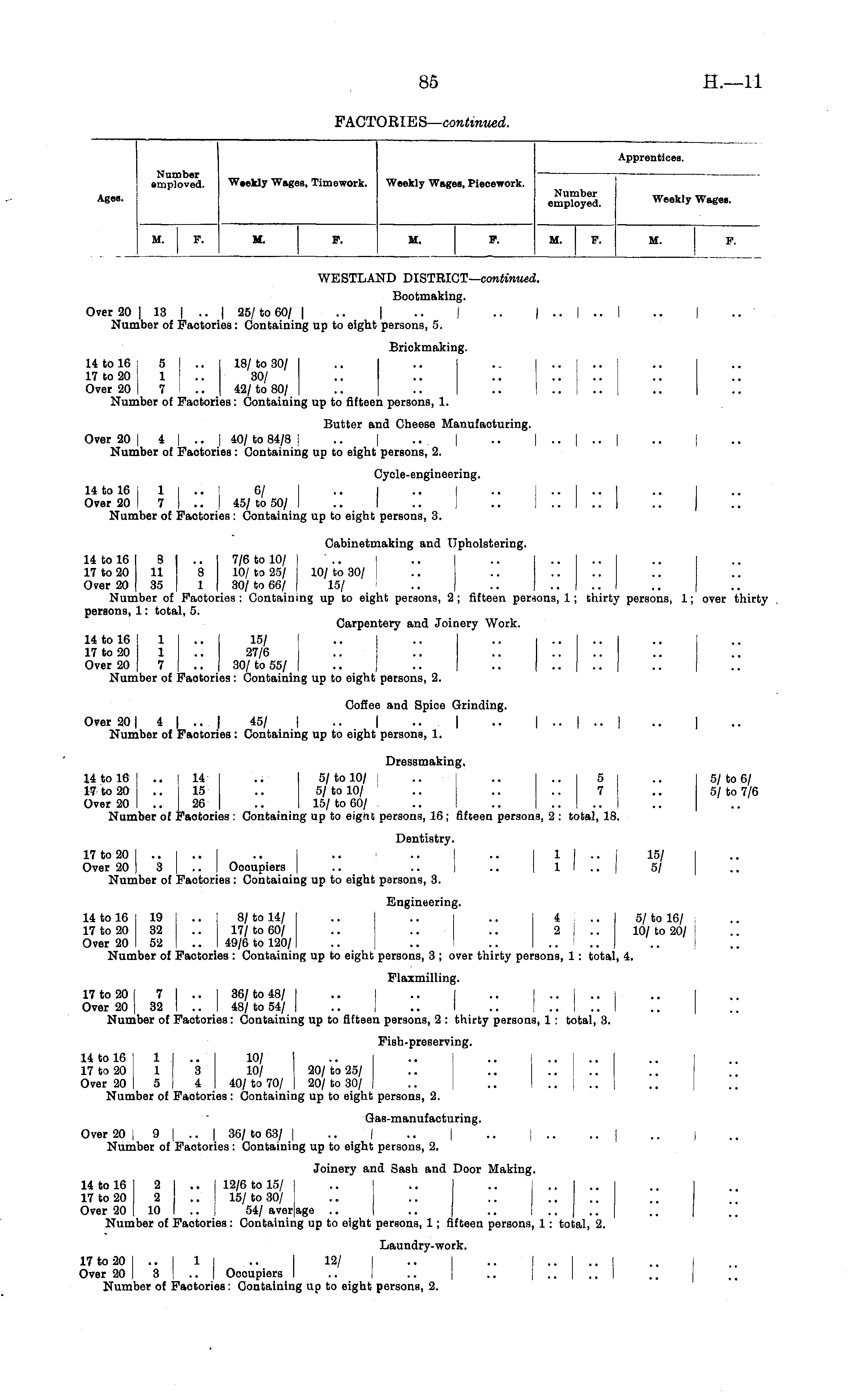 Apprentices. Number emploved. Weekly Wages, Timework. Weekly Wages, Piecework. Ages. Number employed. Weekly Wages. M. F. M. F. M. F. M. F. M. F. WESTLAND DISTRICT— continued. Bootmaking. Over 20 | 13 | .. | 25/ to 60/ | .. | .. | .. | .. . | .. | .. | Number of Faotories: Containing up to eight persons, 5. Brickmaking. 14 to 16 5 .. 18/to 30/ 17 to 20 1 30/ .. .. .. .... Over 20 7 .. 42/ to 80/ .. .. .. .... Number of Factories : Containing up to fifteen persons, 1. Butter and Cheese Manufacturing. Over 20 | 4 | .. | 40/ to 84/8 | .. | ... | .. | .. | .. | .. | Number of Faotories: Containing up to eight persons, 2. Cycle-engineering. 14 to 16 I 1 I .. I 6/ .. I .. I .. I .. I .. I .. I Over 20 I 7 I .. 45/ to 50/ I .. I .. .. .. I .. Number of Faotories: Containing up to eight persons, 3. Cabinetmaking and Upholstering. 14 to 16 8 .. 7/6 to 10/ .. | 17 to 20 11 8 10/ to 25/ 10/ to 30/ Over 20 35 1 30/to 66/ 15/ Number of Factories : Containing up to eight persons, 2; fifteen persons, 1; thirty persons, 1; over thirty persons, 1: total, 5. Carpentery and Joinery Work. 14 to 16 1 .. 15/ .. .. .. .. .. 1 17 to 20 1 .. 27/6 .. .. .. .... Over 20 7 .. 30/ to 55/ .. .. .. .... Number of Faotories: Containing up to eight persons, 2. Coffee and Spice Grinding. Over 20 | 4 | .. j 45/ | .. | .. | .. | .. | .'. | .. | Number of Faotories : Containing up to eight persons, 1. Dressmaking. 14 to 16 .. 14 .. 5/ to 10/ i .. .. .. 5 .. 5/ to 6/ 17 to 20 .. 15 .. 5/ to 10/ .. .. .. 7 .. 5/ to 7/6 Over 20 26 .. 15/ to 60/ Number of Factories : Containing up to eight persons, 16; fifteen persons, 2 : total, 18. Dentistry. 17 to 20 I .. I .. I .. I .. .. I .. I 1 | .. | 15/ j Over 20 ] 3 | .. | Oooupiers | .. .. .. 1 I .. | 5/ Number of Factories: Containing up to eight parsons, 3. Engineering. 14 to 16 19 .. 8/ to 14/ .. .. .. 4 .. 5/ to 16/ 17 to 20 32 .. 17/ to 60/ .. .. .. 2 .. 10/ to 20/ Over 20 52 .. 49/6 to 120/ .. .. .. .... Number of Factories : Containing up to eight persons, 3 ; over thirty persons, 1: total, 4. Flaxmilling. 17 to 20 I 7 I .. I 36/to 48/ I .. I .. .. I .. j .. I .. I Over 20 | 32 I .. I 48/ to 54/ | .. | .. I .. .. 1 .. I Number of Factories: Containing up to fifteen persons, 2 : thirty parsons, 1 : total, 3. Fish-preserving. 14 to 16 1 .. 10/ | .. .. .. .. | .. I .. I 17 to 20 1 3 10/ 20/ to 25/ Over 20 5 4 40/ to 70/ | 20/ to 30/ Number of Faotories : Containing up to eight persons, 2. Gas-manufacturing. Over 20 i 9 [.. | 36/ to 63/ | .. | .. | .. | .. .. | .. | Number of Factories: Containing up to eight persons, 2. Joinery and Sash and Door Making. 14 to 16 2 .. 12/6 to 15/ .. .. .. J .. 17 to 20 2 .. 15/ to 30/ Over 20 10 .. 54/ aver age .. .. .. .... Number of Factories : Containing up to eight persons, 1; fifteen persons, 1 : total, 2. Laundry-work. 17 to 20 I .. I 1 I .. 12/ I .. I .. I .. I .. I Over 20 I 3 | .. | Oooupiers I .. .. .. | .. Number of Factories: Containing up to eight persons, 2.