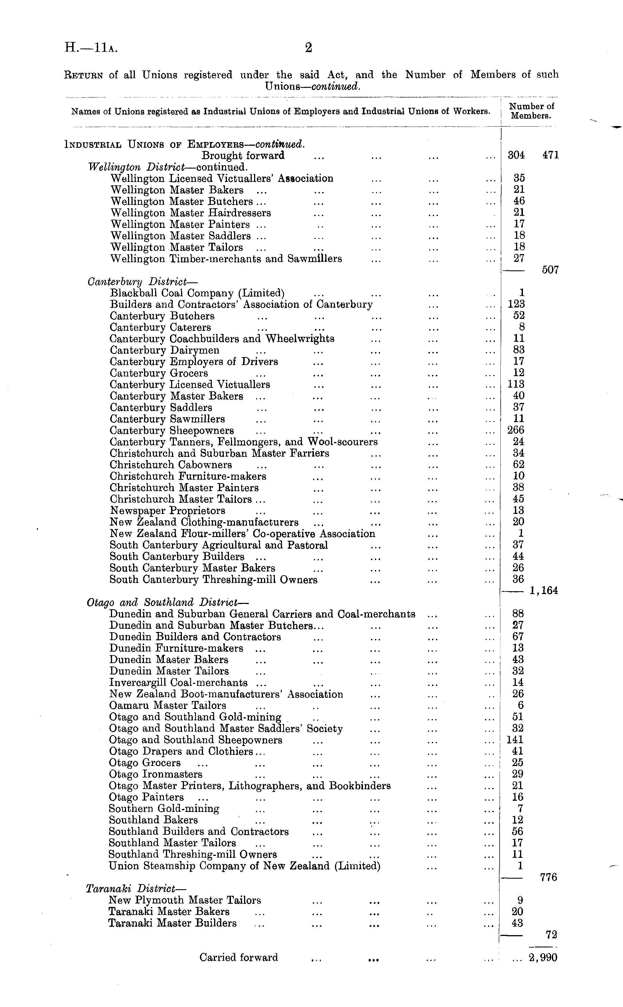 Names of Unions registered as Industrial Unions of Employers and Industrial Unions of Workers. Number of Members. ndustrial Unions op Employers— continued. Brought forward Wellington District —continued. Wellington Licensed Victuallers'Association Wellington Master Bakers Wellington Master Butchers ... Wellington Master Hairdressers Wellington Master Painters ... Wellington Master Saddlers ... Wellington Master Tailors Wellington Timber-merchants and Sawmillers 304 471 35 21 46 21 17 18 18 27 Canterbury District — Blackball Coal Company (Limited) Builders and Contractors' Association of Canterbury Canterbury Butchers Canterbury Caterers Canterbury Coachbuilders and Wheelwrights Canterbury Dairymen Canterbury Employers of Drivers Canterbury Grocers Canterbury Licensed Victuallers Canterbury Master Bakers ... Canterbury Saddlers Canterbury Sawmillers Canterbury Sheepowners Canterbury Tanners, Fellmongers, and Wool-scourers Christchurch and Suburban Master Farriers Christchurch Cabowners Christchurch Furniture-makers Christchurch Master Painters Christchurch Master Tailors ... Newspaper Proprietors New Zealand Clothing-manufacturers New Zealand Flour-millers' Co-operative Association South Canterbury Agricultural and Pastoral South Canterbury Builders ... South Canterbury Master Bakers South Canterbury Threshing-mill Owners 507 1 123 52 8 11 83 17 12 113 40 37 11 266 24 34 62 10 38 45 13 20 1 37 44 26 36 Otago and Southland District — Dunedin and Suburban General Carriers and Coal-merchants ... Dunedin and Suburban Master Butchers... Dunedin Builders and Contractors Dunedin Furniture-makers ... Dunedin Master Bakers Dunedin Master Tailors Invercargill Coal-merchants ... New Zealand Boot-manufacturers' Association Oamaru Master Tailors Otago and Southland Gold-mining Otago and Southland Master Saddlers'Society Otago and Southland Sheepowners Otago Drapers and Clothiers ... Otago Grocers Otago Ironmasters Otago Master Printers, Lithographers, and Bookbinders Otago Painters Southern Gold-mining Southland Bakers Southland Builders and Contractors Southland Master Tailors Southland Threshing-mill Owners Union Steamship Company of New Zealand (Limited) 1,164 88 27 67 13 43 | 32 14 26 6 51 32 141 41 25 29 21 16 7 12 56 17 11 1 776 Taranaki District — New Plymouth Master Tailors Taranaki Master Bakers Taranaki Master Builders 9 20 43 72 Carried forward ... 2,990