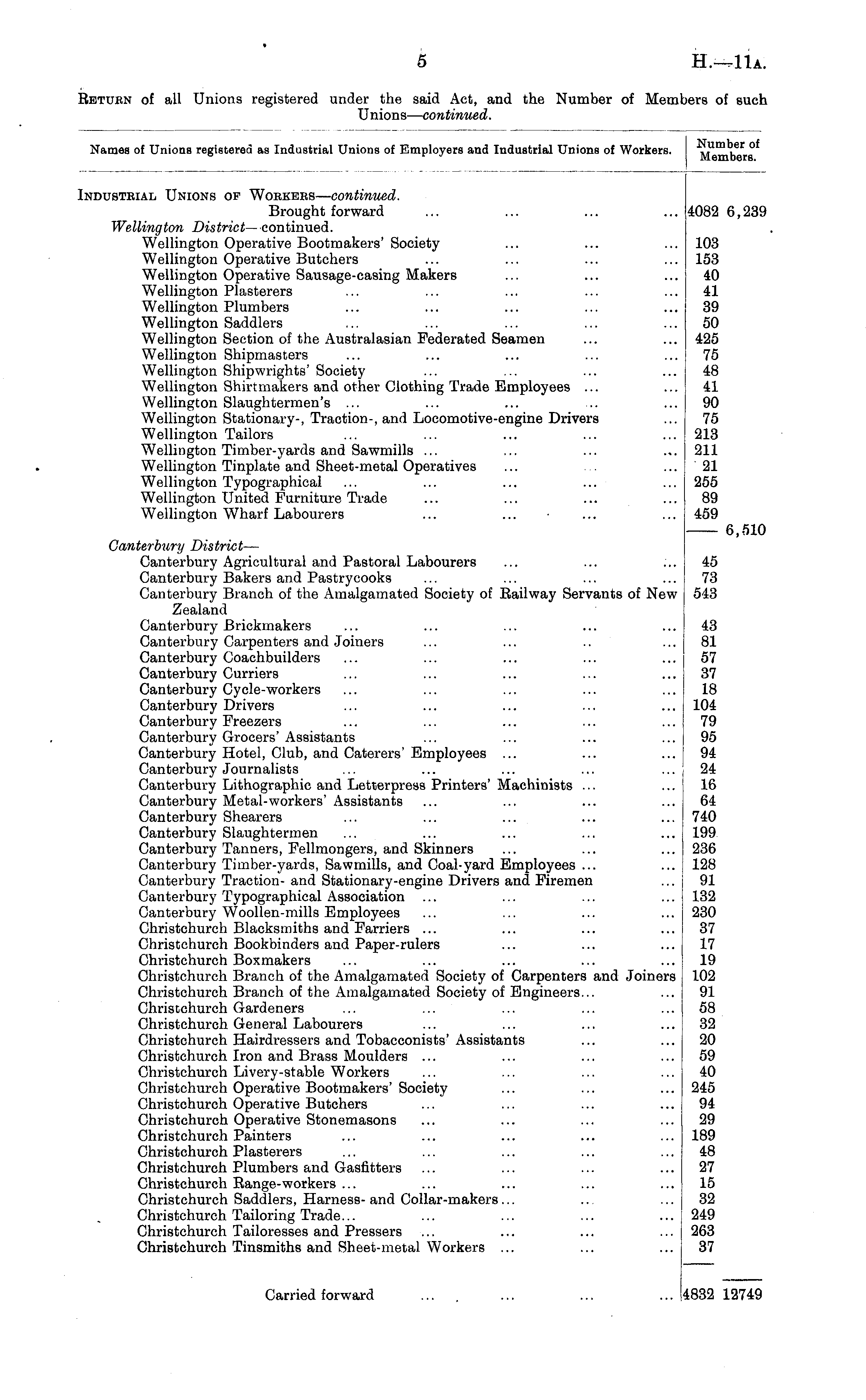 Names of Unions registered as Industrial Unions of Employers and Industrial Unions of Workers. Number of Members. Industrial Unions op Workers— continued. Brought forward Wellington District— continued. Wellington Operative Bootmakers' Society Wellington Operative Butchers Wellington Operative Sausage-casing Makers Wellington Plasterers Wellington Plumbers Wellington Saddlers Wellington Section of the Australasian Federated Seamen Wellington Shipmasters Wellington Shipwrights'Society Wellington Shirtmakers and other Clothing Trade Employees ... Wellington Slaughtermen's ... Wellington Stationary-, Traction-, and Locomotive-engine Drivers Wellington Tailors Wellington Timber-yards and Sawmills ... Wellington Tinplate and Sheet-metal Operatives Wellington Typographical Wellington United Furniture Trade Wellington Wharf Labourers 4082 6,239 103 153 40 41 39 50 425 75 48 41 90 75 213 211 21 255 89 459 Canterbury District — Canterbury Agricultural and Pastoral Labourers Canterbury Bakers and Pastrycooks Canterbury Branch of the Amalgamated Society of Railway Servants of New Zealand Canterbury Brickmakers Canterbury Carpenters and Joiners Canterbury Coachbuilders Canterbury Curriers Canterbury Cycle-workers Canterbury Drivers Canterbury Freezers Canterbury Grocers' Assistants Canterbury Hotel, Club, and Caterers'Employees ... Canterbury Journalists Canterbury Lithographic and Letterpress Printers' Machinists ... Canterbury Metal-workers' Assistants Canterbury Shearers Canterbury Slaughtermen Canterbury Tanners, Fellmongers, and Skinners Canterbury Timber-yards, Sawmills, and Coal-yard Employees ... Canterbury Traction- and Stationary-engine Drivers and Firemen Canterbury Typographical Association Canterbury Woollen-mills Employees Christchurch Blacksmiths and Farriers ... Christchurch Bookbinders and Paper-rulers Christchurch Boxmakers Christchurch Branch of the Amalgamated Society of Carpenters and Joiners Christchurch Branch of the Amalgamated Society of Engineers... Christchurch Gardeners Christchurch General Labourers Christchurch Hairdressers and Tobacconists' Assistants Christchurch Iron and Brass Moulders ... Christchurch Livery-stable Workers Christchurch Operative Bootmakers' Society Christchurch Operative Butchers Christchurch Operative Stonemasons Christchurch Painters Christchurch Plasterers Christchurch Plumbers and Gasfitters Christchurch Range-workers ... Christchurch Saddlers, Harness-and Collar-makers... Christchurch Tailoring Trade... Christchurch Tailoresses and Pressers Christchurch Tinsmiths and Sheet-metal Workers ... 6,510 45 73 543 43 81 57 37 18 104 79 95 94 24 16 64 740 199 236 128 91 132 230 37 17 19 102 91 58 32 20 59 40 245 94 29 189 48 27 15 32 249 263 37 Carried forward ... 4832 12749