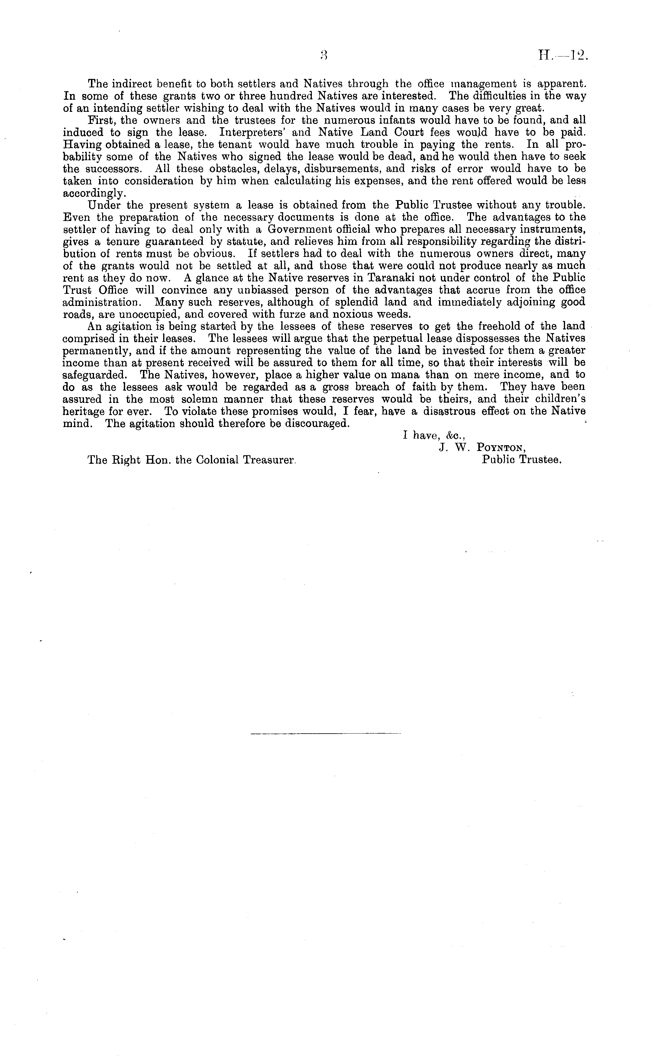 The indirect benefit to both settlers and Natives through the office management is apparent. In some of these grants two or three hundred Natives are interested. The difficulties in the way of an intending settler wishing to deal with the Natives would in many cases be very great. First, the owners and the trustees for the numerous infants would have to be found, and all induced to sign the lease. Interpreters' and Native Land Court fees would have to be paid. Having obtained a lease, the tenant would have much trouble in paying the rents. In all probability some of the Natives who signed the lease would be dead, and he would then have to seek the successors. All these obstacles, delays, disbursements, and risks of error would have to be taken into consideration by him when calculating his expenses, and the rent offered would be less accordingly. Under the present system a lease is obtained from the Public Trustee without any trouble. Even the preparation of the necessary documents is done at the office. The advantages to the settler of having to deal only with a Government official who prepares all necessary instruments, gives a tenure guaranteed by statute, and relieves him from all responsibility regarding the distribution of rents must be obvious. If settlers had to deal with the numerous owners direct, many of the grants would not be settled at all, and those that were could not produce nearly as much rent as they do now. A glance at the Native reserves in Taranaki not under control of the Public Trust Office will convince any unbiassed person of the advantages that accrue from the office administration. Many such reserves, although of splendid land and immediately adjoining good roads, are unoccupied, and covered with furze and noxious weeds. An agitation is being started by the lessees of these reserves to get the freehold of the land comprised in their leases. The lessees will argue that the perpetual lease dispossesses the Natives permanently, and if the amount representing the value of the land be invested for them a greater income than at present received will be assured to them for all time, so that their interests will be safeguarded. The Natives, however, place a higher value on mana than on mere income, and to do as the lessees ask would be regarded as a gross breach of faith by them. They have been assured in the most solemn manner that these reserves would be theirs, and their children's heritage for ever. To violate these promises would, I fear, have a disastrous effect on the Native mind. The agitation should therefore be discouraged. I have, &c, J. W. Poynton, The Right Hon. the Colonial Treasurer Public Trustee.