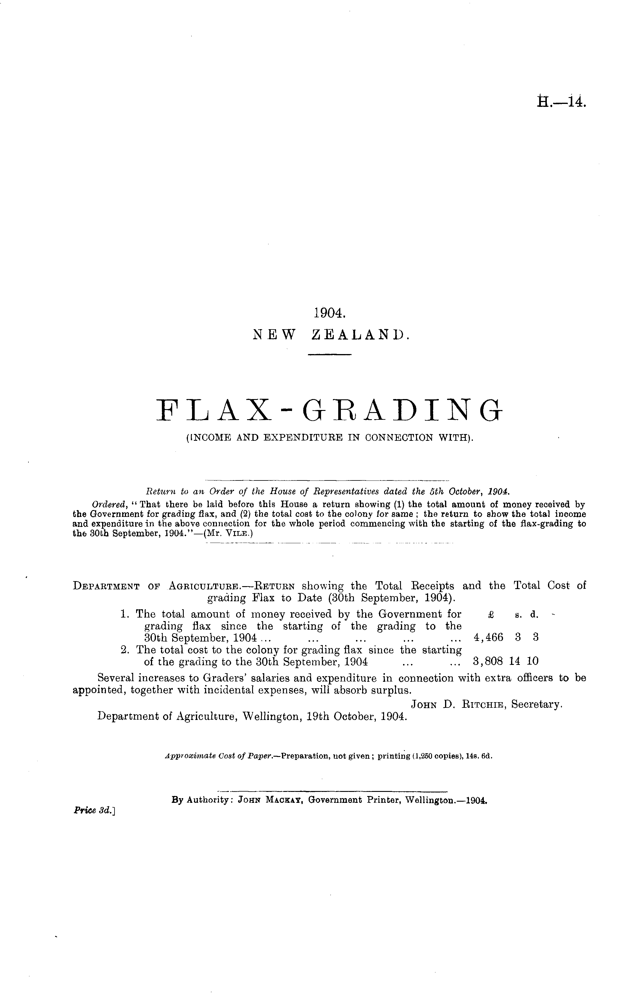 Return to an Order of the House of Representatives dated the sth October, 1904. Ordered, " That there be laid before this House a return showing (1) the total amount of money received by the Government for grading flax, and (2) the total cost to the colony for same ; the return to show the total income and expenditure in the above connection for the whole period commencing with the starting of the flax-grading to the 30th September, 1904."—(Mr. Vile.)
