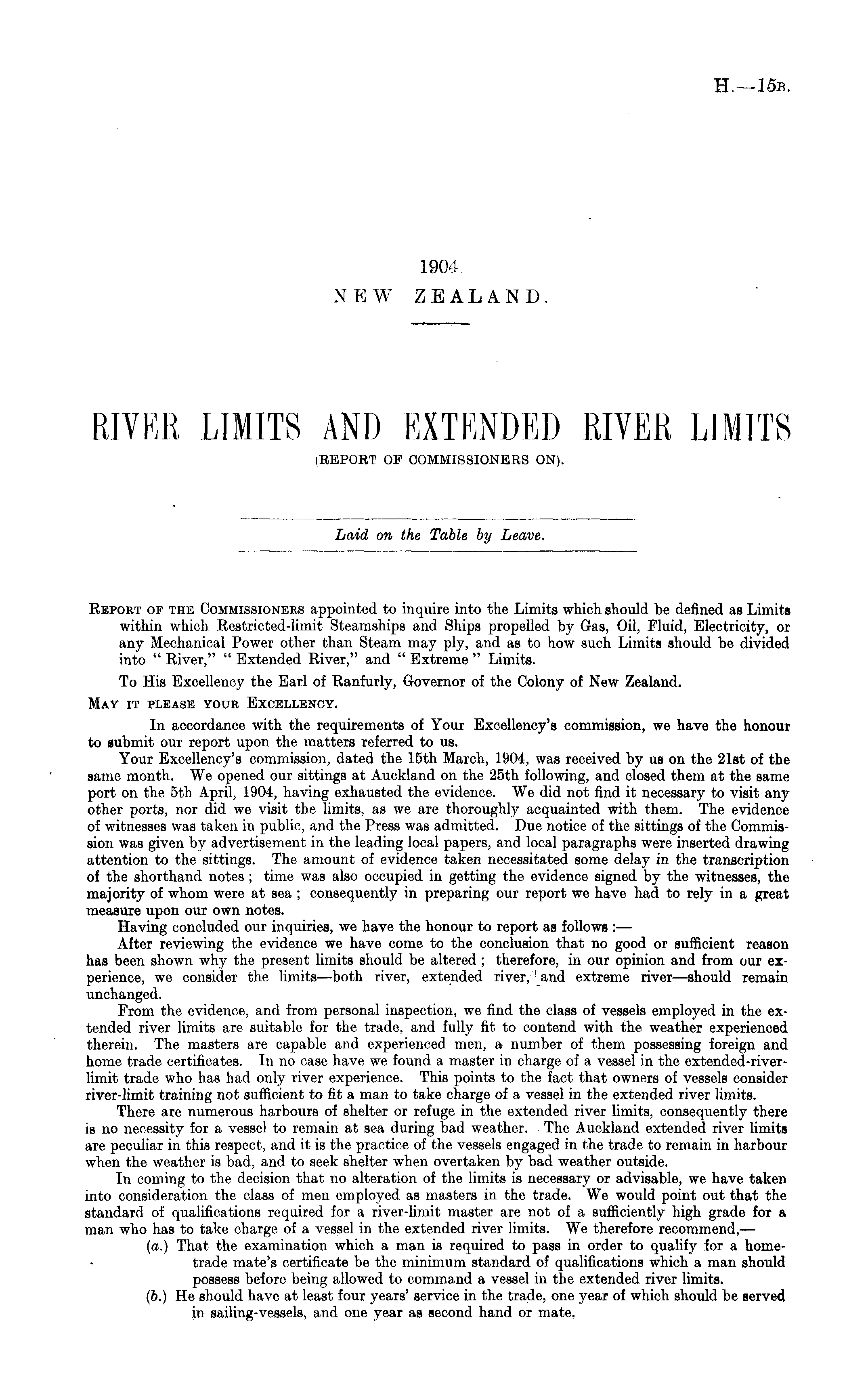 Report op the Commissioners appointed to inquire into the Limits which should be defined as Limits within which Restricted-limit Steamships and Ships propelled by Gas, Oil, Fluid, Electricity, or any Mechanical Power other than Steam may ply, and as to how such Limits should be divided into " River," " Extended River," and " Extreme " Limits. To His Excellency the Earl of Ranfurly, Governor of the Colony of New Zealand. May it please your Excellency. In accordance with the requirements of Your Excellency's commission, we have the honour to submit our report upon the matters referred to us. Your Excellency's commission, dated the 15th March, 1904, was received by us on the 21st of the same month. We opened our sittings at Auckland on the 25th following, and closed them at the same port on the sth April, 1904, having exhausted the evidence. We did not find it necessary to visit any other ports, nor did we visit the limits, as we are thoroughly acquainted with them. The evidence of witnesses was taken in public, and the Press was admitted. Due notice of the sittings of the Commission was given by advertisement in the leading local papers, and local paragraphs were inserted drawing attention to the sittings. The amount of evidence taken necessitated some delay in the transcription of the shorthand notes ; time was also occupied in getting the evidence signed by the witnesses, the majority of whom were at sea ; consequently in preparing our report we have had to rely in a great measure upon our own notes. Having concluded our inquiries, we have the honour to report as follows :— After reviewing the evidence we have come to the conclusion that no good or sufficient reason has been shown why the present limits should be altered ; therefore, in our opinion and from our experience, we consider the limits —both river, extended river, ! and extreme river—should remain unchanged. From the evidence, and from personal inspection, we find the class of vessels employed in the extended river limits are suitable for the trade, and fully fit to contend with the weather experienced therein. The masters are capable and experienced men, a number of them possessing foreign and home trade certificates. In no case have we found a master in charge of a vessel in the extended-river-limit trade who has had only river experience. This points to the fact that owners of vessels consider river-limit training not sufficient to fit a man to take charge of a vessel in the extended river limits. There are numerous harbours of shelter or refuge in the extended river limits, consequently there is no necessity for a vessel to remain at sea during bad weather. The Auckland extended river limits are peculiar in this respect, and it is the practice of the vessels engaged in the trade to remain in harbour when the weather is bad, and to seek shelter when overtaken by bad weather outside. In coming to the decision that no alteration of the limits is necessary or advisable, we have taken into consideration the class of men employed as masters in the trade. We would point out that the standard of qualifications required for a river-limit master are not of a sufficiently high grade for a man who has to take charge of a vessel in the extended river limits. We therefore recommend, — (a.) That the examination which a man is required to pass in order to qualify for a hometrade mate's certificate be the minimum standard of qualifications which a man should possess before being allowed to command a vessel in the extended river limits. (6.) He should have at least four years' service in the trade, one year of which should be served in sailing-vessels, and one year as second hand or mate.