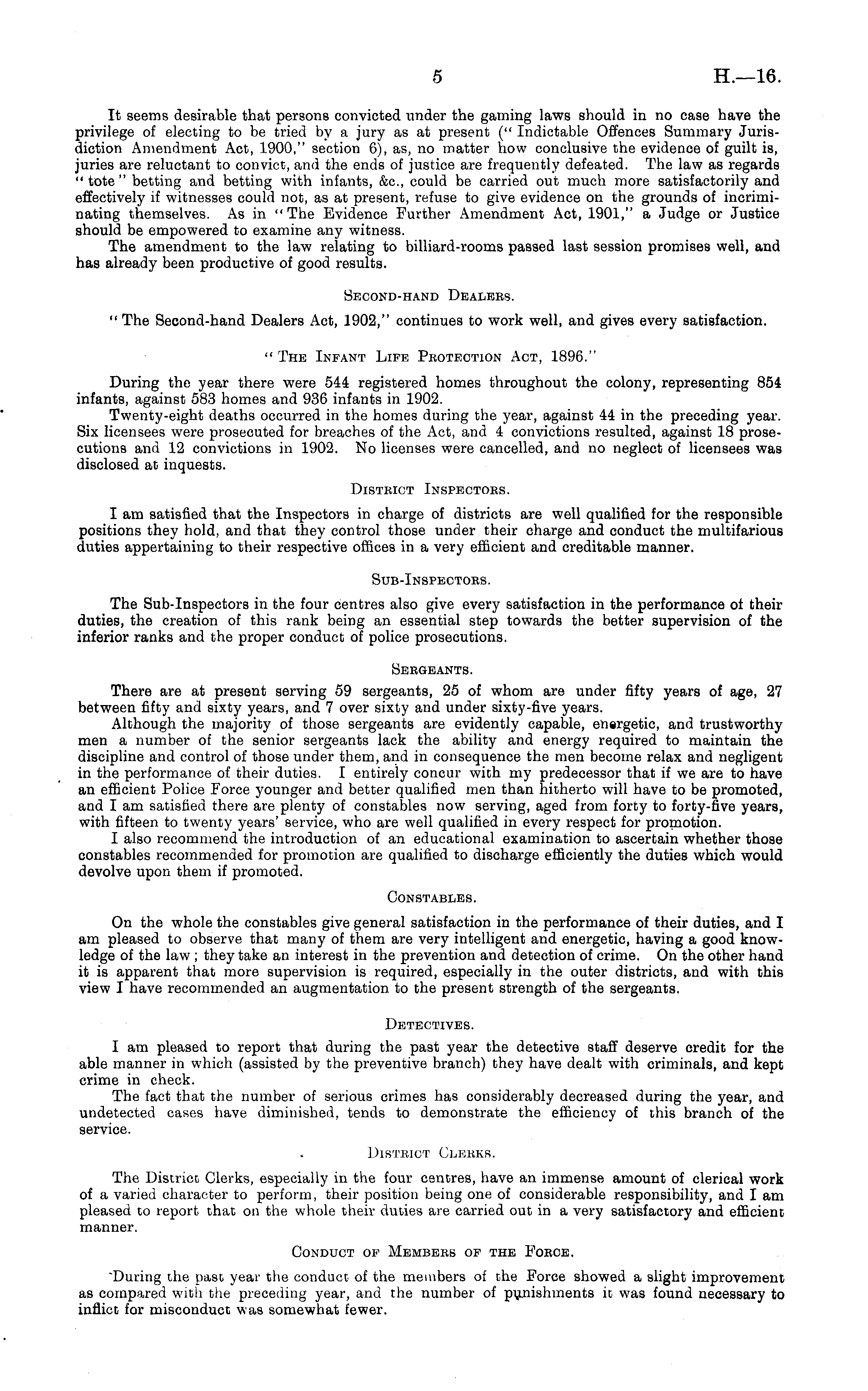 It seems desirable that persons convicted under the gaming laws should in no case have the privilege of electing to be tried by a jury as at present (" Indictable Offences Summary Jurisdiction Amendment Act, 1900," section 6), as, no matter how conclusive the evidence of guilt is, juries are reluctant to convict, and the ends of justice are frequently defeated. The law as regards " tote " betting and betting with infants, &c, could be carried out much more satisfactorily and effectively if witnesses could not, as at present, refuse to give evidence on the grounds of incriminating themselves. As in "The Evidence Further Amendment Act, 1901," a Judge or Justice should be empowered to examine any witness. The amendment to the law relating to billiard-rooms passed last session promises well, and has already been productive of good results. Second-hand Dealers. " The Second-hand Dealers Act, 1902," continues to work well, and gives every satisfaction. " The Infant Life Protection Act, 1896." During the year there were 544 registered homes throughout the colony, representing 854 infants, against 583 homes and 936 infants in 1902. Twenty-eight deaths occurred in the homes during the year, against 44 in the preceding year. Six licensees were prosecuted for breaches of the Act, and 4 convictions resulted, against 18 prosecutions and 12 convictions in 1902. No licenses were cancelled, and no neglect of licensees was disclosed at inquests. District Inspectoes. I am satisfied that the Inspectors in charge of districts are well qualified for the responsible positions they hold, and that they control those under their charge and conduct the multifarious duties appertaining to their respective offices in a very efficient and creditable manner. Sub-Inspectors. The Sub-Inspectors in the four centres also give every satisfaction in the performance ot their duties, the creation of this rank being an essential step towards the better supervision of the inferior ranks and the proper conduct of police prosecutions. Sergeants. There are at present serving 59 sergeants, 25 of whom are under fifty years of age, 27 between fifty and sixty years, and 7 over sixty and under sixty-five years. Although the majority of those sergeants are evidently capable, energetic, and trustworthy men a number of the senior sergeants lack the ability and energy required to maintain the discipline and control of those under them, and in consequence the men become relax and negligent in the performance of their duties. I entirely concur with my predecessor that if we are to have an efficient Police Force younger and better qualified men than hitherto will have to be promoted, and I am satisfied there are plenty of constables now serving, aged from forty to forty-five years, with fifteen to twenty years' service, who are well qualified in every respect for promotion. I also recommend the introduction of an educational examination to ascertain whether those constables recommended for promotion are qualified to discharge efficiently the duties which would devolve upon them if promoted. Constables. On the whole the constables give general satisfaction in the performance of their duties, and I am pleased to observe that many of them are very intelligent and energetic, having a good knowledge of the law ; they take an interest in the prevention and detection of crime. On the other hand it is apparent that more supervision is required, especially in the outer districts, and with this view I have recommended an augmentation to the present strength of the sergeants. Detectives. I am pleased to report that during the past year the detective staff deserve credit for the able manner in which (assisted by the preventive branch) they have dealt with criminals, and kept crime in check. The fact that the number of serious crimes has considerably decreased during the year, and undetected cases have diminished, tends to demonstrate the efficiency of this branch of the service. District Clkrkk. The District Clerks, especially in the four centres, have an immense amount of clerical work of a varied character to perform, their position being one of considerable responsibility, and I am pleased to report that on the whole their duties are carried out in a very satisfactory and efficient manner. Conduct of Members of the Force. 'During the past year the conduct of the members of the Force showed a slight improvement as compared with the preceding year, and the number of punishments it was found necessary to inflict for misconduct was somewhat fewer.