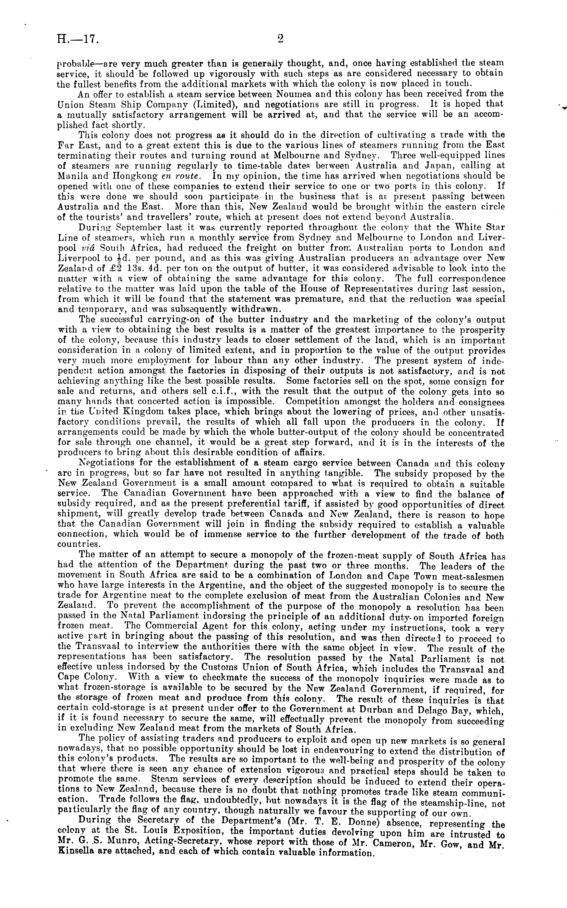 probable—are very much greater than is generally thought, and, once having established the steam service, it should be followed up vigorously with such steps as are considered necessary to obtain the fullest benefits from the additional markets with which the colony is now placed in touch. An offer to establish a steam service between Noumea and this colony has been received from the Union Steam Ship Company (Limited), and negotiations are still in progress. It is hoped that a mutually satisfactory arrangement will be arrived at, and that the service will be an accomplished fact shortly. This colony does not progress as it should do in the direction of cultivating a trade with the Far East, and to a great extent this is due to the various lines of steamers running from the East terminating their routes and turning round at Melbourne and Sydney. Three well-equipped lines of steamers are running regularly to time-table dates between Australia and Japan, calling at Manila and Hongkong en route. In my opinion, the time has arrived when negotiations should be opened with one of these companies to extend their service to one or two ports in this colony. If this were done we should soon participate in the business that is at present passing between Australia and the East. More than this, New Zealand would be brought within the eastern circle of the tourists' and travellers' route, which at present does not extend beyond Australia. During September last it was currently reported throughout the colony that the White Star Line of steamers, which run a monthly service from Sydney and Melbourne to London and Liverpool via South Africa, had reduced the freight on butter from Australian ports to London and Liverpool to per pound, and as this was giving Australian producers an advantage over New Zealand of £2 13s. 4d. per ton on the output of butter, it was considered advisable to look into the matter with a view of obtaining the same advantage for this colony. The full correspondence relative to the matter was laid upon the table of the House of Representatives during last session, from which it will be found that the statement was premature, and that the reduction was special and temporary, and was subsequently withdrawn. The successful carrying-on of the butter industry and the marketing of the colony's output with a view to obtaining the best results is a matter of the greatest importance to the prosperity of the colony, because this industry leads to closer settlement of the land, which is an important consideration in a colony of limited extent, and in proportion to the value of the output provides very much more employment for labour than any other industry. The present system of independent action amongst the factories in disposing of their outputs is not satisfactory, and is not achieving anj-thing like the best possible results. Some factories sell on the spot, some consign for sale and returns, and others sell c.i.f., with the result that the output of the colony gets into so many hands that concerted action is impossible. Competition amongst the holders and consignees in the United Kingdom takes place, which brings about the lowering of prices, and other unsatisfactory conditions prevail, the results of which all fall upon the producers in the colony. If arrangements could be made by which the whole butter-output of the colony should be concentrated for sale through one channel, it would be a great step forward, and it is in the interests of the producers to bring about this desirable condition of affairs. Negotiations for the establishment of a steam cargo service between Canada and this colony are in progress, but so far have not resulted in anything tangible. The subsidy proposed by the New Zealand Government is a small amount compared to what is required to obtain a suitable service. The Canadian Government have been approached with a view to find the balance of subsidy required, and as the present preferential tariff, if assisted by good opportunities of direct shipment, will greatly develop trade between Canada and New Zealand, there is reason to hope that the Canadian Government will join in finding the subsidy required to establish a valuable connection, which would be of immense service to the further development of the trade of both countries. The matter of an attempt to secure a monopoly of the frozen-meat supply of South Africa has had the attention of the Department during the past two or three months. The leaders of the movement in South Africa are said to be a combination of London and Cape Town meat-salesmen who have large interests in the Argentine, and tho object of the suggested monopoly is to secure the trade for Argentine meat to the complete exclusion of meat from the Australian Colonies and New Zealand. To prevent the accomplishment of the purpose of the monopoly a resolution has been passed in the Natal Parliament indorsing the principle of an additional duty-on imported foreign frozen meat. The Commercial Agent for this colony, acting under my instructions, took a very active part in bringing about the passing of this resolution, and was then directed to proceed to the Transvaal to interview the authorities there with the same object in view. The result of the representations has been satisfactory. The resolution passed by the Natal Parliament is not effective unless indorsed by the Customs Union of South Africa, which includes the Transvaal and Cape Colony. With a view to checkmate the success of the monopoly inquiries were made as to what frozen-storage is available to be secured by the New Zealand Government, if required, for the storage of frozen meat and produce from this colony. The result of these inquiries is that certain cold-storage is at present under offer to the Government at Durban and Delago Bay, which, if it is found necessary to secure the same, will effectually prevent the monopoly from succeeding in excluding New Zealand meat from the markets o