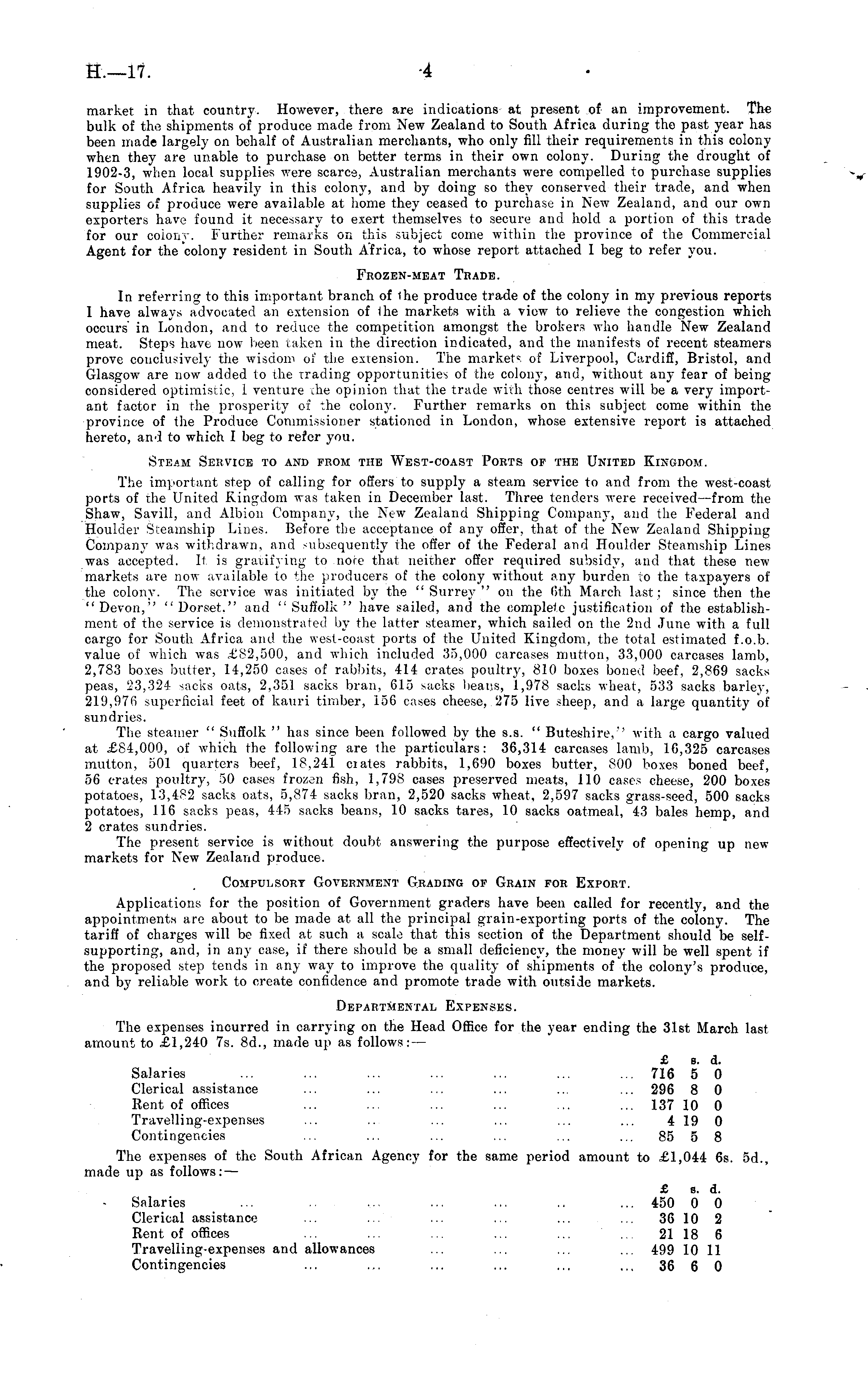 market in that country. However, there are indications at present of an improvement. The bulk of the shipments of produce made from New Zealand to South Africa during the past year has been made largely on behalf of Australian merchants, who only fill their requirements in this colony when they are unable to purchase on better terms in their own colony. During the drought of 1902-3, when local supplies were scarce, Australian merchants were compelled to purchase supplies for South Africa heavily in this colony, and by doing so they conserved their trade, and when supplies of produce were available at home they ceased to purchase in New Zealand, and our own exporters have found it necessary to exert themselves to secure and hold a portion of this trade for our colony. Further remarks on this subject come within the province of the Commercial Agent for the colony resident in South Africa, to whose report attached I beg to refer you. Frozen-meat Trade. In referring to this important branch of ihe produce trade of the colony in my previous reports 1 have always advocated an extension of Ihe markets with a view to relieve the congestion which occurs in London, and to reduce the competition amongst the brokers who handle New Zealand meat. Steps have now been taken in the direction indicated, and the manifests of recent steamers prove conclusively the wisdom of the extension. The market s of Liverpool, Cardiff, Bristol, and Glasgow are now added to the trading opportunities of the colony, and, without any fear of being considered optimistic, 1 venture t he opinion that the trade with those centres will be a very important factor in the prosperity of the colony. Further remarks on this subject come within the province of the Produce Commissioner stationed in London, whose extensive report is attached hereto, and to which I beg to refer you. Steam Service to and from the West-coast Ports of the United Kingdom. The important step of calling for offers to supply a steam service to and from the west-coast ports of the United Kingdom was taken in December last. Three tenders were received —from the Shaw, Savill, and Albion Company, the New Zealand Shipping Company, aud the Federal and Houlder Steamship Lines. Before the acceptance of any offer, that of the New Zealand Shipping Company was withdrawn, and subsequently the offer of the Federal and Houlder Steamship Lines was accepted. It is gratifying to note that neither offer required subsidy, and that these new markets are now available to the producers of the colony without any burden to the taxpayers of the colony. The service was initiated by the "Surrey" on the 6th March last; since then the "Devon," "Dorset." and "Suffolk" have sailed, and the complete justification of the establishment of the service is demonstrated by the latter steamer, which sailed on the 2nd June with a full cargo for South Africa and the west-coast ports of the United Kingdom, the total estimated f.o.b. value of which was .£82,500, and which included 35,000 carcases mutton, 33,000 carcases lamb, 2,783 boxes butter, 14,250 cases of rabbits, 414 crates poultry, 810 boxes boned beef, 2,869 sacks peas, 23,324 sacks oats, 2,351 sacks bran, 615 sacks beans, 1,978 sacks wheat, 533 sacks barley, 219,970 superficial feet of kauri timber, 156 cases cheese, 275 live sheep, and a large quantity of sundries. The steamer " Suffolk " has since been followed by the s.s. " Buteshire," with a cargo valued at £84,000, of which the following are the particulars: 36,314 carcases lamb, 16,325 carcases mutton, 501 quarters beef, 18,241 ciates rabbits, 1,690 boxes butter, 800 boxes boned beef, 56 crates poultry, 50 cases frozen fish, 1,798 cases preserved meats, 110 cases cheese, 200 boxes potatoes, 13,482 sacks oats, 5,874 sacks bran, 2,520 sacks wheat, 2,597 sacks grass-seed, 500 sacks potatoes, 116 sacks peas, 445 sacks beans, 10 sacks tares, 10 sacks oatmeal, 43 bales hemp, and 2 crates sundries. The present service is without doubt answering the purpose effectively of opening up new markets for New Zealand produce. Compulsory Government Grading of Grain for Export. Applications for the position of Government graders have been called for recently, and the appointments are about to be made at all the principal grain-exporting ports of the colony. The tariff of charges will be fixed at such a scale that this section of the Department should be selfsupporting, and, in any case, if there should be a small deficiency, the money will be well spent if the proposed step tends in any way to improve the quality of shipments of the colony's produce, and by reliable work to create confidence and promote trade with outside markets. Departmental Expenses. The expenses incurred in carrying on the Head Office for the year ending the 31st March last amount to £1,240 7s. Bd., made up as follows: — £ 8. d. Salaries ... ... ... ... ... ... ... 716 5 0 Clerical assistance ... ... ... ... ... ... 296 8 0 Rent of offices ... ... ... ... ... ... 137 10 0 Travelling-expenses ... .. ... ... ... ... 4 19 0 Contingencies ... ... ... ... ... ... 85 5 8 The expenses of the South African Agency for the same period amount to £1,044 6s. 5d., made up as follows: — £ s. d. Salaries ... .. ... ... ... .. ... 450 0 0 Clerical assistance ... ... ... ... ... ... 36 10 2 Rent of offices ... ... ... ... ... ... 21 18 6 Travelling-expenses and allowances ... ... ... 499 10 11 Contingencies ... ... ... ... ~. ~. 36 6 0