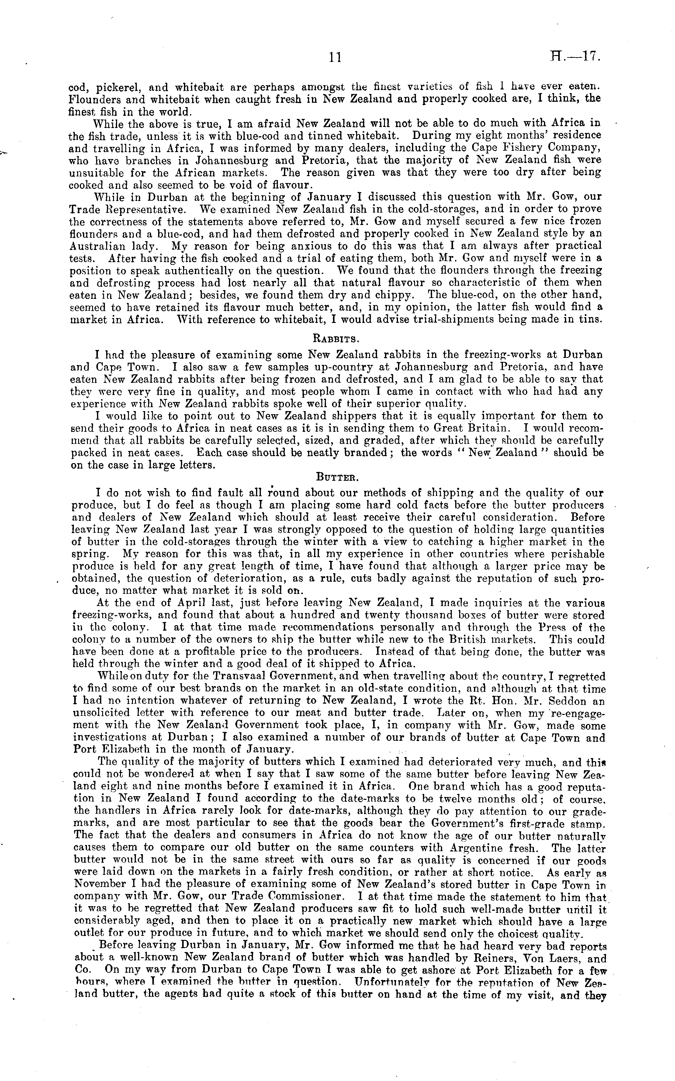 cod, pickerel, and whitebait are perhaps amongst the finest varieties of fish 1 have ever eaten. Flounders and whitebait when caught fresh in New Zealand and properly cooked are, I think, the finest fish in the world. While the above is true, I am afraid New Zealand will not be able to do much with Africa in the fish trade, unless it is with blue-cod and tinned whitebait. During my eight months' residence and travelling in Africa, I was informed by many dealers, including the Cape Fishery Company, who have branches in Johannesburg and Pretoria, that the majority of New Zealand fish were unsuitable for the African markets. The reason given was that they were too dry after being cooked and also seemed to be void of flavour. While in Durban at the beginning of January I discussed this question with Mr. Gow, our Trade Representative. We examined New Zealand fish in the cold-storages, and in order to prove the correctness of the statements above referred to, Mr. Gow and myself secured a few nice frozen flounders and a blue-cod, and had them defrosted and properly cooked in New Zealand style by an Australian lady. My reason for being anxious to do this was that I am always after practical tests. After having the fish cooked and a trial of eating them, both Mr. Gow and myself were in a position to speak authentically on the question. We found that the flounders through the freezing and defrosting process had lost nearly all that natural flavour so characteristic of them when eaten in New Zealand; besides, we found them dry and chippy. The blue-cod, on the other hand, seemed to have retained its flavour much better, and, in my opinion, the latter fish would find a market in Africa. With reference to whitebait, I would advise trial-shipments being made in tins. Rabbits. I had the pleasure of examining some New Zealand rabbits in the freezing-works at Durban and Cape Town. I also saw a few samples up-country at Johannesburg and Pretoria, and have eaten New Zealand rabbits after being frozen and defrosted, and I am glad to be able to say that they were very fine in quality, and most people whom I came in contact with who had had any experience with New Zealand rabbits spoke well of their superior quality. I would like to point out to New Zealand shippers that it is equally important for them to send their goods to Africa in neat cases as it is in sending them to Great Britain. I would recommend that all rabbits be carefully selected, sized, and graded, after which they should be carefully packed in neat cases. Each case should be neatly branded; the words " New Zealand " should be on the case in large letters. Butter. I do not wish to find fault all round about our methods of shipping and the quality of our produce, but I do feel as though I am placing some hard cold facts before the butter producers and dealers of New Zealand which should at least receive their careful consideration. Before leaving New Zealand last year I was strongly opposed to the question of holding; large quantities of butter in the cold-storages through the winter with a view to catching a higher market in the spring. My reason for this was that, in all my experience in other countries where perishable produce is held for any great length of time, I have found that although a larger price may be obtained, the question of deterioration, as a rule, cuts badly against the reputation of such produce, no matter what market it is sold on. At the end of April last, just before leaving New Zealand, I made inquiries at the various freezing-works, and found that about a hundred and twenty thousand boxes of butter were stored in the colony. I at that time made recommendations personally and through the Press of the colony to a number of the owners to ship the butter while new to the British markets. This could have been done at a profitable price to the producers. Instead of that being done, the butter was held through the winter and a good deal of it shipped to Africa. While on duty for the Transvaal Government, and when travelling about the country, I regretted to find some of our best brands on the market in an old-state condition, and although at that time I had no intention whatever of returning to New Zealand, I wrote the Rt. Hon. Mr. Seddon an unsolicited letter with reference to our meat and butter trade. Later on, when my re-engage-ment with the New Zealand Government took place, I, in company with Mr. Gow, made some investigations at Durban; I also examined a number of our brands of butter at Cape Town and Port Elizabeth in the month of January. The quality of the majority of butters which I examined had deteriorated very much, and thin could not be wondered at when I say that I saw some of the same butter before leaving New Zealand eight and nine months before I examined it in Africa. One brand which has a good reputation in New Zealand I found according to the date-marks to be twelve months old; of course, the handlers in Africa rarely look for date-marks, although they do pay attention to our grademarks, and are most particular to see that the goods bear the Government's first-grade stamp. The fact that the dealers and consumers in Africa do not know the age of our butter naturally causes them to compare our old butter on the same counters with Argentine fresh. The latter butter would not be in the same street with ours so far as quality is concerned if our goods were laid down on the markets in a fairly fresh condition, or rather at short notice. As early as November I had the pleasure of examining some of New Zealand's stored butter in Cape Town in company with Mr. Gow, our Trade Commissioner. lat that time made the statement to him that it was to be regretted that New Zealand producers saw fit to hold such well-made butter until it considerably aged, and then to place it on a practically new market which should have a large outlet for our produce in future, and to which market we should send only the choicest quality. Be
