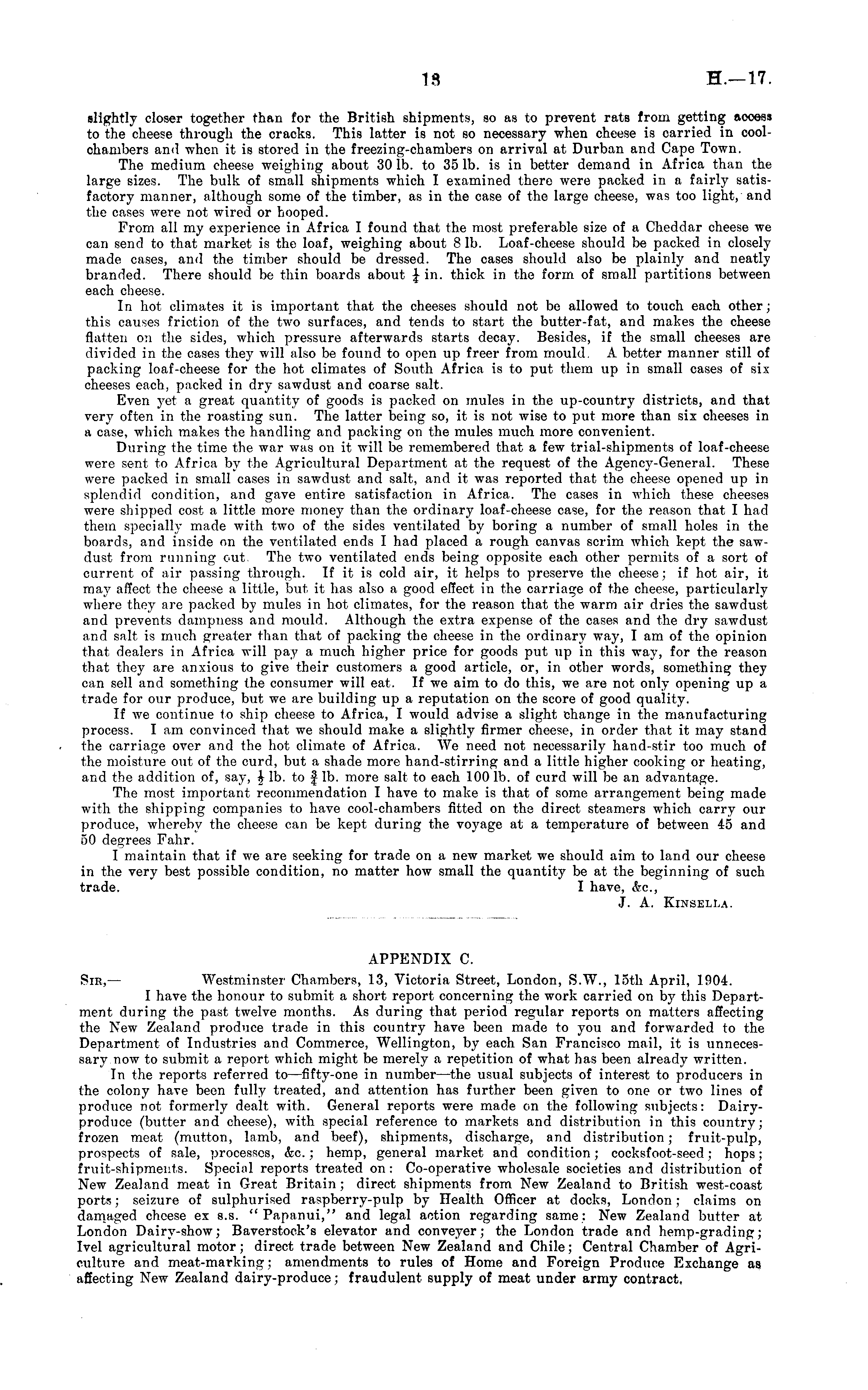 APPENDIX C. Sir, — Westminster Chambers, 13, Victoria Street, London, S.W., loth April, 1904. I have the honour to submit a short report concerning the work carried on by this Department during the past twelve months. As during that period regular reports on matters affecting the New Zealand produce trade in this country have been made to you and forwarded to the Department of Industries and Commerce, Wellington, by each San Francisco mail, it is unnecessary now to submit a report which might be merely a repetition of what has been already written. In the reports referred to —fifty-one in number —the usual subjects of interest to producers in the colony have been fully treated, and attention has further been given to one or two lines of produce not formerly dealt with. General reports were made on the following subjects: Dairyproduce (butter and cheese), with special reference to markets and distribution in this country; frozen meat (mutton, lamb, and beef), shipments, discharge, and distribution; fruit-pulp, prospects of sale, processes, &c.; hemp, general market and condition; cocksfoot-seed; hops; fruit-shipments. Special reports treated on: Co-operative wholesale societies and distribution of New Zealand meat in Great Britain ; direct shipments from New Zealand to British west-coast ports; seizure of sulphurised raspberry-pulp by Health Officer at docks, London: claims on damaged cheese ex s.s. " Papanui," and legal action regarding same: New Zealand butter at London Dairy-show; Baverstock's elevator and conveyer; the London trade and hemp-grading; Ivel agricultural motor; direct trade between New Zealand and Chile; Central Chamber of Agriculture and meat-marking; amendments to rules of Home and Foreign Produce Exchange as affecting New Zealand dairy-produce; fraudulent supply of meat under army contract.