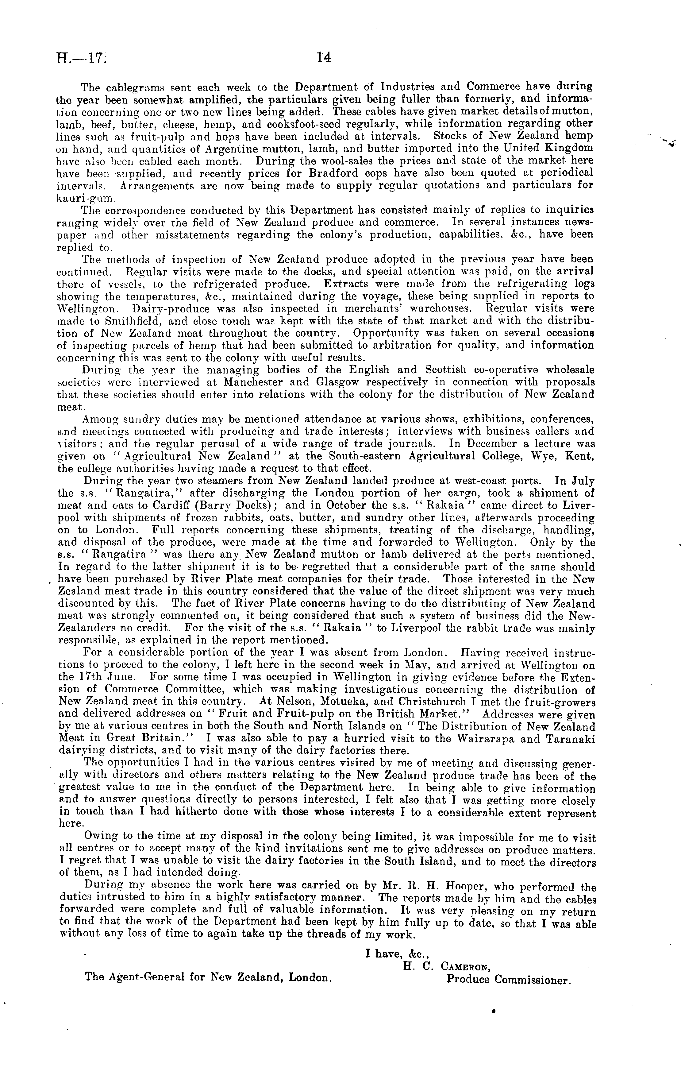 The cablegrams sent each week to the Department of Industries and Commerce have during the year been somewhat amplified, the particulars given being fuller than formerly, and information concerning one or two new lines being added. These cables have given market details of mutton, lamb, beef, butter, cheese, hemp, and cooksfoot-seed regularly, while information regarding other lines such as fruit-pulp and hops have been included at intervals. Stocks of New Zealand hemp on hand, and quantities of Argentine mutton, lamb, and butter imported into the United Kingdom have also been cabled each month. During the wool-sales the prices and state of the market here have been supplied, and recently prices for Bradford cops have also been quoted at periodical intervals. Arrangements are now being made to supply regular quotations and particulars for kauri-gum. The correspondence conducted by this Department has consisted mainly of replies to inquiries ranging widely over the field of New Zealand produce and commerce. In several instances newspaper and other misstatements regarding the colony's production, capabilities, &c, have been replied to. The methods of inspection of New Zealand produce adopted in the previous year have been continued. Regular visits were made to the docks, and special attention was paid, on the arrival there of vessels, to the refrigerated produce. Extracts were made from the refrigerating logs showing the temperatures, &c, maintained during the voyage, these being supplied in reports to Wellington. Dairy-produce was also inspected in merchants' warehouses. Regular visits were made to Smithfield, and close touch was kept with the state of that market and with the distribution of New Zealand meat throughout the country. Opportunity was taken on several occasions of inspecting parcels of hemp that had been submitted to arbitration for quality, and information concerning this was sent to the colony with useful results. During the year the managing bodies of the English and Scottish co-operative wholesale societies were interviewed at Manchester and Glasgow respectively in connection with proposals that these societies should enter into relations with the colony for the distribution of New Zealand me^at. Among sundry duties may be mentioned attendance at various shows, exhibitions, conferences, and meetings connected with producing and trade interests; interviews with business callers and visitors; and the regular perusal of a wide range of trade journals. In December a lecture was given on " Agricultural New Zealand " at the South-eastern Agricultural College, Wye, Kent, the college authorities having made a request to that effect. During the year two steamers from New Zealand landed produce at west-coast ports. In July the s.s. " Rangatira," after discharging the London portion of her cargo, took a shipment of meat and oats to Cardiff (Barry Docks); and in October the s.s. " Rakaia " came direct to Liverpool with shipments of frozen rabbits, oats, butter, and sundry other lines, afterwards proceeding on to London. Full reports concerning these shipments, treating of the discharge, handling, and disposal of the produce, were made at the time and forwarded to Wellington. Only by the s.s. " Rangatira " was there any New Zealand mutton or lamb delivered at the ports mentioned. In regard to the latter shipment it is to be regretted that a considerable part of the same should have been purchased by River Plate meat companies for their trade. Those interested in the New Zealand meat trade in this country considered that the value of the direct shipment was very much discounted by this. The fact of River Plate concerns having to do the distributing of New Zealand meat was strongly commented on, it being considered that such a system of business did the NewZealanders no credit. For the visit of the s.s. " Rakaia "to Liverpool the rabbit trade was mainly responsible, as explained in the report mentioned. For a considerable portion of the year I was absent from London. Having received instructions to proceed to the colony, I left here in the second week in May, and arrived at Wellington on the 17th June. For some time I was occupied in Wellington in giving evidence before the Extension of Commerce Committee, which was making investigations concerning the distribution of New Zealand meat in this country. At Nelson, Motueka, and Christchurch T met the fruit-growers and delivered addresses on " Fruit and Fruit-pulp on the British Market." Addresses were given by me at various centres in both the South and North Islands on " The Distribution of New Zealand Meat in Great Britain." I was also able to pay a hurried visit to the Wairarapa and Taranaki dairying districts, and to visit many of the dairy factories there. The opportunities I had in the various centres visited by me of meeting and discussing generally with directors and others matters relating to the New Zealand produce trade has been of the greatest value to me in the conduct, of the Department here. In being able to give information and to answer questions directly to persons interested, I felt also that I was getting more closely in touch than I had hitherto done with those whose interests I to a considerable extent represent here. Owing to the time at my disposal in the colony being limited, it was impossible for me to visit all centres or to accept many of the kind invitations sent me to give addresses on produce matters. I regret that I was unable to visit the dairy factories in the South Island, and to meet the directors of them, as I had intended doing During my absence the work here was carried on by Mr. R. H. Hooper, who performed the duties intrusted to him in a highly satisfactory manner. The reports made by him and the cables forwarded were complete and full of valuable information. It was very pleasing on my return to find that the work of the Department had been kept by him fully up to date, so that I was able without 
