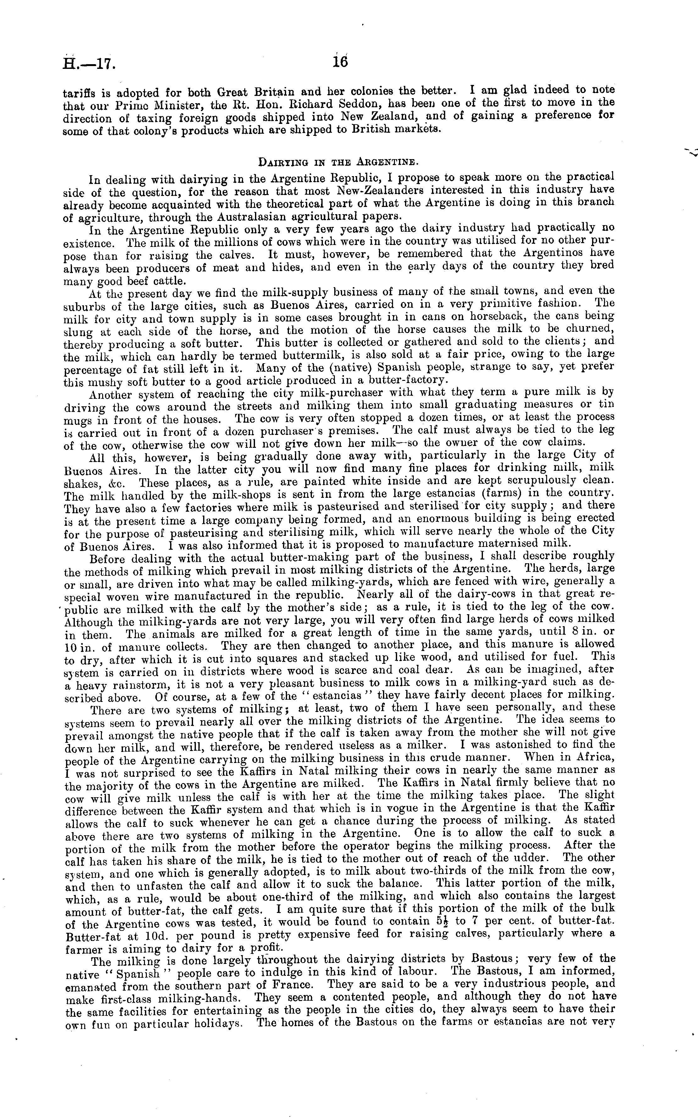 tariffs is adopted for both Great Britain and her colonies the better. lam glad indeed to note that our Prime Minister, the Rt. Hon. Richard Seddon, has been one of the first to move in the direction of taxing foreign goods shipped into New Zealand, and of gaining a preference for some of that colony's products which are shipped to British markets. Dairying in the Argentine. In dealing with dairying in the Argentine Republic, I propose to speak more on the practical side of the question, for the reason that most New-Zealanders interested in this industry have already become acquainted with the theoretical part of what the Argentine is doing in this branch of agriculture, through the Australasian agricultural papers. In the Argentine Republic only a very few years ago the dairy industry had practically no existence. The milk of the millions of cows which were in the country was utilised for no other purpose than for raising the calves. It must, however, be remembered that the Argentinos have always been producers of meat and hides, and even in the early days of the country they bred many good beef cattle. At the present day we find the milk-supply business of many of the small towns, and even the suburbs of the large cities, such as Buenos Aires, carried on in a very primitive fashion. The milk for city and town supply is in some cases brought in in cans on horseback, the cans being slung at each side of the horse, and the motion of the horse causes the milk to be churned, thereby producing a soft butter. This butter is collected or gathered and sold to the clients; and the milk, which can hardly be termed buttermilk, is also sold at a fair price, owing to the large percentage of fat still left in it. Many of the (native) Spanish people, strange to say, yet prefer this mushy soft butter to a good article produced in a butter-factory. Another system of reaching the city milk-purchaser with what they term a pure milk is by driving the cows around the streets and milking them into small graduating measures or tin mugs in front of the houses. The cow is very often stopped a dozen times, or at least the process is carried out in front of a dozen purchaser s premises. The calf must always be tied to the leg of the cow, otherwise the cow will not give down her milk—so the owner of the cow claims. All this, however, is being gradually done away with, particularly in the large City of Buenos Aires. In the latter city you will now find many fine places for drinking milk, milk shakes, &c. These places, as a rule, are painted white inside and are kept scrupulously clean. The milk handled by the milk-shops is sent in from the large estancias (farms) in the country. They have also a few factories where milk is pasteurised and sterilised for city supply; and there is at the present time a large company being formed, and an enormous building is being erected for the purpose of pasteurising and sterilising milk, which will serve nearly the whole of the City of Buenos Aires. I was also informed that it is proposed to manufacture maternised milk. Before dealing with the actual butter-making part of the business, I shall describe roughly the methods of milking which prevail in most milking districts of the Argentine. The herds, large or small, are driven into what may be called milking-yards, which are fenced with wire, generally a special woven wire manufactured in the republic. Nearly all of the dairy-cows in that great republic are milked with the calf by the mother's side; as a rule, it is tied to the leg of the cow. Although the milking-yards are not very large, you will very often find large herds of cows milked in them. The animals are milked for a great length of time iv the same yards, until 8 in. or 10 in. of manure collects. They are then changed to another place, and this manure is allowed to dry, after which it is cut into squares and stacked up like wood, and utilised for fuel. This system is carried on in districts where wood is scarce and coal dear. As can be imagined, after a heavy rainstorm, it is not a very pleasant business to milk cows in a milking-yard such as described above. Of course, at a few of the " estancias " they have fairly decent places for milking. There are two systems of milking; at least, two of them I have seen personally, and these systems seem to prevail nearly all over the milking districts of the Argentine. The idea seems to prevail amongst the native people that if the calf is taken away from the mother she will not give down her milk, and will, therefore, be rendered useless as a milker. I was astonished to find the people of the Argentine carrying on the milking business in this crude manner. When in Africa, I was not surprised to see the Kaffirs in Natal milking their cows in nearly the same manner as the majority of the cows in the Argentine are milked. The Kaffirs in Natal firmly believe that no cow will give milk unless the calf is with her at the time the milking takes place. The slight difference between the Kaffir system and that which is in vogue in the Argentine is that the Kaffir allows the calf to suck whenever he can get a chance during the process of milking. As stated above there are two systems of milking in the Argentine. One is to allow the calf to suck a portion of the milk from the mother before the operator begins the milking process. After the calf has taken his share of the milk, he is tied to the mother out of reach of the udder. The other system, and one which is generally adopted, is to milk about two-thirds of the milk from the cow, and then to unfasten the calf and allow it to suck the balance. This latter portion of the milk, which, as a rule, would be about one-third of the milking, and which also contains the largest amount of butter-fat, the calf gets. I am quite sure that if this portion of the milk of the bulk of the Argentine cows was tested, it would be found to contain 5J to 7 per cent, of butter-fat. Butter-fat at lOd. per po