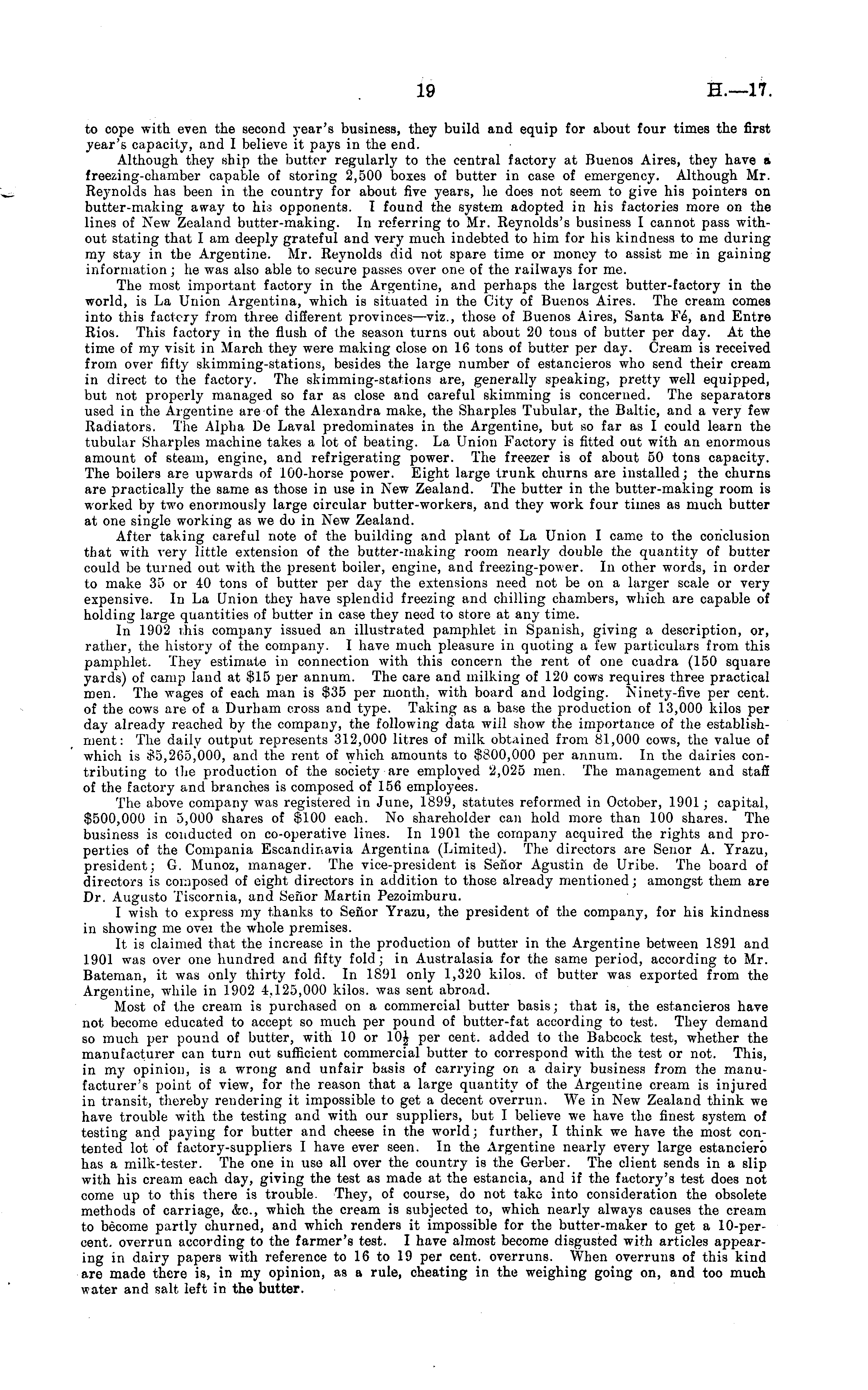 to cope with even the second year's business, they build and equip for about four times the first year's capacity, and I believe it pays in the end. Although they ship the butter regularly to the central factory at Buenos Aires, they have a freezing-chamber capable of storing 2,500 boxes of butter in case of emergency. Although Mr. Rej : nolds has been in the country for about five years, lie does not seem to give his pointers on butter-making away to his opponents. I found the system adopted in his factories more on the lines of New Zealand butter-making. In referring to Mr. Reynolds's business I cannot pass without stating that I am deeply grateful and very much indebted to him for his kindness to me during my stay in the Argentine. Mr. Reynolds did not spare time or money to assist me in gaining information; he was also able to secure passes over one of the railways for me. The most important factory in the Argentine, and perhaps the largest butter-factory in the world, is La Union Argentina, which is situated in the City of Buenos Aires. The cream comes into this factory from three different provinces—viz., those of Buenos Aires, Santa Fe , , and Entre Rios. This factory in the flush of the season turns out about 20 tons of butter per day. At the time of my visit in March they were making close on 16 tons of butter per day. Cream is received from over fifty skimming-stations, besides the large number of estancieros who send their cream in direct to the factory. The skimming-stations are, generally speaking, pretty well equipped, but not properly managed so far as close and careful skimming is concerned. The separators used in the Argentine are of the Alexandra make, the Sharpies Tubular, the Baltic, and a very few Radiators. The Alpha De Laval predominates in the Argentine, but so far as I could learn the tubular Sharpies machine takes a lot of beating. La Union Factory is fitted out with an enormous amount of steam, engine, and refrigerating power. The freezer is of about 50 tons capacity. The boilers are upwards of 100-horse power. Eight large trunk churns are installed; the churns are practically the same as those in use in New Zealand. The butter in the butter-making room is worked by two enormously large circular butter-workers, and they work four times as much butter at one single working as we do in New Zealand. After taking careful note of the building and plant of La Union I came to the conclusion that with very little extension of the butter-making room nearly double the quantity of butter could be turned out with the present boiler, engine, and freezing-power. In other words, in order to make 35 or 40 tons of butter per day the extensions need not be on a larger scale or very expensive. In La Union they have splendid freezing and chilling chambers, which are capable of holding large quantities of butter in case they need to store at any time. In 1902 this company issued an illustrated pamphlet in Spanish, giving a description, or, rather, the history of the company. I have much pleasure in quoting a few particulars from this pamphlet. They estimate in connection with this concern the rent of one cuadra (150 square yards) of camp land at $15 per annum. The care and milking of 120 cows requires three practical men. The wages of each man is $35 per month., with board and lodging. Ninety-five per cent, of the cows are of a Durham cross and type. Taking as a base the production of 13,000 kilos per day already reached by the company, the following data will show the importance of the establishment: The daily output represents 312,000 litres of milk obtained from 81,000 cows, the value of which is $5,265,000, and the rent of which amounts to $800,000 per annum. In the dairies contributing to the production of the society are employed 2,025 men. The management and staff of the factory and branches is composed of 156 employees. The above company was registered in June, 1899, statutes reformed in October, 1901 ; capital, $500,000 in 5,000 shares of $100 each. No shareholder can hold more than 100 shares. The business is conducted on co-operative lines. In 1901 the company acquired the rights and properties of the Compania Escandmavia Argentina (Limited). The directors are Senor A. Yrazu, president; G. Munoz, manager. The vice-president is Senor Agustin de Uribe. The board of directors is composed of eight directors in addition to those already mentioned; amongst them are Dr. Augusto Tiscornia, and Senor Martin Pezoimburu. I wish to express my thanks to Seiior Yrazu, the president of the company, for his kindness in showing me ovei the whole premises. It is claimed that the increase in the production of butter in the Argentine between 1891 and 1901 was over one hundred and fifty fold; in Australasia for the same period, according to Mr. Bateman, it was only thirty fold. In 1891 only 1,320 kilos, of butter was exported from the Argentine, while in 1902 4,125,000 kilos, was sent abroad. Most of the cream is purchased on a commercial butter basis; that is, the estancieros have not become educated to accept so much per pound of butter-fat according to test. They demand so much per pound of butter, with 10 or lOjjt per cent, added to the Babcock test, whether the manufacturer can turn out sufficient commercial butter to correspond with the test or not. This, in my opinion, is a wrong and unfair basis of carrying on a dairy business from the manufacturer's point of view, for the reason that a large quantity of the Argentine cream is injured in transit, thereby rendering it impossible to get a decent overrun. We in New Zealand think we have trouble with the testing and with our suppliers, but I believe we have the finest system of testing and paying for butter and cheese in the world; further, I think we have the most contented lot of factory-suppliers I have ever seen. In the Argentine nearly every large estanciero has a milk-tester. The one in use all over the country is the Gerber. The