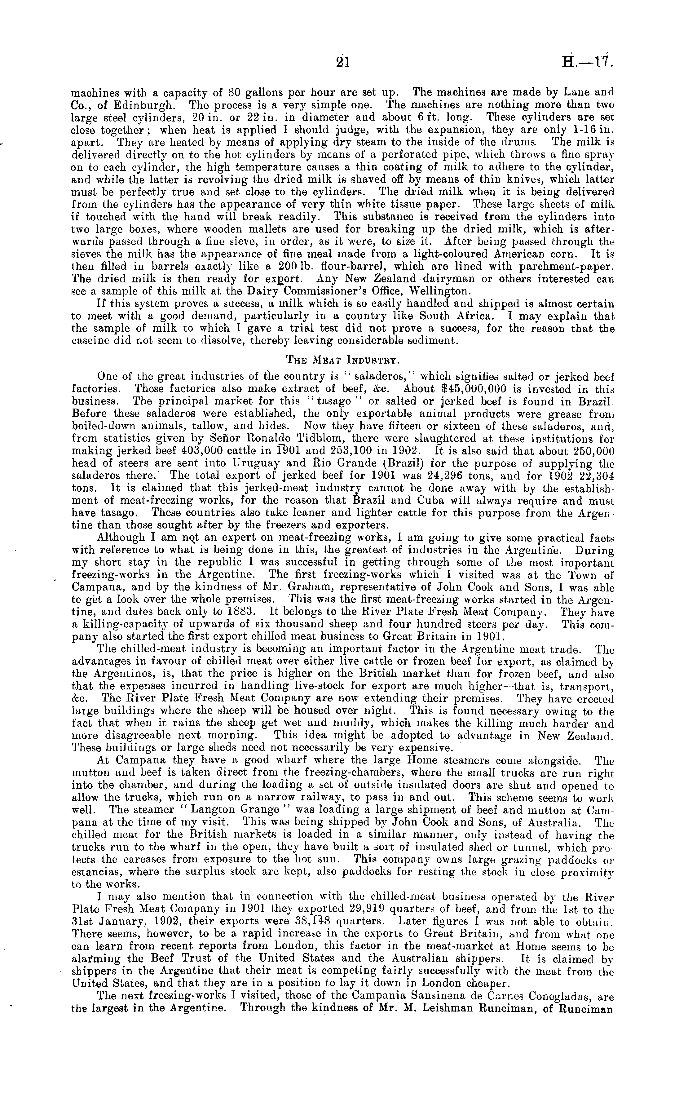 machines with a capacity of 80 gallons per hour are set up. The machines are made by Lane and Co., of Edinburgh. The process is a very simple one. The machines are nothing more than two large steel cylinders, 20 in. or 22 in. in diameter and about 6 ft. long. These cylinders are set close together; when heat is applied I should judge, with the expansion, they are only 1-16 in. apart. They are heated by means of applying dry steam to the inside of the drums. The milk is delivered directly on to the hot cylinders by means of a perforated pipe, which throws a fine spray on to each cylinder, the high temperature causes a thin coating of milk to adhere to the cylinder, and while the latter is revolving the dried milk is shaved off by means of thin knives, which latter must be perfectly true and set close to the cylinders. The dried milk when it is being delivered from the cylinders has the appearance of very thin white tissue paper. These large sheets of milk if touched with the hand will break readily. This substance is received from the cylinders into two large boxes, where wooden mallets are used for breaking up the dried milk, which is afterwards passed through a fine sieve, iv order, as it were, to size it. After being passed through the sieves the milk has the appearance of fine meal made from a light-coloured American corn. It is then filled in barrels exactly like a 200 lb. flour-barrel, which are lined with parchment-paper. The dried milk is then ready for export. Any New Zealand dairyman or others interested can see a sample of this milk at the Dairy Commissioner's Office, Wellington. If this system proves a success, a milk which is so easily handled and shipped is almost certain to meet with a good demand, particularly in a country like South Africa. I may explain that the sample of milk to which I gave a trial test did not prove a success, for the reason that the caseine did not seem to dissolve, thereby leaving considerable sediment. The Meat Industry. One of the great industries of the country is " saladeros," which signifies salted or jerked beef factories. These factories also make extract of beef, &o. About $45,000,000 is invested in this business. The principal market for this " tasago " or salted or jerked beef is found in Brazil. Before these saladeros were established, the only exportable animal products were grease from boiled-down animals, tallow, and hides. Now they have fifteen or sixteen of these saladeros, and, frcm statistics given by Sefior Ronaldo Tidblom, there were slaughtered at these institutions for making jerked beef 403,000 cattle in 1~901 and 253,100 in 1902. It is also said that about 250,000 head of steers are sent into Uruguay and Rio Grande (Brazil) for the purpose of supplying the saladeros there.' The total export of jerked beef for 1901 was 24,296 tons, and for 1902 22,304 tons. It is claimed that this jerked-meat industry cannot be done away with by the establishment of meat-freezing works, for the reason that Brazil and Cuba will always require and must have tasago. These countries also take leaner and lighter cattle for this purpose from the Argon ■ tine than those sought after by the freezers and exporters. Although I am nqt an expert on meat-freezing works, I am going to give some practical facts with reference to what is being done in this, the greatest of industries in the Argentine. During my short stay in the republic I was successful in getting through some of the most important freezing-works in the Argentine. The first freezing-works which I visited was at the Town of Campana, and by the kindness of Mr. Graham, representative of John Cook and Sons, I was able to get a look over the whole premises. This was the first meat-freezing works started in the Argentine, and dates back only to 1883. It belongs to the River Plate Fresh Meat Company. They have a killing-capacity of upwards of six thousand sheep and four hundred steers per day. This company also started the first export chilled meat business to Great Britain in 1901. The chilled-meat industry is becoming an important factor in the Argentine meat trade. The advantages in favour of chilled meat over either live cattle or frozen beef for export, as claimed by the Argentinos, is, that the price is higher on the British market than for frozen beef, and also that the expenses incurred in handling live-stock for export are much higher—that is, transport, &c. The River Plate Fresh Meat Company are now extending their premises. They have erected large buildings where the sheep will be housed over night. This is found necessary owing to the fact that when it rains the sheep get wet and muddy, which makes the killing much harder and more disagreeable next morning. This idea might be adopted to advantage in New Zealand. These buildings or large sheds need not necessarily be very expensive. At Campana they have a good wharf where the large Home steamers come alongside. The mutton and beef is taken direct from the freezing-chambers, where the small trucks are run right into the chamber, and during the loading a set of outside insulated doors are shut and opened to allow the trucks, which run on a narrow railway, to pass in and out. This scheme seems to work well. The steamer " Langton Grange " was loading a large shipment of beef and mutton at Campana at the time of my visit. This was being shipped by John Cook and Sons, of Australia. The chilled meat for the British markets is loaded in a similar manner, only instead of having the trucks run to the wharf in the open, they have built a sort of insulated shed or tunnel, wdiich protects the carcases from exposure to the hot sun. This company owns large grazing paddocks or estancias, where the surplus stock are kept, also paddocks for resting the stock in close proximity to the works. I may also mention that in connection with the chilled-meat business operated by the River Plato Fresh Meat Company in 1901 they exported 29,919 quarters of beef, 