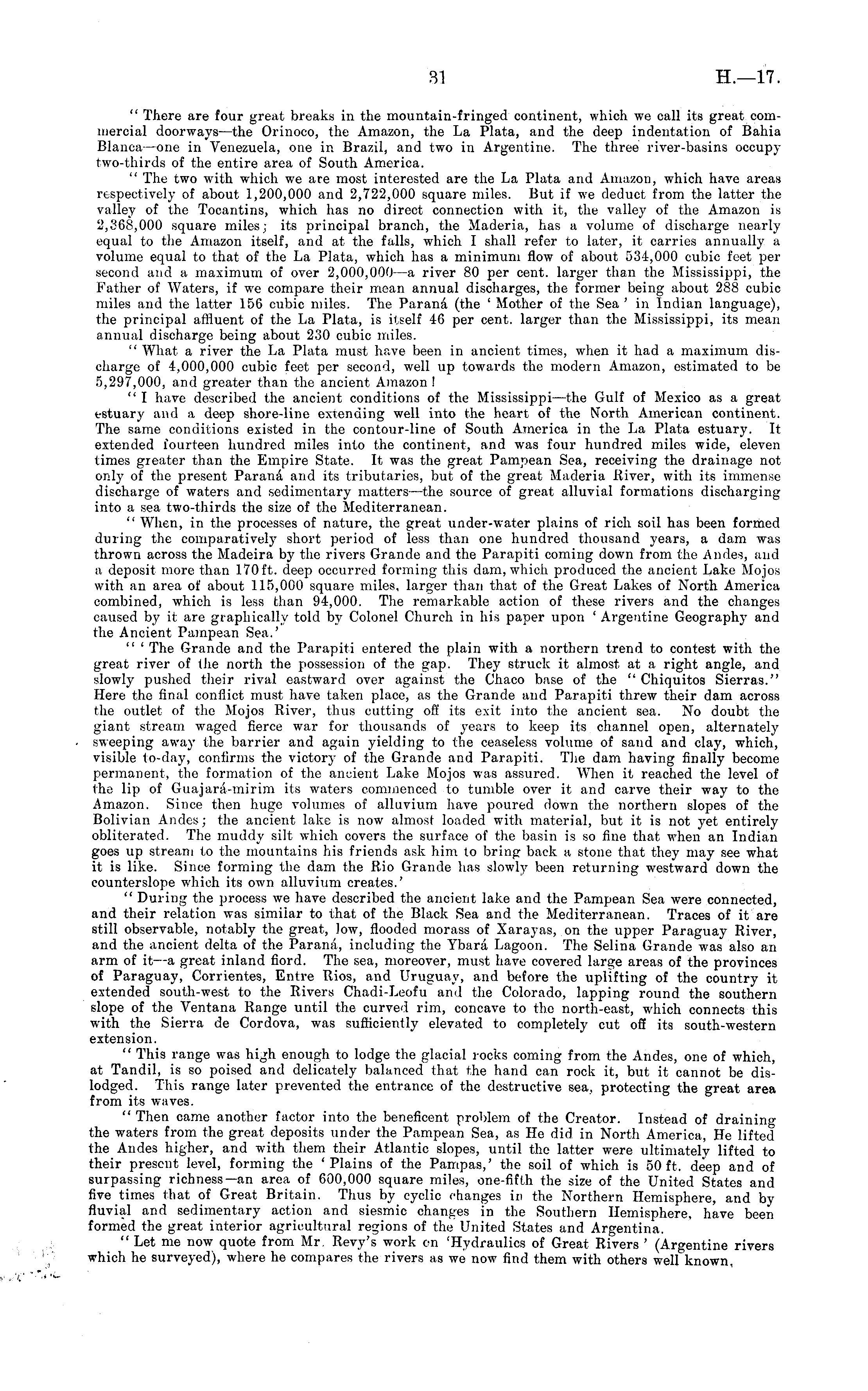 " There are four great breaks in the mountain-fringed continent, which we call its great commercial doorways —the Orinoco, the Amazon, the La Plata, and the deep indentation of Bahia Blanca —one in Venezuela, one in Brazil, and two in Argentine. The three river-basins occupy two-thirds of the entire area of South America. " The two with which we are most interested are the La Plata and Amazon, which have areas respectively of about 1,200,000 and 2,722,000 square miles. But if we deduct from the latter the valley of the Tocantins, which has no direct connection with it, the valley of the Amazon is 2,368,000 square miles; its principal branch, the Maderia, has a volume of discharge nearly equal to the Amazon itself, and at the falls, which I shall refer to later, it carries annually a volume equal to that of the La Plata, which has a minimum flow of about 534,000 cubic feet per second and a maximum of over 2,000,000 —a river 80 per cent, larger than the Mississippi, the Father of Waters, if we compare their mean annual discharges, the former being about 288 cubic miles and the latter 156 cubic miles. The Parana (the ' Mother of the Sea 'in Indian language), the principal affluent of the La Plata, is itself 46 per cent, larger than the Mississippi, its mean annual discharge being about 230 cubic miles. " What a river the La Plata must have been in ancient times, when it had a maximum discharge of 4,000,000 cubic feet per second, well up towards the modern Amazon, estimated to be 5,297,000, and greater than the ancient Amazon ! " I have described the ancient conditions of the Mississippi —the Gulf of Mexico as a great estuary and a deep shore-line extending well into the heart of the North American continent. The same conditions existed in the contour-line of South America in the La Plata estuary. It extended fourteen hundred miles into the continent, and was four hundred miles wide, eleven times greater than the Empire State. It was the great Pampean Sea, receiving the drainage not only of the present Parana and its tributaries, but of the great Maderia River, with its immense discharge of waters and sedimentary matters —the source of great alluvial formations discharging into a sea two-thirds the size of the Mediterranean. " When, in the processes of nature, the great under-water plains of rich soil has been formed during the comparatively short period of less than one hundred thousand years, a dam was thrown across the Madeira by the rivers Grande and the Parapiti coming down from the Andes, and a deposit more than 170 ft. deep occurred forming this dam, which produced the ancient Lake Mojos with an area of about 115,000 square miles, larger than that of the Great Lakes of North America combined, which is less than 94,000. The remarkable action of these rivers and the changes caused by it are graphically told by Colonel Church in his paper upon ' Argentine Geography and the Ancient Pampean Sea.' " ' The Grande and the Parapiti entered the plain with a northern trend to contest with the great river of the north the possession of the gap. They struck it almost at a right angle, and slowly pushed their rival eastward over against the Chaco base of the " Chiquitos Sierras." Here the final conflict must have taken place, as the Grande and Parapiti threw their dam across the outlet of the Mojos River, thus cutting off its exit into the ancient sea. No doubt the giant stream waged fierce war for thousands of years to keep its channel open, alternately sweeping away the barrier and again yielding to the ceaseless volume of sand and clay, which, visible to-day, confirms the victory of the Grande and Parapiti. The dam having finally become permanent, the formation of the ancient Lake Mojos was assured. When it reached the level of the lip of Guajara-mirim its waters commenced to tumble over it and carve their way to the Amazon. Since then huge volumes of alluvium have poured down the northern slopes of the Bolivian Andes; the ancient lake is now almost loaded with material, but it is not yet entirely obliterated. The muddy silt which covers the surface of the basin is so fine that when an Indian goes up stream to the mountains his friends ask him to bring back a stone that they may see what it is like. Since forming the dam the Rio Grande has slowly been returning westward down the counterslope which its own alluvium creates.' " During the process we have described the ancient lake and the Pampean Sea were connected, and their relation was similar to that of the Black Sea and the Mediterranean. Traces of it are still observable, notably the great, low, flooded morass of Xarayas, on the upper Paraguay River, and the ancient delta of the Parana, including the Ybara Lagoon. The Selina Grande was also an arm of it —a great inland fiord. The sea, moreover, must have covered large areas of the provinces of Paraguay, Corrientes, Entre Rios, and Uruguay, and before the uplifting of the country it extended south-west to the Rivers Chadi-Leofu and the Colorado, lapping round the southern slope of the Ventana Range until the curved rim, concave to the north-east, which connects this with the Sierra de Cordova, was sufficiently elevated to completely cut off its south-western extension. " This range was high enough to lodge the glacial rocks coming from the Andes, one of which, at Tandil, is so poised and delicately balanced that the hand can rock it, but it cannot be dislodged. This range later prevented the entrance of the destructive sea, protecting the great area from its waves. " Then came another factor into the beneficent problem of the Creator. Instead of draining the waters from the great deposits under the Pampean Sea, as He did. in North America, He lifted the Andes higher, and with them their Atlantic slopes, until the latter were ultimately lifted to their present level, forming the 'Plains of the Pampas,' the soil of which is 50ft. deep and of surpassing richness—an area of 600,000 