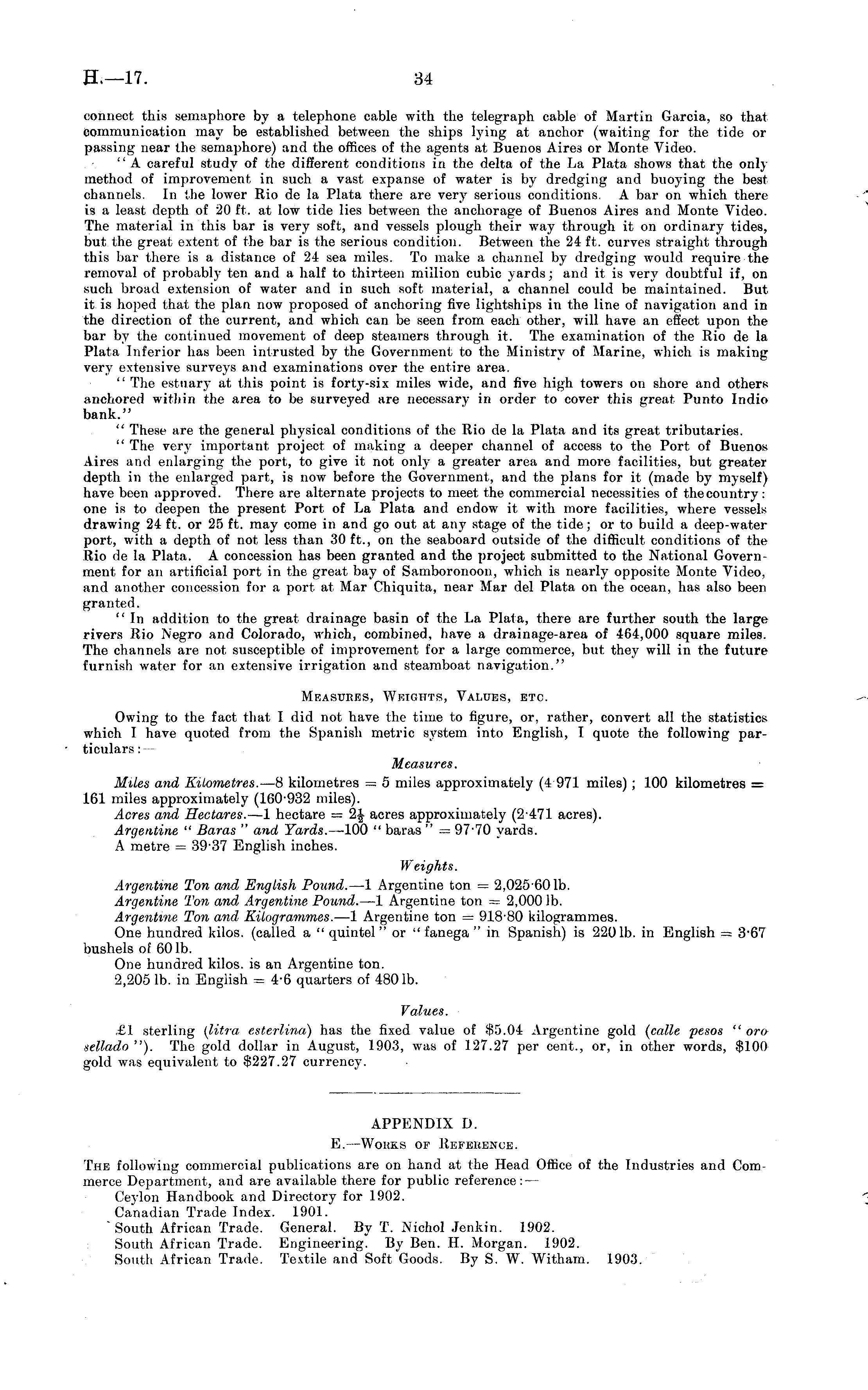 connect this semaphore by a telephone cable with the telegraph cable of Martin Garcia, so that communication may be established between the ships lying at anchor (waiting for the tide or passing near the semaphore) and the offices of the agents at Buenos Aires or Monte Video. " A careful study of the different conditions in the delta of the La Plata shows that the only method of improvement in such a vast expanse of water is by dredging and buoying the best channels. In the lower Rio de la Plata there are very serious conditions. A bar on which there is a least depth of 20 ft. at low tide lies between the anchorage of Buenos Aires and Monte Video. The material in this bar is very soft, and vessels plough their way through it on ordinary tides, but the great extent of the bar is the serious condition. Between the 24 ft. curves straight through this bar there is a distance of 24 sea miles. To make a channel by dredging would require the removal of probably ten and a half to thirteen million cubic yards; and it is very doubtful if, on such broad extension of water and in such soft material, a channel could be maintained. But it is hoped that the plan now proposed of anchoring five lightships in the line of navigation and in the direction of the current, and which can be seen from each other, will have an effect upon the bar by the continued movement of deep steamers through it. The examination of the Rio de la Plata Inferior has been intrusted by the Government to the Ministry of Marine, which is making very extensive surveys and examinations over the entire area. " The estuary at this point is forty-six miles wide, and five high towers on shore and others anchored within the area to be surveyed are necessary in order to cover this great Punto Indio bank." " These are the general physical conditions of the Rio de la Plata and its great tributaries. " The very important project of making a deeper channel of access to the Port, of Buenos Aires and enlarging the port, to give it not only a greater area and more facilities, but greater depth in the enlarged part, is now before the Government, and the plans for it, (made by myself) have been approved. There are alternate projects to meet the commercial necessities of the country: one is to deepen the present Port of La Plata and endow it with more facilities, where vessels drawing 24 ft. or 25 ft. may come in and go out at any stage of the tide; or to build a deep-water port, with a depth of not less than 30 ft., on the seaboard outside of the difficult conditions of the Rio de la Plata. A concession has been granted and the project submitted to the National Government for an artificial port in the great, bay of Samboronoon, which is nearly opposite Monte Video, and another concession for a port at Mar Chiquita, near Mar del Plata on the ocean, has also been granted. " In addition to the great drainage basin of the La Plata, there are further south the large rivers Rio Negro and Colorado, which, combined, have a drainage-area of 464,000 square miles. The channels are not susceptible of improvement for a large commerce, but they will in the future furnish water for an extensive irrigation and steamboat navigation." Measures, Weights, Values, etc. Owing to the fact that I did not have the time to figure, or, rather, convert all the statistics which I have quoted from the Spanish metric system into English, I quote the following particulars : — Measures. Miles and Kilometres. —8 kilometres = 5 miles approximately (4 971 miles) ; 100 kilometres = 161 miles approximately (160-932 miles). Acres and Hectares. —1 hectare =2J acres approximately (2471 acres). Argentine " Baras " and Yards. —loo " baras " = 9770 yards. A metre = 39-37 English inches. Weights. Argentine Ton and English Pound. —l Argentine ton = 2,025601b. Argentine Ton and Argentine Pound. —l Argentine ton = 2,000 lb. Argentine Ton and Kilogrammes. —1 Argentine ton = 918-80 kilogrammes. One hundred kilos, (called a " quintel" or " fanega "in Spanish) is 2201b. in English = 3-67 bushels of 601b. One hundred kilos, is an Argentine ton. 2,205 lb. in English = 4-6 quarters of 480 lb. Values. £1 sterling (litra esterlina) has the fixed value of $5.04 Argentine gold (calle pesos " ora sellado "). The gold dollar in August, 1903, was of 127.27 per cent., or, in other words, $100 gold was equivalent to $227.27 currency.