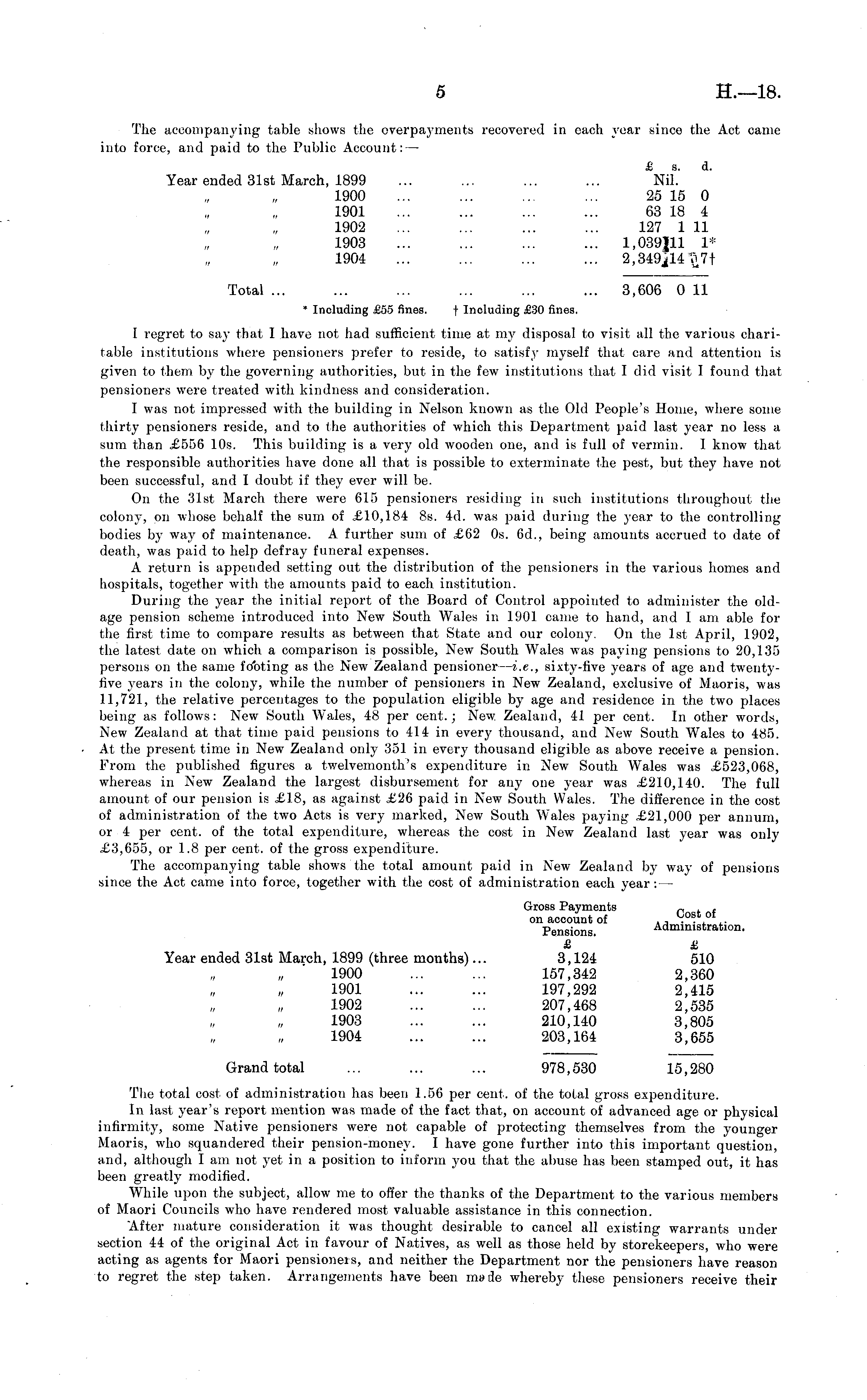 The accompanying table shows the overpajments recovered in each year since the Act came into force, and paid to the Public Account: — £ s. d. Year ended 31st March, 1899 ... ... ... ... Nil. 1900 ... ... ... ... 25 15 0 1901 ... ... ... ... 63 18 4 1902 ... ... ... ... 127 1 11 1903 1,039|11 1* 1904 2,349i14'07t Total ... ... ... ... ... ... 3,606 011 * Including £55 fines. f Including £30 fines. I regret to say that I have not had sufficient time at my disposal to visit all the various charitable institutions where pensioners prefer to reside, to satisfy myself that care and attention is given to them by the governing authorities, but in the few institutions that I did visit I found that pensioners were treated with kindness and consideration. I was not impressed with the building in Nelson known as the Old People's Home, where some thirty pensioners reside, and to the authorities of which this Department paid last year no less a sum than £556 10s. This building is a very old wooden one, and is full of vermin. I know that the responsible authorities have done all that is possible to exterminate the pest, but they have not been successful, and I doubt if they ever will be. On the 31st March there were 615 pensioners residing in such institutions throughout the colony, on whose behalf the sum of £10,184 Bs. 4d. was paid during the year to the controlling bodies by way of maintenance. A further sum of £62 os. 6d., being amounts accrued to date of death, was paid to help defray funeral expenses. A return is appended setting out the distribution of the pensioners in the various homes and hospitals, together with the amounts paid to each institution. During the year the initial report of the Board of Control appointed to administer the oldage pension scheme introduced into New South Wales in 1901 came to hand, and I am able for the first time to compare results as between that State and our colony. On the Ist April, 1902, the latest date on which a comparison is possible, New South Wales was paying pensions to 20,135 persons on the same footing as the New Zealand pensioner— i.e., sixty-five years of age and twentyfive years in the colony, while the number of pensioners in New Zealand, exclusive of Maoris, was 11,721, the relative percentages to the population eligible by age and residence in the two places being as follows: New South Wales, 48 per cent.; New Zealand, 41 per cent. In other words, New Zealand at that time paid pensions to 414 in every thousand, and New South Wales to 485. At the present time in New Zealand only 351 in every thousand eligible as above receive a pension. From the published figures a twelvemonth's expenditure in New South Wales was £523,068, whereas in New Zealand the largest disbursement for any one year was £210,140. The full amount of our pension is £18, as against £26 paid in New South Wales. The difference in the cost of administration of the two Acts is very marked, New South Wales paying £21,000 per annum, or 4 per cent, of the total expenditure, whereas the cost in New Zealand last year was only £3,655, or 1.8 per cent, of the gross expenditure. The accompanying table shows the total amount paid in New Zealand by way of pensions since the Act came into force, together with the cost of administration each year: — Gross Payments „ , on account of ~ V*?' 0 ' . Pensions. Administration. £ £ Year ended 31st March, 1899 (three months)... 3,124 510 1900 157,342 2,360 1901 ... ... 197,292 2,415 1902 ... ... 207,468 2,535 1903 210,140 3,805 1904 ... ... 203,164 3,655 Grand total ... ... ... 978,530 15,280 The total cost of administration has been 1.56 per cent, of the total gross expenditure. In last year's report mention was made of the fact that, on account of advanced age or physical infirmity, some Native pensioners were not capable of protecting themselves from the younger Maoris, who squandered their pension-money. I have gone further into this important question, and, although I am not yet in a position to inform you that the abuse has been stamped out, it has been greatly modified. While upon the subject, allow me to offer the thanks of the Department to the various members of Maori Councils who have rendered most valuable assistance in this connection. After mature consideration it was thought desirable to cancel all existing warrants under section 44 of the original Act in favour of Natives, as well as those held by storekeepers, who were acting as agents for Maori pensioners, and neither the Department nor the pensioners have reason to regret the step taken. Arrangements have been made whereby these pensioners receive their
