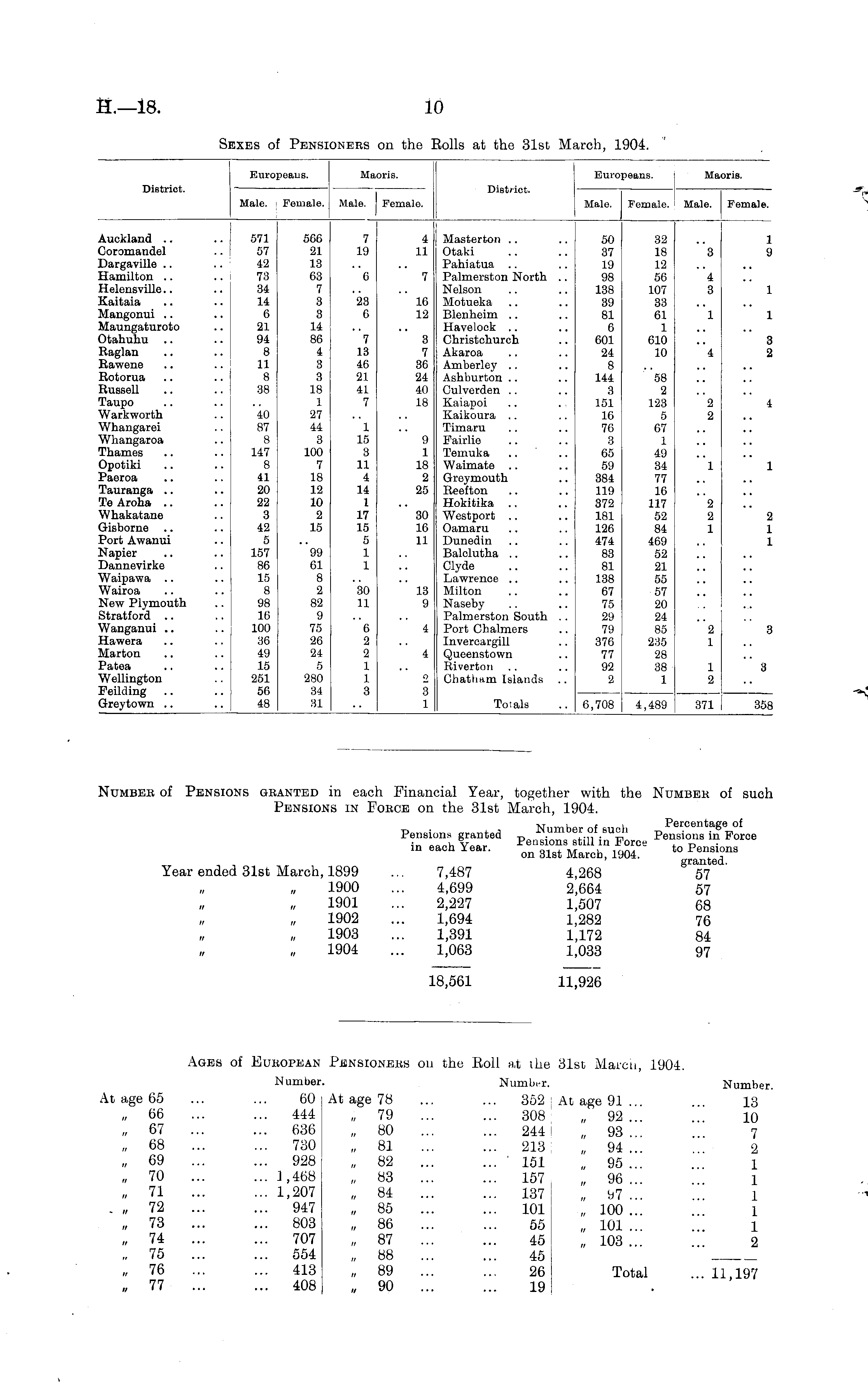 Sexes of Pensioners on the lolls at the 31st M ,rch, 1904. ■1 District. Europeans. Male. Female. Maoris. District. Europeans. Maoris. Male. Female. Male. Female. Male. Female. Auckland .. Coromandel Dargaville .. Hamilton .. Helensville.. Kaitaia Mangonui .. Maungaturoto Otahuhu Raglan Eawene Rotorua Russell Taupo Warkworth Whangarei Whangaroa Thames Opotiki Paeroa Tauranga .. Te Aroha .. Whakatane Gisbome Port Awanui Napier Dannevirke Waipawa .. Wairoa New Plymouth Stratford .. Wanganui .. Hawera Marton Patea Wellington Feilding Greytown .. 571 57 42 73 34 14 6 21 94 8 11 8 38 566 21 13 63 7 3 3 14 86 4 3 3 18 1 27 44 3 100 7 18 12 10 2 15 7 19 4 11 Masterton Otaki Pahiatua Palmerston North .. Nelson Motueka Blenheim Havelock Christchurch Akaroa Amberley Ashburton Culverden Kaiapoi Kaikoura Timaru Pairlie Temuka Waimate Greymouth Reefton Hokitika Westport Oamaru Dunedin Balclutha Clyde Lawrence Milton Naseby Palmerston South .. Port Chalmers Invercargill Queenstown Riverton Chatham Islands 50 37 19 98 138 39 81 6 601 24 8 144 3 151 16 76 3 65 59 384 119 372 181 126 474 83 81 138 67 75 29 79 376 77 92 2 32 18 12 56 107 33 61 1 610 10 "3 1 9 "c 7 4 3 23 0 1 16 12 1 1 7 13 46 21 41 7 3 7 36 24 40 18 58 2 123 5 67 1 49 34 77 16 117 52 84 469 52 21 55 57 20 24 85 235 28 38 1 4 3 2 40 87 8 147 8 41 20 22 3 42 5 157 86 15 8 98 16 100 36 49 15 251 56 48 2 2 4 1 15 3 11 4 14 1 17 15 5 1 1 9 1 18 2 25 1 2 2 1 1 30 16 11 2 1 1 99 61 8 2 82 9 75 26 24 5 280 34 31 30 11 G 2 2 1 1 3 13 9 "2 1 4 3 4 1 2 3 o 3 1 6,708 4,489 371 I 358 Totals Number of Pensions granted in each Financial Year, together with the Number of such Pensions in Force on the 31st March, 1904. Pensions granted £*£&£* in each Year. oq to Pensions Year ended 31st March, 1899 ... 7,487 4,268 57° 1900 ... 4,699 2,664 57 1901 ... 2,227 1,507 68 1902 ... 1,694 1,282 76 1903 ... 1,391 1,172 84 1904 ... 1,063 1,033 97 18,561 11,926 Ages of European Pensioners ou the Roll at the 31st March, 1904. Number. Number. Numbor. At age 65 ... ... 60 At age 78 ... ... 862 I At age 91 ... ... 13 » 66 ... ... 444 „ 79 ... ... 308 „ 92... 10 „ 67 ... ... 636 „ 80 ... ... 244 93 ' ' 7 „ 68 730 „ 81 213 „ 94 ... 2 „ 69 928 „ 82 ' 151 „ 95 . 1 „ 70 1,468 „ 83 157 „ 96 . 1 „ 71 1,207 „ 84 137 ! „ 97 1 - „ 72 947 „ 85 101 „ 100 ... 1 „ 73 803 „ 86 55 „ 101 1 „ 74 707 „ 87 45 „ 103 ... 2 „ 75 ... ... 554 „ 88 ... ... 45 „ 76 413 „ 89 26 Total ... 11,197 „ 77 408 „ 90 19 |