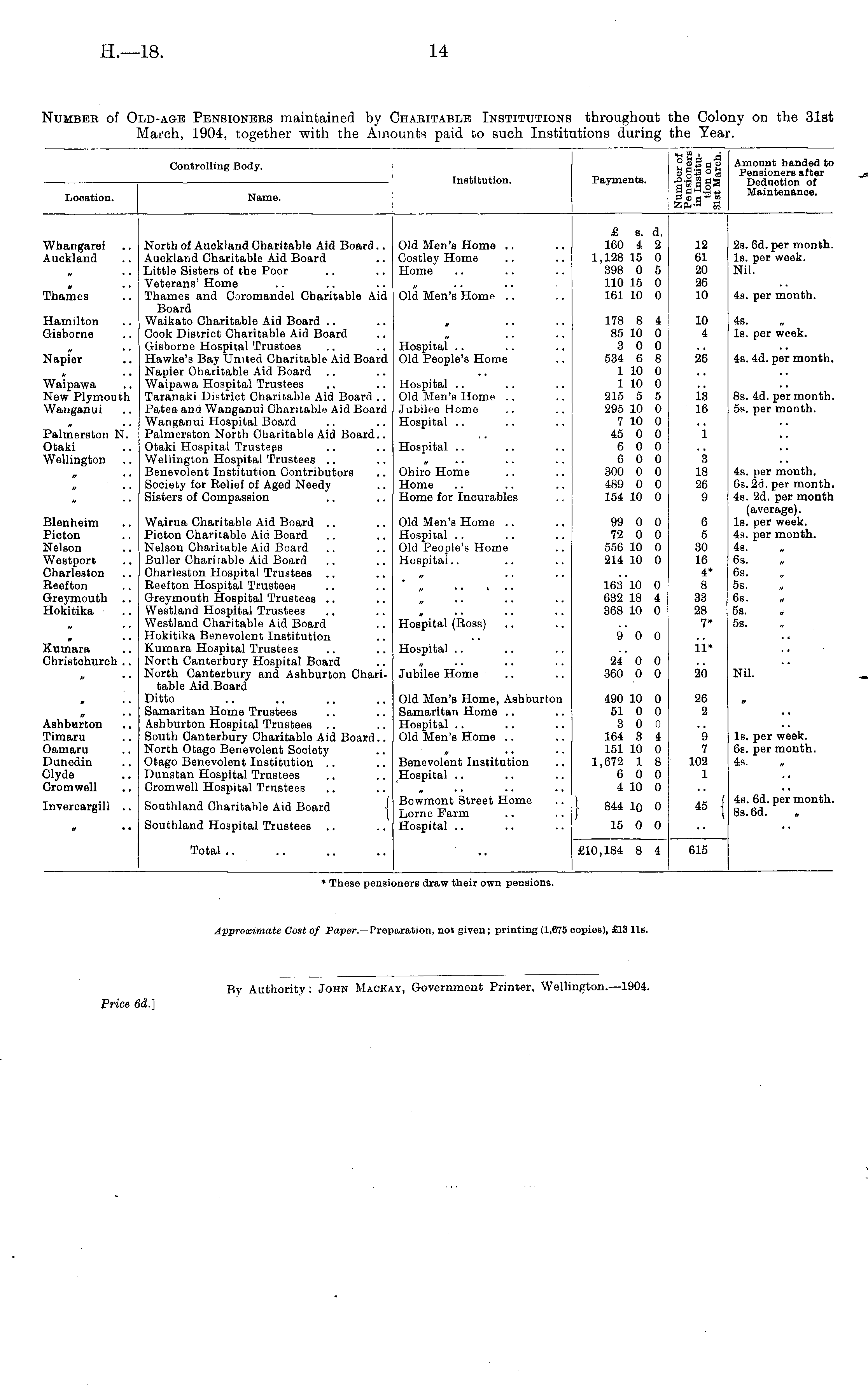 Controlling Body. Institution. Payments. •°° S as as5.s2 55(V a 53 Amount handed t< Pensioners after Deduction of Maintenance. Location. Name. Whangarei Auckland North of Auckland Charitable Aid Board.. Auckland Charitable Aid Board Little Sisters of the Poor Veterans' Home Thames and Coromandel Charitable Aid Board Waikato Charitable Aid Board Cook District Charitable Aid Board Gisborne Hospital Trustees Hawke's Bay United Charitable Aid Board Napier Charitable Aid Board Waipawa Hospital Trustees Taranaki District Charitable Aid Board .. Patea and Wanganui Charitable Aid Board Wanganui Hospital Board Palmerston North Charitable Aid Board.. Otaki Hospital Trustees Wellington Hospital Trustees Benevolent Institution Contributors Society for Relief of Aged Needy Sisters of Compassion Old Men's Home Costley Home Home £ s. d. 160 4 2 1,128 15 0 398 0 5 110 15 0 161 10 0 12 61 20 26 10 2s. 6d. per month. Is. per week. Nil. Thames Old Men's Home 4s. per month. Hamilton Gisborne Napier Waipawa New Plymouth Wanganui Hospital Old People's Home Hospital Old Men's Home Jubilee Home Hospital 178 8 4 85 10 0 3 0 0 534 6 8 1 10 0 1 10 0 215 5 5 295 10 0 7 10 0 45 0 0 6 0 0 6 0 0 300 0 0 489 0 0 154 10 0 10 4 26 i3 16 4s. Is. per week. 4s. 4d. per month. 8s. 4d. per month. 5s. per mouth. Palmerston N. Otaki Wellington 1 Hospital 3 18 26 9 u •. Ohiro Home Home Home for Incurables 4s. per month. 6s. 2d. per month. 4s. 2d. per month (average). Is. per week. 4s. per month. 4s. 6s. 6s. 5s. 6s. 5s. 5s. Blenheim Picton Nelson Westport Charleston Reefton Greymouth Hokitika Wairua Charitable Aid Board Picton Charitable Aid Board Nelson Charitable Aid Board Buller Charitable Aid Board Charleston Hospital Trustees Reefton Hospital Trustees Greymouth Hospital Trustees Westland Hospital Trustees Westland Charitable Aid Board Hokitika Benevolent Institution Kumara Hospital Trustees North Canterbury Hospital Board North Canterbury and Ashburton Charitable Aid Board Ditto Samaritan Home Trustees Ashburton Hospital Trustees South Canterbury Charitable Aid Board.. North Otago Benevolent Society Otago Benovolent Institution Dunstan Hospital Trustees Cromwell Hospital Trustees Southland Charitable Aid Board j Southland Hospital Trustees Old Men's Home Hospital Old People's Home Hospital.. 99 0 0 72 0 0 556 10 0 214 10 0 6 5 30 16 4* 8 33 28 7* 163 10 0 632 18 4 368 10 0 Hospital (Ross) 9 0 0 Kumara Christchurch .. Hospital ii* Jubilee Home 24 0 0 360 0 0 20 Nil. Old Men's Home, Ashburton Samaritan Home Hospital Old Men's Home 490 10 0 51 0 0 3 0 0 164 3 4 151 10 0 1,672 1 8 6 0 0 4 10 0 26 2 Ashburton Timaru Oamaru Dunedin Clyde Cromwell Benevolent Institution Hospital 9 7 102 1 Is. per week. 6s. per month. 4s. Invercargill .. Bowmont Street Home Lome Farm Hospital 1 844 lo 0 45 | 4s. 6d. per month. 8s. 6d. * .. 15 0 0 Total £10,184 8 4 615 * These tensii ►ners draw their own lensions.