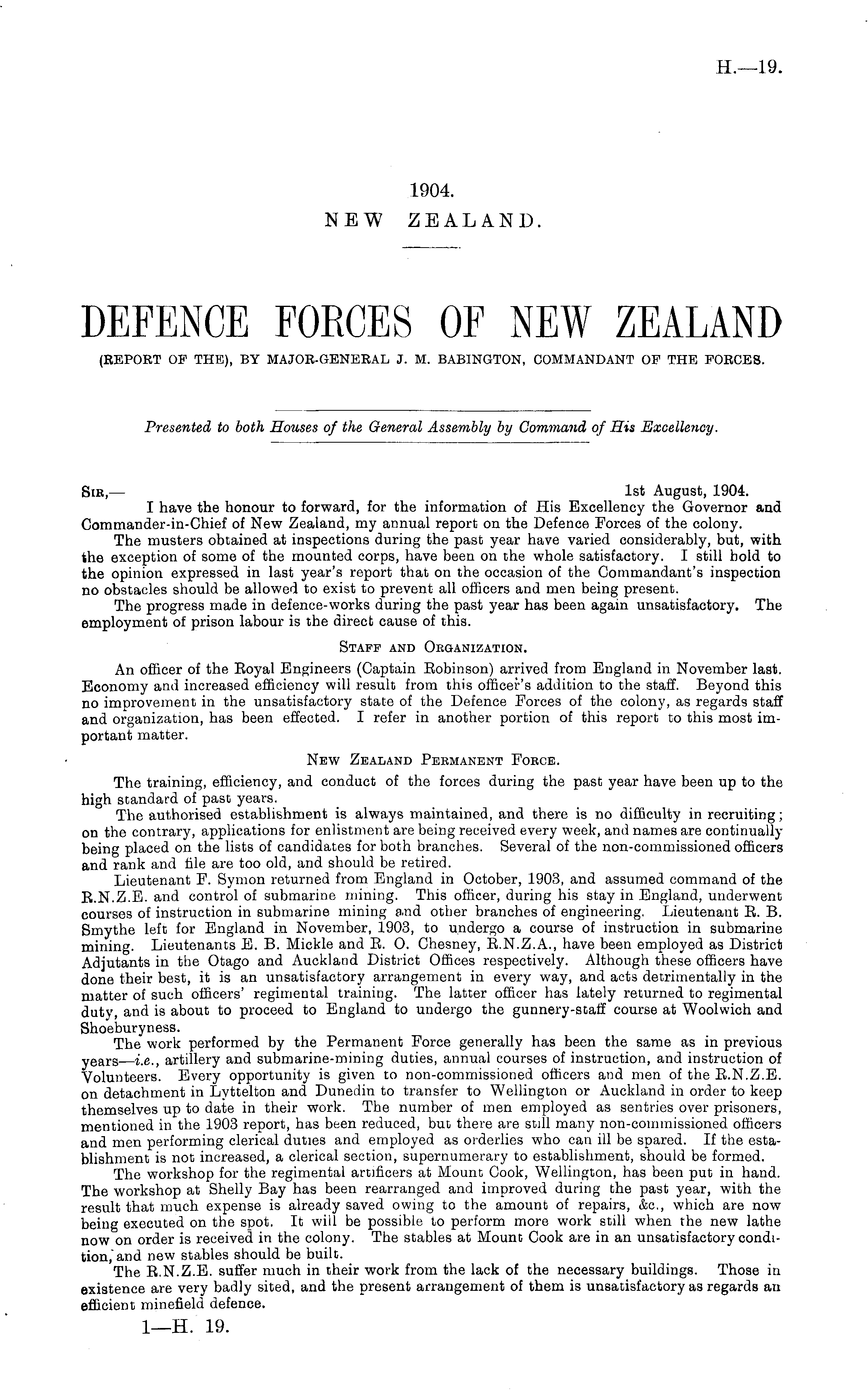 Sib,— Ist August, 1904. I have the honour to forward, for the information of His Excellency the Governor and Commander-in-Chief of New Zealand, my annual report on the Defence Forces of the colony. The musters obtained at inspections during the past year have varied considerably, but, with the exception of some of the mounted corps, have been on the whole satisfactory. I still bold to the opinion expressed in last year's report that on the occasion of the Commandant's inspection no obstacles should be allowed to exist to prevent all officers and men being present. The progress made in defence-works during the past year has been again unsatisfactory. The employment of prison labour is the direct cause of this. Staff and Oeganization. An officer of the Royal Engineers (Captain Robinson) arrived from England in November last. Economy and increased efficiency will result from this officer's addition to the staff. Beyond this no improvement in the unsatisfactory state of the Defence Forces of the colony, as regards staff and organization, has been effected. I refer in another portion of this report to this most important matter. New Zealand Permanent Fokce. The training, efficiency, and conduct of the forces during the past year have been up to the high standard of past years. The authorised establishment is always maintained, and there is no difficulty in recruiting; on the contrary, applications for enlistment are being received every week, and names are continually being placed on the lists of candidates for both branches. Several of the non-commissioned officers and rank and file are too old, and should be retired. Lieutenant F. Symon returned from England in October, 1903, and assumed command of the R.N.Z.E. and control of submarine mining. This officer, during his stay in England, underwent courses of instruction in submarine mining a.nd other branches of engineering. Lieutenant R. B. Smythe left for England in November, 1903, to undergo a course of instruction in submarine mining. Lieutenants E. B. Mickle and R. O. Chesney, R.N.Z.A., have been employed as District Adjutants in the Otago and Auckland District Offices respectively. Although these officers have done their best, it is an unsatisfactory arrangement in every way, and acts detrimentally in the matter of such officers' regimental training. The latter officer has lately returned to regimental duty, and is about to proceed to England to undergo the gunnery-staff course at Woolwich and Shoeburyness. The work performed by the Permanent Force generally has been the same as in previous y ears — i.e., artillery and submarine-mining duties, annual courses of instruction, and instruction of Volunteers. Every opportunity is given to non-commissioned officers and men of the R.N.Z.E. on detachment in Lyttelton and Dunedin to transfer to Wellington or Auckland in order to keep themselves up to date in their work. The number of men employed as sentries over prisoners, mentioned in the 1903 report, has been reduced, but there are still many non-commissioned officers and men performing clerical duties and employed as orderlies who can ill be spared. If the establishment is not increased, a clerical section, supernumerary to establishment, should be formed. The workshop for the regimental artificers at Mount Cook, Wellington, has been put in hand. The workshop at Shelly Bay has been rearranged and improved during the past year, with the result that much expense is already saved owing to the amount of repairs, &c, which are now being executed on the spot. It will be possible to perform more work still when the new lathe now on order is received in the colony. The stables at Mount Cook are in an unsatisfactory condition," and new stables should be built. The R.N.Z.E. suffer much in their work from the lack of the necessary buildings. Those in existence are very badly sited, and the present arrangement of them is unsatisfactory as regards an efficient minefield defence. I—H. 19.