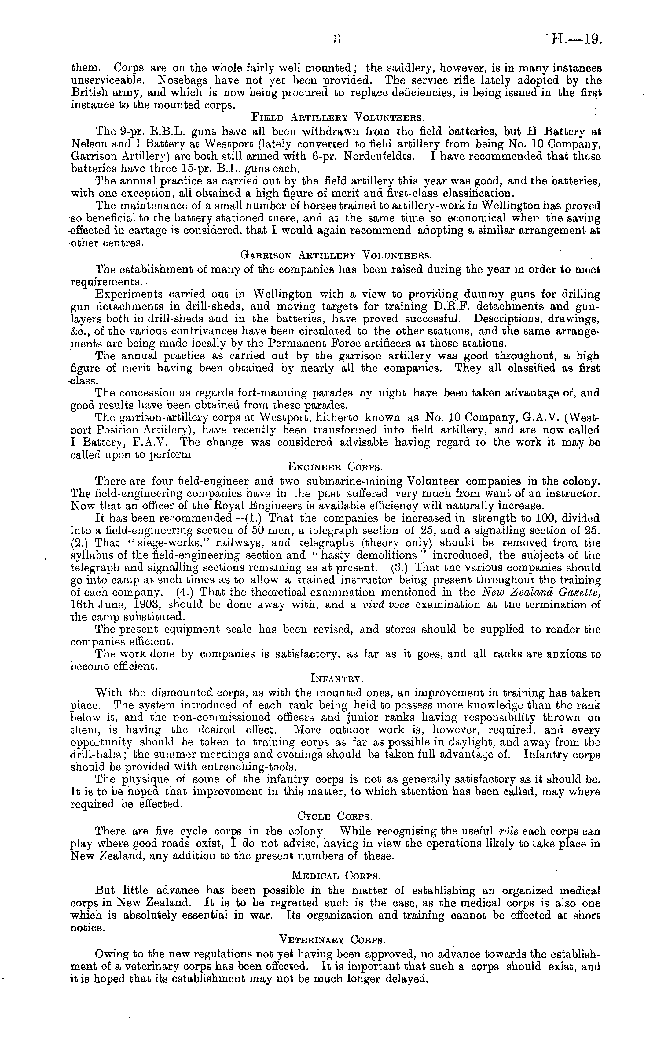 them. Corps are on the whole fairly well mounted; the saddlery, however, is in many instances unserviceable. Nosebags have not yet been provided. The service rifle lately adopted by the British army, and which is now being procured to replace deficiencies, is being issued in the first instance to the mounted corps. Field Artillery Volunteers. The 9-pr. R.B.L. guns have all been withdrawn from the field batteries, but H Battery at Nelson and I Battery at Westport (lately converted to field artillery from being No. 10 Company, Garrison Artillery) are both still armed with 6-pr. Nordenfeldts. I have recommended that these batteries have three 15-pr. B.L. guns each. The annual practice as carried out by the field artillery this year was good, and the batteries, with one exception, all obtained a high figure of merit and first-class classification. The maintenance of a small number of horses trained to artillery-work in Wellington has proved so beneficial to the battery stationed there, and at the same time so economical when the saving effected in cartage is considered, that I would again recommend adopting a similar arrangement at other centres. Garrison Artillery Volunteers. The establishment of many of the companies has been raised during the year in order to meet requirements. Experiments carried out in Wellington with a view to providing dummy guns for drilling gun detachments in drill-sheds, and moving targets for training D.R.F. detachments and gunlayers both in drill-sheds and in the batteries, have proved successful. Descriptions, drawings, &c, of the various contrivances have been circulated to the other stations, and the same arrangements are being made locally by the Permanent Force artificers at those stations. The annual practice as carried out by the garrison artillery was good throughout, a high figure of merit having been obtained by nearly all the companies. They all classified as first class. The concession as regards fort-manning parades by night have been taken advantage of, and good results have been obtained from these parades. The garrison-artillery corps at Westport, hitherto known as No. 10 Company, G.A.V. (Westport Position Artillery), have recently been transformed into field artillery, and are now called I Battery, F.A.V. The change was considered advisable having regard to the work it may be called upon to perform. Engineer Corps. There are four field-engineer and two submarine-mining Volunteer companies in the colony. The field-engineering companies have in the past suffered very much from want of an instructor. Now that an officer of the Royal Engineers is available efficiency will naturally increase. It has been recommended—(l.) That the companies be increased in strength to 100, divided into a field-engineering section of 50 men, a telegraph section of 25, and a signalling section of 25. (2.) That " siege-works," railways, and telegraphs (theory only) should be removed from the syllabus of the field-engineering section and "hasty demolitions" introduced, the subjects of the telegraph and signalling sections remaining as at present. (3.) That the various companies should go into camp at such times as to allow a trained instructor being present throughout the training of each company. (4.) That the theoretical examination mentioned in the New Zealand Gazette, 18th June, 1903, should be done away with, and a viva voce examination at the termination of the camp substituted. The present equipment scale has been revised, and stores should be supplied to render the companies efficient. The work done by companies is satisfactory, as far as it goes, and all ranks are anxious to become efficient. Infantry. With the dismounted corps, as with the mounted ones, an improvement in training has taken place. The system introduced of each rank being held to possess more knowledge than the rank below it, and the non-commissioned officers and junior ranks having responsibility thrown on them, is having the desired effect. More outdoor work is, however, required, and every opportunity should be taken to training corps as far as possible in daylight, and away from the drill-halls; the summer mornings and evenings should be taken full advantage of. Infantry corps should be provided with entrenching-tools. The physique of some of the infantry corps is not as generally satisfactory as it should be. It is to be hoped that improvement in this matter, to which attention has been called, may where required be effected. Cycle Corps. There are five cycle corps in the colony. While recognising the useful role each corps can play where good roads exist, I do not advise, having in view the operations likely to take place in New Zealand, any addition to the present numbers of these. Medical Corps. But little advance has been possible in the matter of establishing an organized medical corps in New Zealand. It is to be regretted such is the case, as the medical corps is also one which is absolutely essential in war. Its organization and training cannot be effected at short notice. Veterinary Corps. Owing to the new regulations not yet having been approved, no advance towards the establishment of a veterinary corps has been effected. It is important that such a corps should exist, and it is hoped that its establishment may not be much longer delayed.