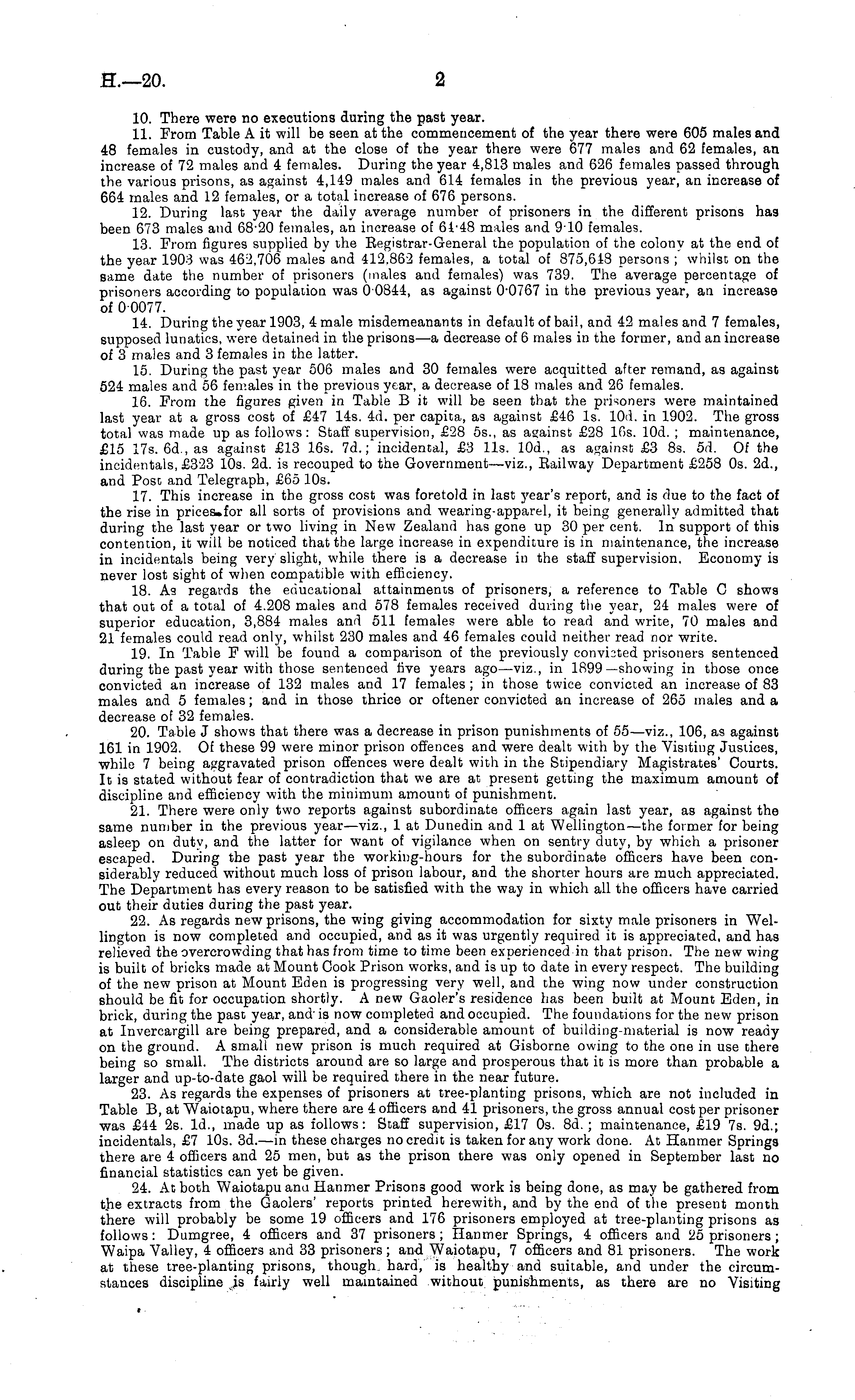 10. There were no executions during the past year. 11. From Table A it will be seen at the commencement of the year there were 605 males and 48 females in custody, and at the close of the year there were 677 males and 62 females, an increase of 72 males and 4 females. During the year 4,813 males and 626 females passed through the various prisons, as against 4,149 males and 614 females in the previous year, an increase of 664 males and 12 females, or a total increase of 676 persons. 12. During last year the daily average number of prisoners in the different prisons has been 673 males and 68-20 females, an increase of 61-48 males and 910 females. 13. From figures supplied by the Registrar-General the population of the colony at the end of the year 1903 was 462,706 males and 412,862 females, a total of 875,648 persons ; whilst on the same date the number of prisoners (males and females) was 739. The average percentage of prisoners according to population was 00844, as against 0-0767 in the previous year, an increase of 00077. 14. During the year 1903, 4 male misdemeanants in default of bail, and 42 males and 7 females, supposed lunatics, were detained in the prisons—a decrease of 6 males in the former, and an increase of 3 males and 3 females in the latter. 15. During the past year 506 males and 30 females were acquitted after remand, as against 524 males and 56 females in the previous year, a decrease of 18 males and 26 females. 16. From the figures given in Table B it will be seen that the prisoners were maintained last year at a gross cost of £47 14s. 4d. per capita, as against £46 Is. lOd. in 1902. The gross total was made up as follows: Staff supervision, £28 55., as against £28 IBs. lOd. ; maintenance, £15 17s. 6d, as against £13 16s. 7d.; incidental, £3 lis. 10d., as against £3 Bs. sd. Of the incidentals, £323 10s. 2d. is recouped to the Government—viz., Bailway Department £258 os. 2d., and Post and Telegraph, £65 10s. 17. This increase in the gross cost was foretold in last year's report, and is due to the fact of the rise in prices.for all sorts of provisions and wearing-apparel, it being generally admitted that during the last year or two living in New Zealand has gone up 30 per cent. In support of this contention, it will be noticed that the large increase in expenditure is in maintenance, the increase in incidentals being very slight, while there is a decrease in the staff supervision. Economy is never lost sight of when compatible with efficiency. 18. As regards the educational attainments of prisoners, a reference to Table C shows that out of a total of 4.208 males and 578 females received during the year, 24 males were of superior education, 3,884 males and 511 females were able to read and write, 70 males and 21 females could read only, whilst 230 males and 46 females could neither read nor write. 19. In Table F will be found a comparison of the previously conviated prisoners sentenced during the past year with those sentenced five years ago —viz., in 1899—showing in those once convicted an increase of 132 males and 17 females ; in those twice convicted an increase of 83 males and 5 females; and in those thrice or oftener convicted an increase of 265 males and a decrease of 32 females. 20. Table J shows that there was a decrease in prison punishments of 55—viz., 106, as against 161 in 1902. Of these 99 were minor prison offences and were dealt with by the Visiting Justices, while 7 being aggravated prison offences were dealt with in the Stipendiary Magistrates' Courts. It is stated without fear of contradiction that we are at present getting the maximum amount of discipline and efficiency with the minimum amount of punishment. 21. There were only two reports against subordinate officers again last year, as against the same number in the previous year—viz., 1 at Dunedin and 1 at Wellington—the former for being asleep on duty, and the latter for want of vigilance when on sentry duty, by which a prisoner escaped. During the past year the working-hours for the subordinate officers have been considerably reduced without much loss of prison labour, and the shorter hours are much appreciated. The Department has every reason to be satisfied with the way in which all the officers have carried out their duties during the past year. 22. As regards new prisons, the wing giving accommodation for sixty male prisoners in Wellington is now completed and occupied, and as it was urgently required it is appreciated, and has relieved the overcrowding that has from time to time been experienced in that prison. The new wing is built of bricks made at Mount Cook Prison works, and is up to date in every respect. The building of the new prison at Mount Eden is progressing very well, and the wing now under construction should be fit for occupation shortly. A new Gaoler's residence has been built at Mount Eden, in brick, during the past year, and' is now completed and occupied. The foundations for the new prison at Invercargill are being prepared, and a considerable amount of building-material is now ready on the ground. A small new prison is much required at Gisborne owing to the one in use there being so small. The districts around are so large and prosperous that it is more than probable a larger and up-to-date gaol will be required there in the near future. 23. As regards the expenses of prisoners at tree-planting prisons, which are not included in Table B, at Waiotapu, where there are 4 officers and 41 prisoners, the gross annual cost per prisoner was £44 2s. Id., made up as follows: Staff supervision, £17 os. Bd. ; maintenance, £19 7s. 9d.; incidentals, £7 10s. 3d.—in these charges no credit is taken for any work done. At Hanmer Springs there are 4 officers and 25 men, but as the prison there was only opened in September last no financial statistics can yet be given. 24. At both Waiotapu anu Hanmer Prisons good work is being done, as may be gathered from the extrac
