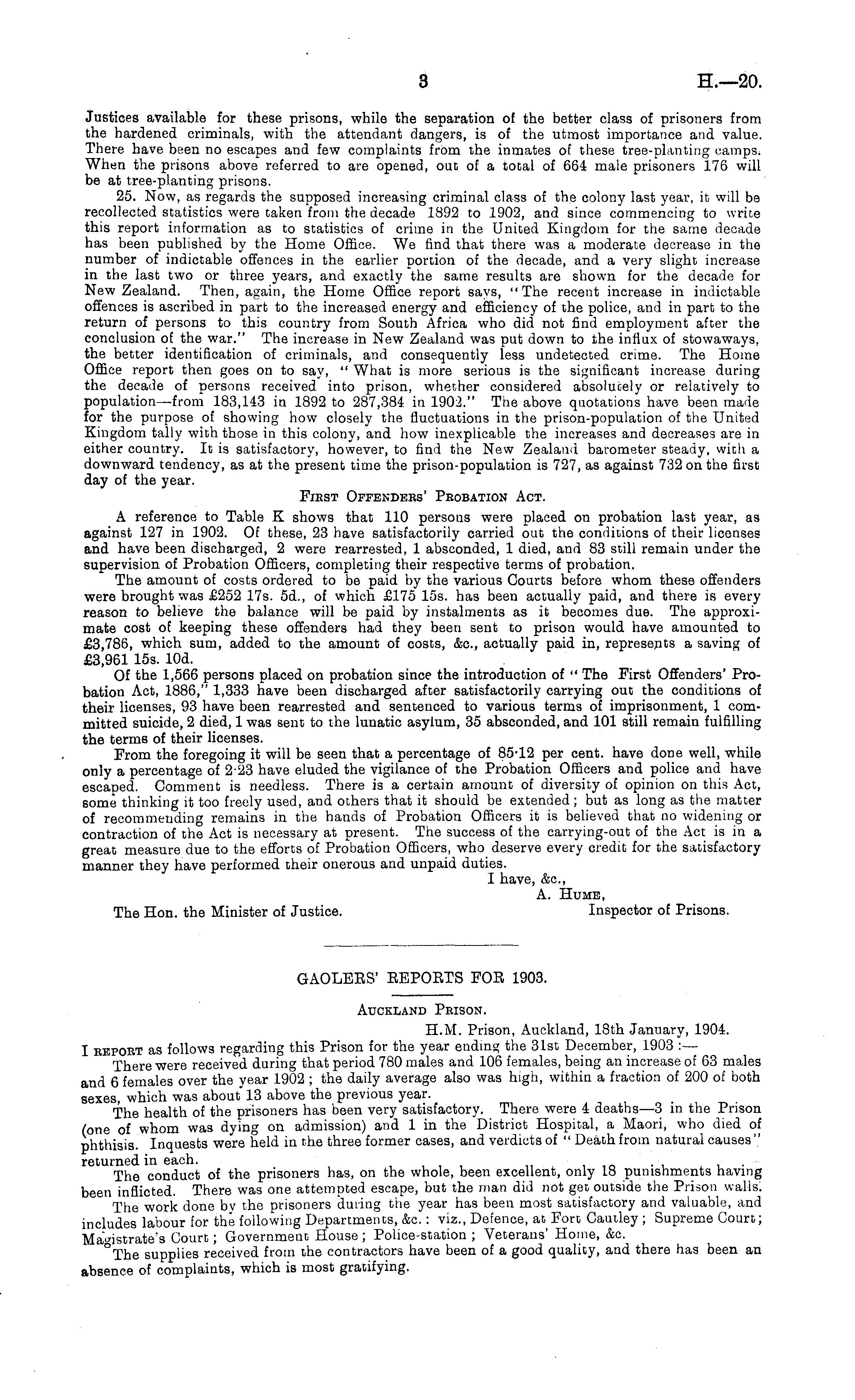 Justices available for these prisons, while the separation of the better class of prisoners from the hardened criminals, with the attendant dangers, is of the utmost importance and value. There have been no escapes and few complaints from the inmates of these tree-planting camps, When the prisons above referred to are opened, out of a total of 664 male prisoners 176 will be at tree-planting prisons. 25. Now, as regards the supposed increasing criminal class of the colony last year, it will be recollected statistics were taken from the decade 1892 to 1902, and since commencing to write this report information as to statistics of crime in the United Kingdom for the same decade has been published by the Home Office. We find that there was a moderate decrease in the number of indictable offences in the earlier portion of the decade, and a very slight increase in the last two or three years, and exactly the same results are shown for the decade for New Zealand. Then, again, the Home Office report says, "The recent increase in indictable offences is ascribed in part to the increased energy and efficiency of the police, and in part to the return of persons to this country from South Africa who did not find employment after the conclusion of the war." The increase in New Zealand was put down to the influx of stowaways, the better identification of criminals, and consequently less undetected crime. The Home Office report then goes on to say, " What is more serious is the significant increase during the decade of persons received into prison, whether considered absolutely or relatively to population—from 183,143 in 1892 to 287,384 in 1902." The above quotations have been made for the purpose of showing how closely the fluctuations in the prison-population of the United Kingdom tally with those in this colony, and how inexplicable the increases and decreases are in either country. It is satisfactory, however, to find the New Zealand barometer steady, with a downward tendency, as at the present time the prison-population is 727, as against 732 on the first day of the year. First Offenders' Probation Act. A reference to Table X shows that 110 persons were placed on probation last year, as against 127 in 1902. Of these, 23 have satisfactorily carried out the conditions of their licenses and have been discharged, 2 were rearrested, 1 absconded, 1 died, and 83 still remain under the supervision of Probation Officers, completing their respective terms of probation. The amount of costs ordered to be paid by the various Courts before whom these offenders were brought was £252 17s. 5d., of which £175 15s. has been actually paid, and there is every reason to believe the balance will be paid by instalments as it becomes due. The approximate cost of keeping these offenders had they been sent to prison would have amounted to £3,786, which sum, added to the amount of costs, &c, actually paid in, represents a saving of £3,961 15s. lOd. Of the 1,566 persons placed on probation since the introduction of " The First Offenders' Probation Act, 1886," 1,333 have been discharged after satisfactorily carrying out the conditions of their licenses, 93 have been rearrested and sentenced to various terms of imprisonment, 1 committed suicide, 2 died, 1 was sent to the lunatic asylum, 35 absconded, and 101 still remain fulfilling the terms of their licenses. From the foregoing it will be seen that a percentage of 85-12 per cent, have done well, while only a percentage of 223 have eluded the vigilance of the Probation Officers and police and have escaped. Comment is needless. There is a certain amount of diversity of opinion on this Act, some thinking it too freely used, and others that it should be extended; but as long as the matter of recommending remains in the hands of Probation Officers it is believed that no widening or contraction of the Act is necessary at present. The success of the carrying-out of the Act is in a great measure due to the efforts of Probation Officers, who deserve every credit for the satisfactory manner they have performed their onerous and unpaid duties. I have, &c, A. Hume, The Hon. the Minister of Justice. Inspector of Prisons.