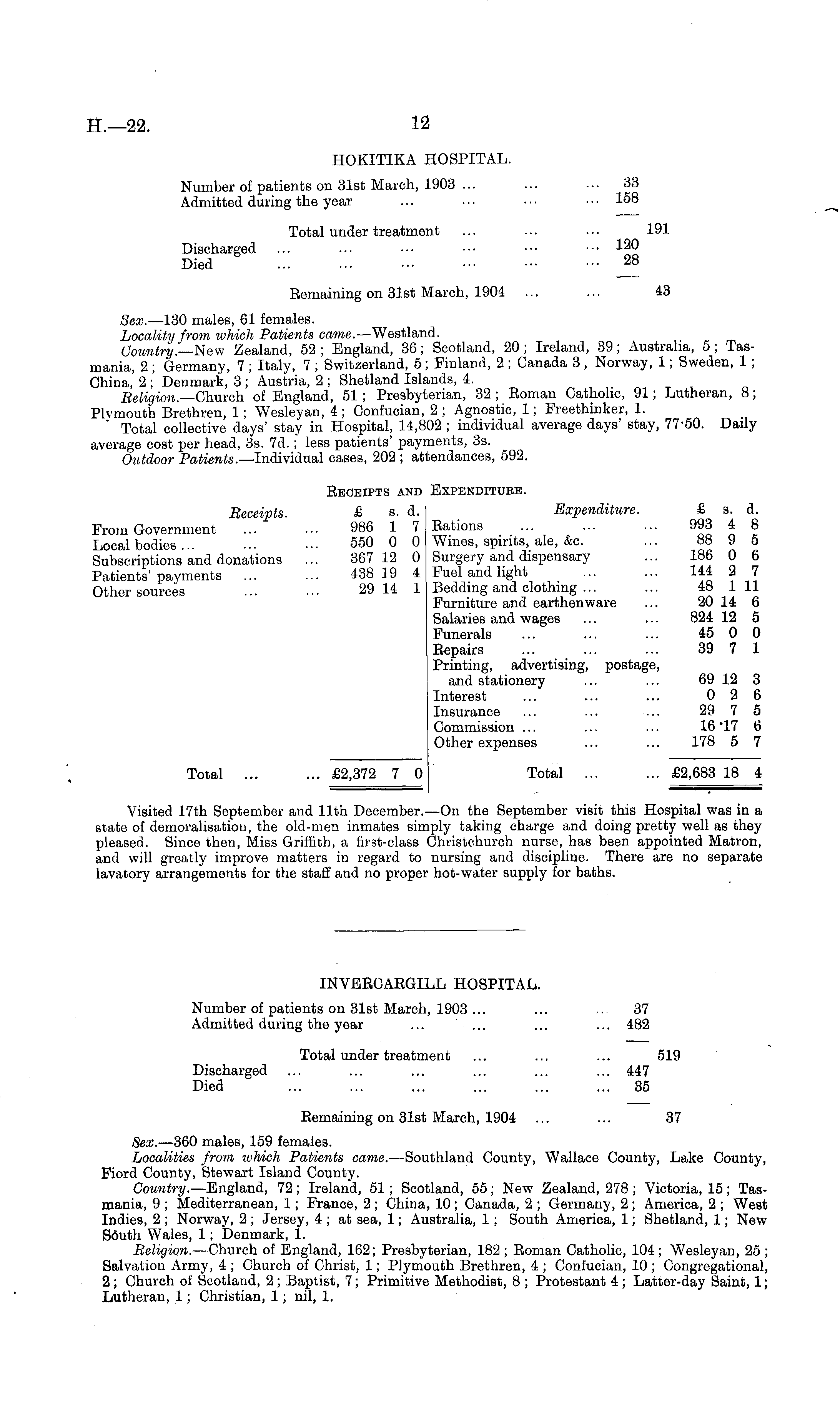 INVERCARGILL HOSPITAL. Number of patients on 31st March, 1903 ... ... ... 37 Admitted during the year ... ... ... ... 482 Total under treatment ... ... ... 519 Discharged ... ... ... ... ... ... 447 Died ... ... ... ... ... ... 35 Remaining on 31st March, 1904 ... ... 37 Sex. —360 males, 159 females. Localities from ivhich Patients came. —Southland County, Wallace County, Lake County, Fiord County, Stewart Island County. Country.— England, 72; Ireland, 51; Scotland, 55; New Zealand, 278 ; Victoria, 15; Tasmania, 9 ; Mediterranean, 1; France, 2; China, 10; Canada, 2 ; Germany, 2; America, 2 ; West Indies, 2 ; Norway, 2 ; Jersey, 4; at sea, 1; Australia, 1; South America, 1; Shetland, 1; New South Wales, 1; Denmark, 1. Beligion. —Church of England, 162; Presbyterian, 182 ; Roman Catholic, 104; Wesleyan, 25 ; Salvation Army, 4 ; Church of Christ, 1; Plymouth Brethren, 4 ; Confucian, 10 ; Congregational, 2; Church of Scotland, 2 ; Baptist, 7; Primitive Methodist, 8 ; Protestant 4 ; Latter-day Saint, 1; Lutheran, 1; Christian, 1; nil, 1.