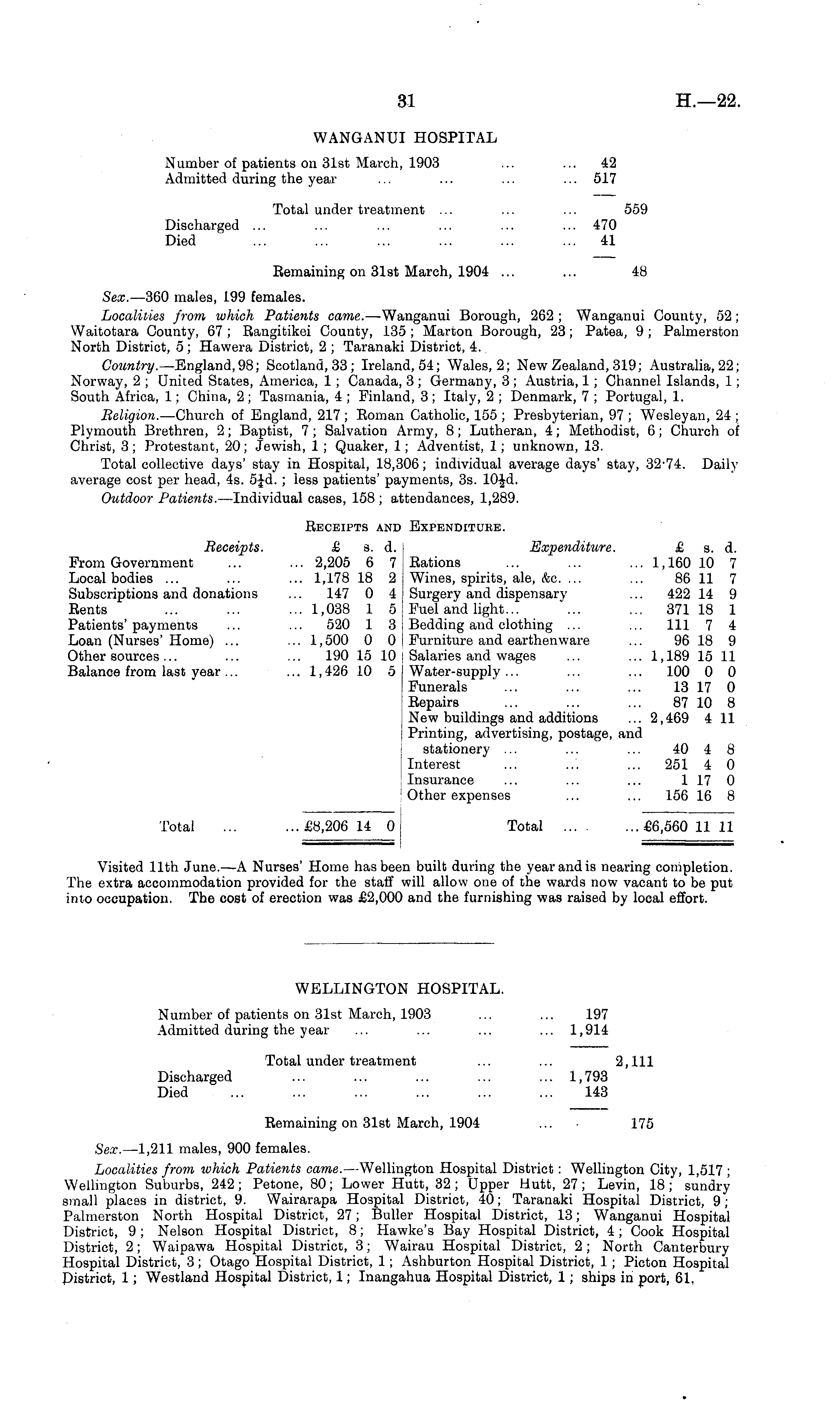 WELLINGTON HOSPITAL. Number of patients on 31st March, 1903 ... ... 197 Admitted during the year ... ... ... ... 1, 914 Total under treatment ... ... 2,111 Discharged ... ... ... ... ... 1,793 Died 143 Remaining on 31st March, 1904 ... • 175 Sea-.—1,211 males, 900 females. Localities from which Patients came. —Wellington Hospital District: Wellington City, 1,517 ; Wellington Suburbs, 242; Petone, 80; Lower Hutt, 32; Upper Hutt, 27; Levin, 18; sundry small places in district, 9. Wairarapa Hospital District, 40; Taranaki Hospital District, 9; Palmerston North Hospital District, 27; Buller Hospital District, 13; Wanganui Hospital District, 9 ; Nelson Hospital District, 8; Hawke's Bay Hospital District, 4 ; Cook Hospital District, 2; Waipawa Hospital District, 3; Wairau Hospital District, 2; North Canterbury Hospital District, 3; Otago Hospital District, 1; Ashburton Hospital District, 1; Picton Hospital District, 1; Westland Hospital District, 1; Inangahua Hospital District, 1; ships in port, 61,