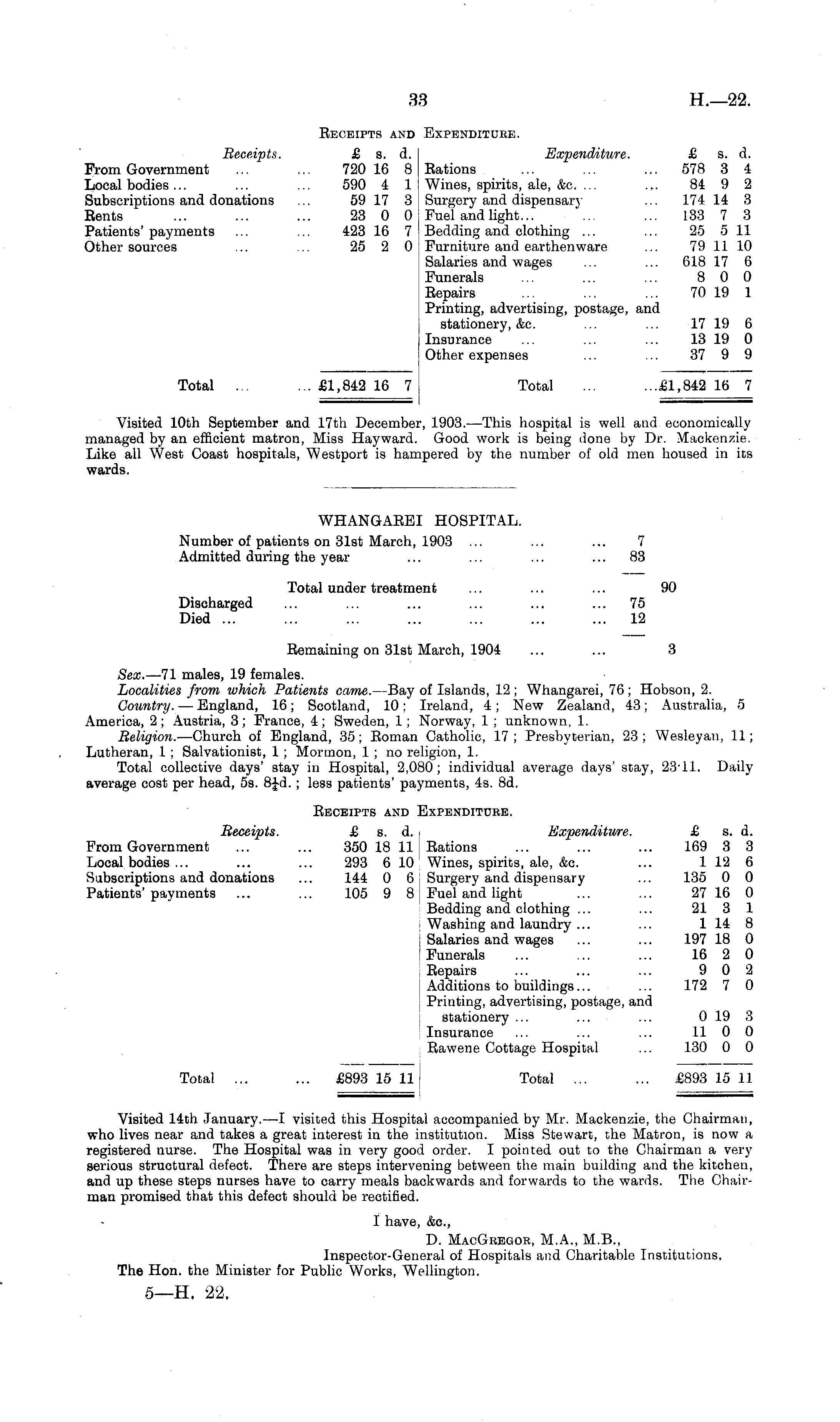 Eecbipts and Expendituke. Receipts. £ s. d. Expenditure. £ s. d. From Government ... ... 720 16 8 Eations ... ... ... 57834 Local bodies... ... ... 590 4 1 Wines, spirits, ale, &c. ... ... 84 9 2 Subscriptions and donations ... 59 17 3 Surgery and dispensarj- ... 174 14 3 Bents ... ... ... 23 0 0 Fuel and light... ... ... 133 7 8 Patients'payments ... ... 423 16 7 j Bedding and clothing ... ... 25 511 Other sources ... ... 25 2 0 J Furniture and earthenware ... 79 11 10 Salaries and wages ... ... 618 17 6 Funerals ... ... ... 800 Repairs ... ... ... 70 19 1 Printing, advertising, postage, and stationery, &c. ... ... 17 19 6 Insurance ... ... ... 13 19 0 Other expenses ... ... 37 9 9 Total ... ... £1,842 16 7 Total ... ...£1,842 16 7 Visited 10th September and 17th December, 1903. —-This hospital is well and economically managed by an efficient matron, Miss Hayward. Good work is being done by Dr. Mackenzie. Like all West Coast hospitals, Westport is hampered by the number of old men housed in its wards.