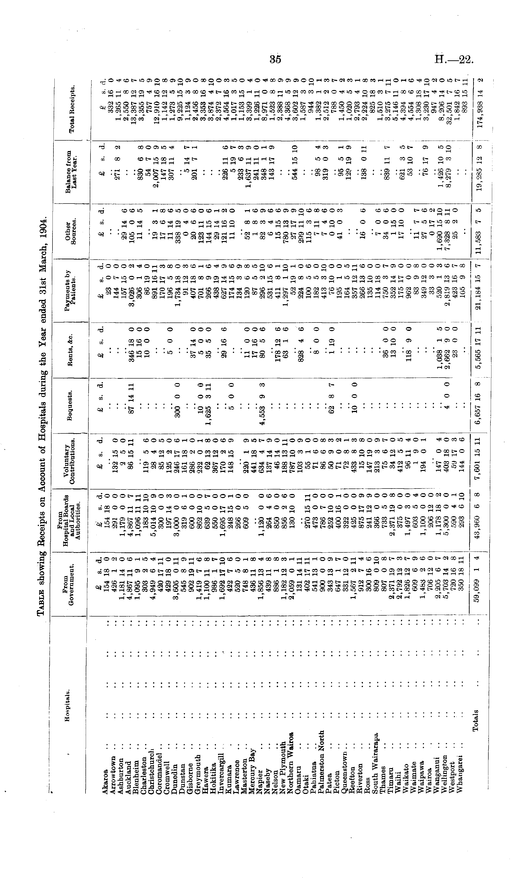 Hospitals. From Government. From Hospital Boards and Local Authorities. Voluntary Contributions. Bequests. Rents, &c. Payments by Patients. Other Sources. Balance from Last Year. Total Receipts. t Akaroa Arrowtown Ashburton ... Auckland Blenheim Charleston Christchurcli Coromandel Cromwell Dunedin Dunstan Gisborne Greymouth Hawera Hokitika Invercargill . Kumara Lawrence Masterton Mercury Bay Napier Naseby Nelson New Plymouth Northern Wairoa Oamaru Otaki Pahiatua Palmerston North Patea Picton Queenstown Reefton Riverton Ross South Wairarapa Thames Timaru Waihi Waikato Waimate Waipawa Wairoa Wanganui Wellington Westport Whangarei £ s. d. 154 18 0 426 1 2 1.181 14 0 4,867 11 6 1,095 9 1 303 2 5 4,949 6 4 420 17 11 429 18 0 3,605 0 11 545 8 9 902 19 11 1,419 7 6 1,100 11 8 986 1 7 1,692 17 10 422 7 6 520 5 0 748 8 1 436 11 8 1,856 13 4 439 11 8 886 1 8 1.182 12 3 2,059 0 1 131 14 11 402 17 11 541 13 1 900 0 0 343 13 9 647 1 7 331 12 0 1,567 2 11 912 7 4 300 16 6 809 0 10 807 0 8 2,371 19 7 2,792 12 3 1,826 12 7 609 6 9 1,483 2 6 706 12 0 2,205 6 7 5,703 14 2 720 16 8 350 18 11 £ s. d. 154 18 0 291 0 0 1,179 0 0 4,867 11 7 1,096 11 11 183 10 10 5,014 10 9 300 0 0 197 14 3 3,000 0 0 319 6 1 600 0 0 862 10 0 639 5 7 550 0 0 1,695 17 0 248 15 1 266 0 0 609 5 0 1,120 0 0 264 4 6 850 0 0 856 2 6 130 10 0 £ s. d. 132 15 0 2 5 0 86 15 11 119 5 6 28 4 0 85 12 5 125 2 0 246 17 6 161 18 1 286 2 0 232 0 1 62 13 8 367 12 0 170 2 6 148 15 9 220 1 9 441 18 5 634 4 7 137 14 9 46 14 0 188 13 11 787 10 0 103 3 9 55 1 0 71 6 0 86 6 8 50 9 3 71 0 2 72 8 1 433 8 3 15 10 8 147 19 0 213 3 9 75 6 7 34 12 0 412 5 5 96 11 4 19 0 194 0 1 £ s. d. 8714 11 300 0 0 10 0 0 1,625 3 11 5 0 0 4,553' 9 3 £ s. d. 346 18 0 15 16 0 10 0 0 5 0 0 37 14 0 5 0 0 35 5 0 29' 16 6 11 0 0 17 16 0 80 5 6 178 12 6 63 1 6 £ s. d. 23 0 0 144 7 0 157 15 0 3,026 0 2 306 1 4 86 19 0 891 16 11 170 17 3 196 5 8 1,734 18 0 91 12 3 407 18 6 701 8 1 266 9 6 438 19 4 627 14 9 174 15 6 134 3 9 120 6 8 87 5 5 296 2 10 531 15 6 411 8 1 1,297 1 10 52 19 1 224 8 0 100 5 6 182 5 0 413 3 10 76 10 0 195 1 0 164 5 5 357 12 11 266 13 6 135 10 0 114 18 0 750 3 7 352 14 9 175 17 0 962 0 0 83 9 8 349 12 0 33 3 0 520 1 3 2,819 13 6 423 16 7 105 9 8 £ s. d. 29 14 6 105 0 6 11 14 5 19 3 1 17 6 8 11 14 6 338 19 5 0 4 0 20 6 6 123 11 0 144 15 6 29 14 1 121 16 2 11 10 0 52 8 1 18 6 82 3 9 6 4 6 15 15 6 780 13 9 27 17 9 299 11 10 115 3 6 7 11 8 7 4 6 0 10 0 41 0 3 £ s. d. 271 8 2 830 6 8 54 7 0 2,007 15 9 147 18 5 307 11 4 5 14 7 201 7 1 226 11 6 5 19 7 233 6 3 1,637 11 9 241 11 0 348 1 1 143 17 9 544 15 10 98 5 4 319 0 3 95 5 1 129 19 9 138 0 11 839 11 7 621 3 5 53 10 7 76 17 9 1,426 10 5 8,279 3 10 £ s. d. 332 16 0 1,265 11 4 2,550 8 6 13,387 12 7 3,355 19 5 757 4 9 12,910 16 10 1,142 12 8 1,273 5 9 9.225 15 10 1,124 3 9 2,456 8 0 3,353 16 8 3,874 4 10 2,372 7 0 4,564 16 3 1,017 3 5 1,153 15 0 3,399 1 4 1.226 11 0 8,971 0 4 1,523 8 8 2,388 11 9 4,368 5 9 3,602 12 9 1,587 3 0 944 3 10 1,382 1 1 2,512 2 3 788 0 7 1,450 4 2 1,020 5 3 2,793 4 1 2,224 10 8 825 18 3 1,510 3 1 3,275 7 11 5,146 11 0 4,394 8 1 4,554 6 6 1,308 18 4 3,230 17 10 947 4 2 8,206 14 0 32,501 7 5 1,842 10 7 893 15 U 270 15 11 473 0 0 786 7 0 252 10 0 400 16 1 322 0 0 425 0 0 875 17 9 241 12 9 366 0 0 733 5 0 2,371 19 8 375 0 0 1,497 3 0 603 5 4 1,100 0 0 206 12 0 1,178 18 2 5,300 0 0 590 4 1 293 6 10 828 4 6 8 0 0 62 8 7 1 19 0 10 0 0 16 0 6 36* 0 0 13 10 0 7 0 6 34 0 6 1 15 0 17 10 0 118' 9 0 147 0 4 403 18 0 59 17 3 144 0 6 1,038 1 5 2,662 9 0 23 0 0 11 7 7 27 5 6 0 17 2 1,690 15 10 7,328 8 11 25 2 0 40 0 Totals 59,099 1 4 43,960 6 8 7,601 15 11 6,657 16 8 5,565 17 11 21,184 15 7 11,583 7 5 19,285 12 8 174,938 14 i