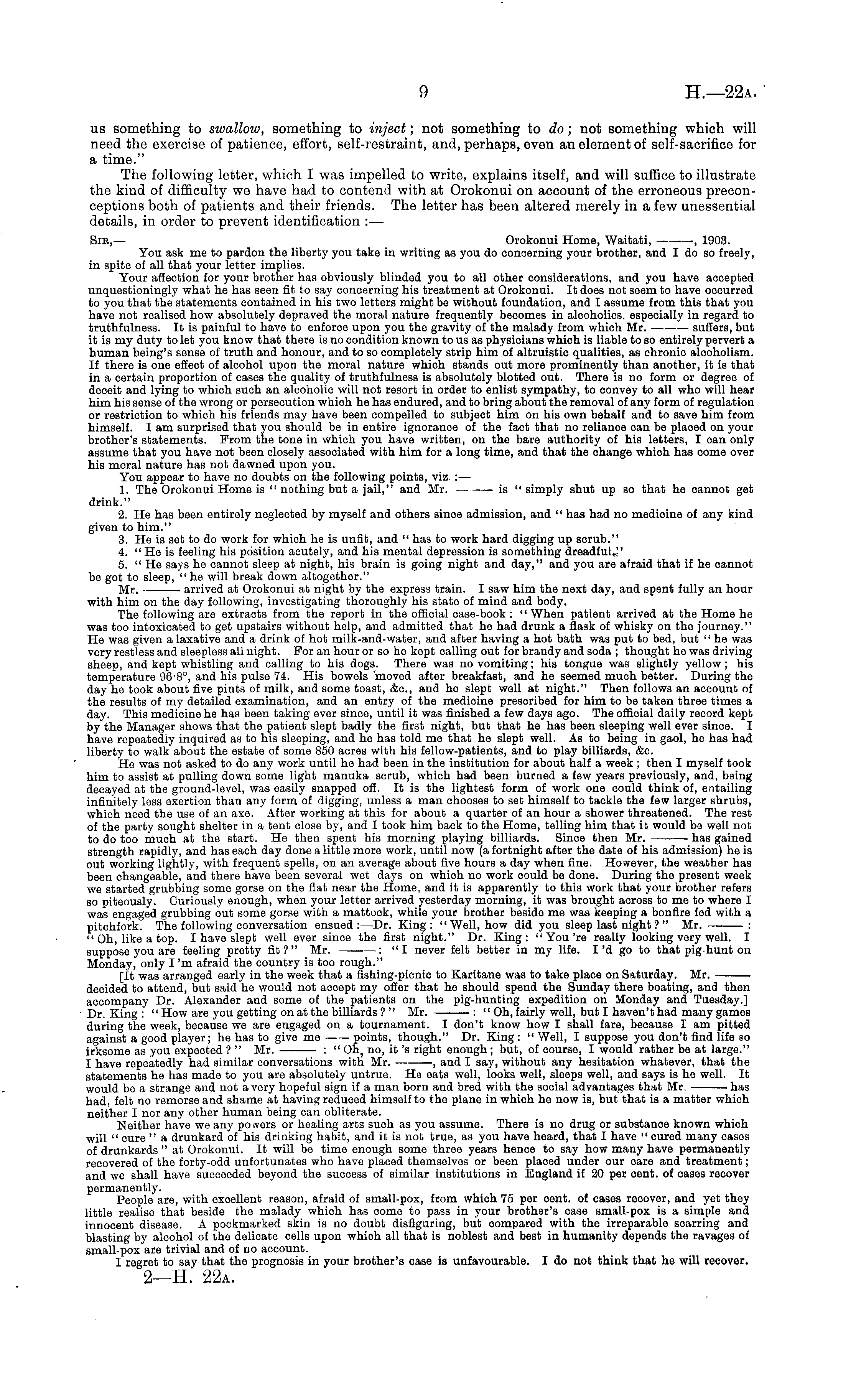 us something to swallow, something to inject ; not something to do ; not something which will need the exercise of patience, effort, self-restraint, and, perhaps, even an element of self-sacrifice for a time." The following letter, which I was impelled to write, explains itself, and will suffice to illustrate the kind of difficulty we have had to contend with at Orokonui on account of the erroneous preconceptions both of patients and their friends. The letter has been altered merely in a few unessential details, in order to prevent identification : — Sib,— Orokonui Home, Waitati, , 1903. You ask me to pardon the liberty you take in writing as you do concerning your brother, and I do so freely, in spite of all that your letter implies. Your affection for your brother has obviously blinded you to all other considerations, and you have accepted unquestioningly what he has seen fit to say concerning his treatment at Orokonui. It does not seem to have occurred to you that the statements contained in his two letters might be without foundation, and I assume from this that you have not realised how absolutely depraved the moral nature frequently becomes in alcoholics, especially in regard to truthfulness. It is painful to have to enforce upon you the gravity of the malady from which Mr. suffers, but it is my duty to let you know that there is no condition known to us as physicians which is liable to so entirely pervert a human being's sense of truth and honour, and to so completely strip him of altruistic qualities, as chronic alcoholism. If there is one effect of alcohol upon the moral nature which stands out more prominently than another, it is that in a certain proportion of cases the quality of truthfulness is absolutely blotted out. There is no form or degree of deceit and lying to which such an alcoholic will not resort in order to enlist sympathy, to convey to all who will hear him his sense of the wrong or persecution which he has endured, and to bring about the removal of any form of regulation or restriction to which his friends may have been compelled to subject him on his own behalf and to save him from himself. lam surprised that you should be in entire ignorance of the fact that no reliance can be placed on your brother's statements. Prom the tone in which you have written, on the bare authority of his letters, I can only assume that you have not been closely associated with him for a long time, and that the change which has come over his moral nature has not dawned upon you. You appear to have no doubts on the following points, viz. : — 1. The Orokonui Home is " nothing but a jail," and Mr. ■ — is " simply shut up so that he cannot get drink." 2. He has been entirely neglected by myself and others since admission, and " has had no medicine of any kind given to him." 3. He is set to do work for which he is unfit, and " has to work hard digging up scrub." 4. " He is feeling his position acutely, and his mental depression is something dreadful." 5. " He says he cannot sleep at night, his brain is going night and day," and you are afraid that if he cannot be got to sleep, " he will break down altogether." Mr. arrived at Orokonui at night by the express train. I saw him the next day, and spent fully an hour with him on the day following, investigating thoroughly his state of mind and body. The following are extracts from the report in the official case-book : " When patient arrived at the Home he was too intoxicated to get upstairs without help, and admitted that he had drunk a flack of whisky on the journey." He was given a laxative and a drink of hot milk-and-water, and after having a hot bath was put to bed, but " he was very restless and sleepless all night. For an hour or so he kept calling out for brandy and soda ; thought he was driving sheep, and kept whistling and calling to his dogs. There was no vomiting; his tongue was slightly yellow; his temperature 96-B°, and his pulse 74. His bowels moved after breakfast, and he seemed much better. During the day he took about five pints of milk, and some toast, &c, and he slept well at night." Then follows an account of the results of my detailed examination, and an entry of the medicine prescribed for him to be taken three times a day. This medicine he has been taking ever since, until it was finished a few days ago. The official daily record kept by the Manager shows that the patient slept badly the first night, but that he has been sleeping well ever since. I have repeatedly inquired as to his sleeping, and he has told me that he slept well. As to being in gaol, he has had liberty to walk about the estate of some 850 acres with his fellow-patients, and to play billiards, &c. He was not asked to do any work until he had been in the institution for about half a week ; then I myself took him to assist at pulling down some light manuka scrub, which had been burued a f6w years previously, and, being decayed at the ground-level, was easily snapped off. It is the lightest form of work one could think of, entailing infinitely less exertion than any form of digging, unless a man chooses to set himself to tackle the few larger shrubs, which need the use of an axe. After working at this for about a quarter of an hour a shower threatened. The rest of the party sought shelter in a tent close by, and I took him back to the Home, telling him that ib would be well not to do too much at the start. He then spent his morning playing billiards. Since then Mr. ■ has gained strength rapidly, and has each day done a little more work, until now (a fortnight after the date of his admission) he is out working lightly, with frequent spells, on an average about five hours a day when fine. However, the weather has been changeable, and there have been several wet days on which no work could be done. During the present week we started grubbing some gorse on the flat near the Home, and it is apparently to this work that your brother refers so piteous