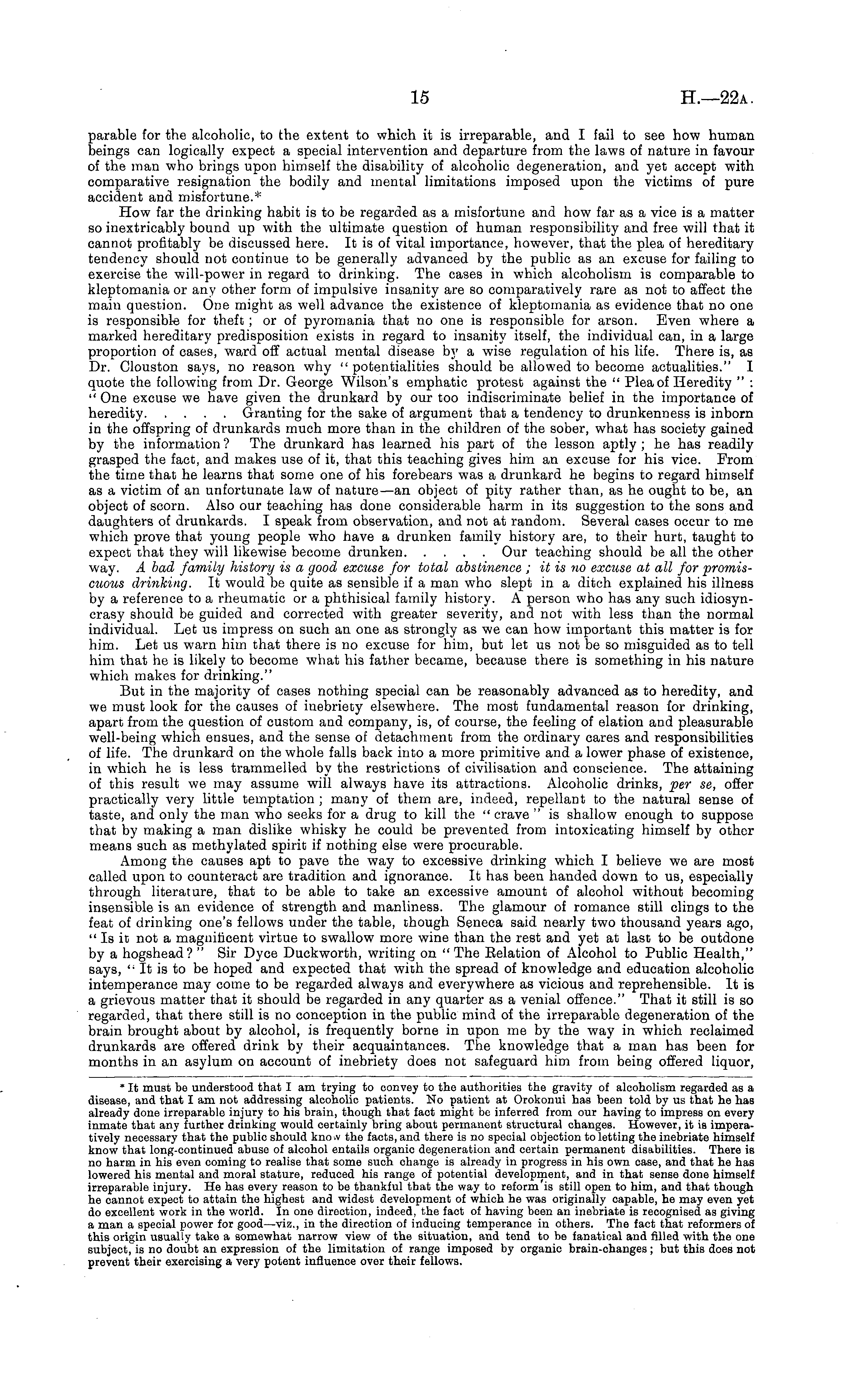 parable for the alcoholic, to the extent to which it is irreparable, and I fail to see how human beings can logically expect a special intervention and departure from the laws of nature in favour of the man who brings upon himself the disability of alcoholic degeneration, and yet accept with comparative resignation the bodily and mental limitations imposed upon the victims of pure accident and misfortune.* How far the drinking habit is to be regarded as a misfortune and how far as a vice is a matter so inextricably bound up with the ultimate question of human responsibility and free will that it cannot profitably be discussed here. It is of vital importance, however, that the plea of hereditary tendency should not continue to be generally advanced by the public as an excuse for failing to exercise the will-power in regard to drinking. The cases in which alcoholism is comparable to kleptomania or any other form of impulsive insanity are so comparatively rare as not to affect the main question. One might as well advance the existence of kleptomania as evidence that no one is responsible for theft ; or of pyromania that no one is responsible for arson. Even where a marked hereditary predisposition exists in regard to insanity itself, the individual can, in a large proportion of cases, ward off actual mental disease by a wise regulation of his life. There is, as Dr. Clouston says, no reason why " potentialities should be allowed to become actualities." I quote the following from Dr. George Wilson's emphatic protest against the " Plea of Heredity " : " One excuse we have given the drunkard by our too indiscriminate belief in the importance of heredity Granting for the sake of argument that a tendency to drunkenness is inborn in the offspring of drunkards much more than in the children of the sober, what has society gained by the information ? The drunkard has learned his part of the lesson aptly ; he has readily grasped the fact, and makes use of it, that this teaching gives him an excuse for his vice. From the time that he learns that some one of his forebears was a drunkard he begins to regard himself as a victim of an unfortunate law of nature —an object of pity rather than, as he ought to be, an object of scorn. Also our teaching has done considerable harm in its suggestion to the sons and daughters of drunkards. I speak from observation, and not at random. Several cases occur to me which prove that young people who have a drunken family history are, to their hurt, taught to expect that they will likewise become drunken Our teaching should be all the other way. A bad family history is a good excuse for total abstinence ; it is no excuse at all for promiscuous drinking. It would be quite as sensible if a man who slept in a ditch explained his illness by a reference to a rheumatic or a phthisical family history. A person who has any such idiosyncrasy should be guided and corrected with greater severity, and not with less than the normal individual. Let us impress on such an one as strongly as we can how important this matter is for him. Let us warn him that there is no excuse for him, but let us not be so misguided as to tell him that he is likely to become what his father became, because there is something in his nature which makes for drinking." But in the majority of cases nothing special can be reasonably advanced as to heredity, and we must look for the causes of inebriety elsewhere. The most fundamental reason for drinking, apart from the question of custom and company, is, of course, the feeling of elation and pleasurable well-being which ensues, and the sense of detachment from the ordinary cares and responsibilities of life. The drunkard on the whole falls back into a more primitive and a lower phase of existence, in which he is less trammelled by the restrictions of civilisation and conscience. The attaining of this result we may assume will always have its attractions. Alcoholic drinks, per se, offer practically very little temptation ; many of them are, indeed, repellant to the natural sense of taste, and only the man who seeks for a drug to kill the " crave " is shallow enough to suppose that by making a man dislike whisky he could be prevented from intoxicating himself by other means such as methylated spirit if nothing else were procurable. Among the causes apt to pave the way to excessive drinking which I believe we are most called upon to counteract are tradition and ignorance. It has been handed down to us, especially through literature, that to be able to take an excessive amount of alcohol without becoming insensible is an evidence of strength and manliness. The glamour of romance still clings to the feat of drinking one's fellows under the table, though Seneca said nearly two thousand years ago, " Is it not a magnificent virtue to swallow more wine than the rest and yet at last to be outdone by a hogshead? " Sir Dyce Duckworth, writing on "The Eelation of Alcohol to Public Health," says, '-It is to be hoped and expected that with the spread of knowledge and education alcoholic intemperance may come to be regarded always and everywhere as vicious and reprehensible. It is a grievous matter that it should be regarded in any quarter as a venial offence." That it still is so regarded, that there still is no conception in the public mind of the irreparable degeneration of the brain brought about by alcohol, is frequently borne in upon me by the way in which reclaimed drunkards are offered drink by their acquaintances. The knowledge that a man has been for months in an asylum on account of inebriety does not safeguard him from being offered liquor,