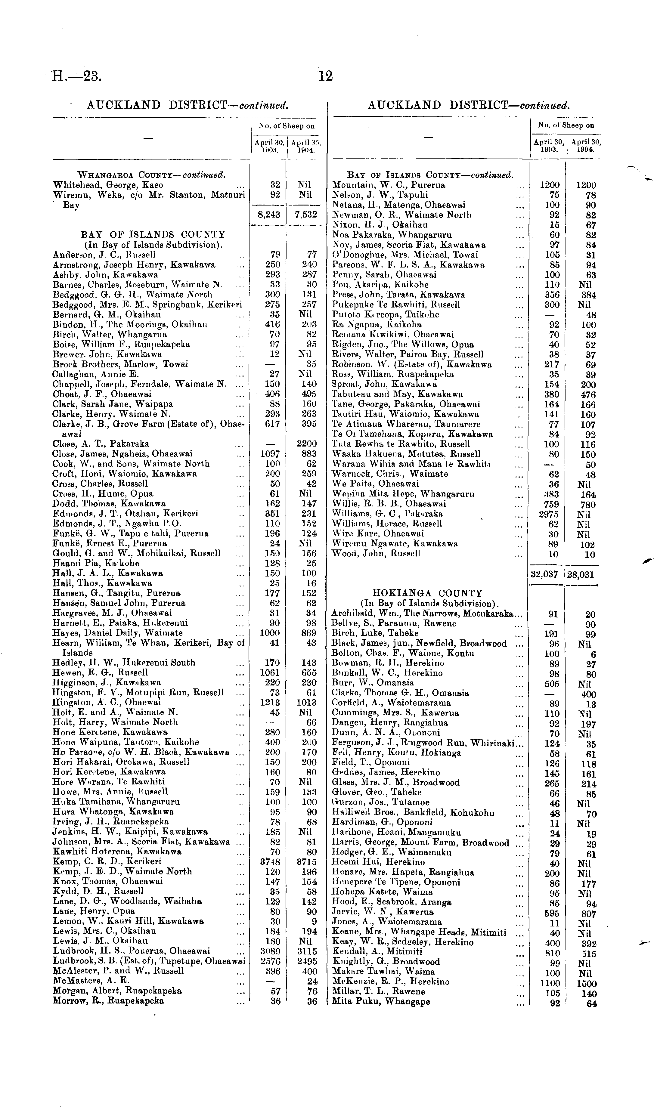 No. of Sheep on April 30, April 30, 19D3. 1804. Bat of Islands County— continued. Mountain, W. O, Purerua Nelson, J. W., Tapuhi Netana, H., Matenga, Ohaeawai Newman, O. R., Waimate North Nixon, H. J., Okaihau Noa Pakaraka, Whangaruru Noy, James, Scoria Flat, Kawakawa O'Donoghue, Mrs. Michael, Towai Parsons, W. F L. S. A., Kawakawa Penny, Sarah, Ohaeawai Pou, Akaripa, Kaikohe Press, John, Tarata, Kawakawa Pukepuke Te Rawhiti, Russell Puloto Kt-reopa, Taikohe Ra Ngapua, Kaikoha Remana Kiwikiwi, Ohaeawai Rigden, Jno., The Willows, Opua Rivers, Walter, Pairoa Bay, Russell Robinson, W. (Estate of), Kawakawa Ross, William, Ruapekapeka Sproat, John, Kawakawa Tabuteau and May, Kawakawa Tane, George, Pakaraka, Ohaeawai Tautiri Hau, Waiomio, Kawakawa Te Atimaua Wharerau, Taumarere Te Oi Tamehana, Kopuru, Kawakawa Tuta Rewha te Rawhito, Russell Waaka Hakuena, Motutea, Russell Warana Wihia and Mana te Rawhiti Warnock, Chris., Waimate We Faita, Ohaeawai Wepiha Mita Hepe, Whangaruru Willis, R. B. B., Ohaeawai Williams, G. C , Pakaraka Williams, Horace, Russell Wire Kare, Ohaeawai Wiremu Ngawate, Kawakawa Wood, John, Russell 1200 75 100 92 15 60 97 105 85 100 110 356 300 92 70 40 38 217 35 154 380 164 141 77 84 100 80 1200 78 90 82 67 82 84 31 94 63 Nil 384 Nil 48 100 32 52 37 69 39 200 476 166 160 107 92 116 150 50 48 Nil 164 780 Nil Nil Nil 102 10 62 36 383 759 2975 62 30 89 10 HOKIANGA COUNT ST (In Bay of Islands Subdivision). Archibald, Wm., The Narrows, Motukaraka... Bellve, S., Pamutnu, Rawene Birch, Luke, Taheke Black, James, jun., Newfield, Broadwood ... Bolton, Chas. F., Waione, Koutu Bowman, R. H., Herekino Itunkall, W. O, Herekino Burr, W., Omanaia Clarke, Thomas G. H., Omanaia Corfield, A., Waiotemarama Cummings, Mrs. S., Kawerua Dangen, Henry, Rangiahua Dunn, A. N. A., Opononi Ferguson, J. J.,Ringwood Run, Whirinaki... Fell, Henry, Koulu, Hokianga Field, T., Opononi Geddes, James, Herekino Glass, Mrs. J. M., Broadwood Glover, Geo., Taheke Gurzon, Jos., Tutamoe Halliwell Bros., Bankfield, Kohukohu Hardiman, G., Opononi Hai'ihone, Hoani, Mangamuku Harris, George, Mount Farm, Broadwood ... Hedger, G. E., Waimamaku Heemi Hui, Herekino Henare, Mrs. Hapeta, Rangiahua Henepere Te Tipene, Opononi Hohepa Katete, Waima Hood, E., Seabrook, Aranga Jarvie, W. N , Kawerua JoneB, A., Waiotemarama Keane, Mrs., Whangape Heads, Mitimiti ... Keay, W. R., Sedgeley, Herekino Kendall, A., Mitimiti ... Knightly, G., Broadwood Makare Tawhai, Waima McKenzie, R. P., Herekino ..' Millar, T. L., Rawene Mita Puku, Whangape 32,037 28,031 91 191 96 100 89 98 505 89 110 92 70 124 58 126 145 265 66 46 48 11 24 29 79 40 200 86 95 85 595 11 40 400 810 99 100 1100 105 92 20 90 i 99 Nil 6 27 80 Nil 400 13 Nil 197 Nil 35 61 118 161 214 85 Nil 70 Nil 19 29 61 Nil Nil 177 Nil 94 807 Nil Nil 392 515 Nil Nil 1500 140 64