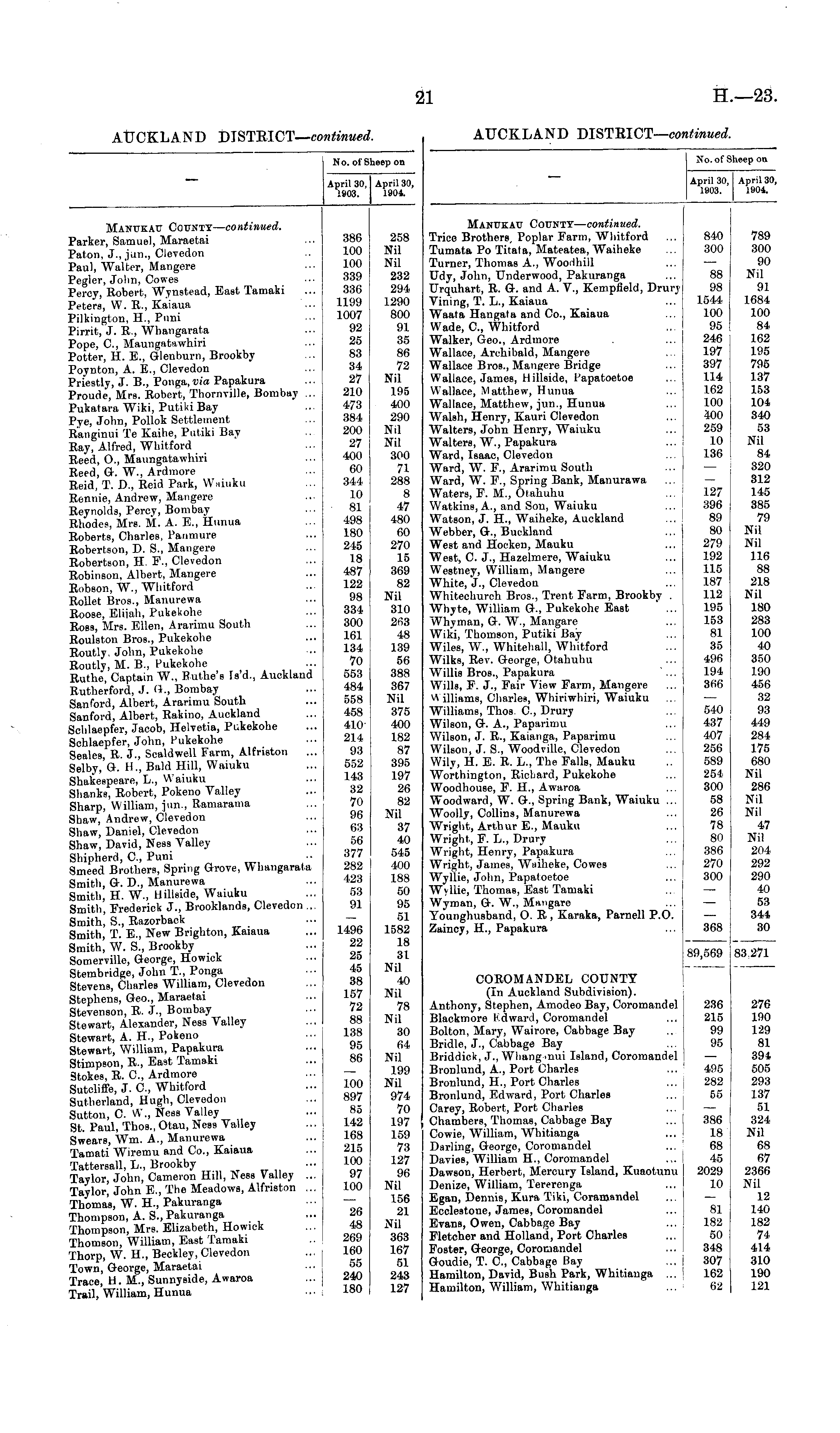 No. of Sheep on April 30, 1903. April 30, 1904. Manukau County— continued. Parker, Samuel, Maraetai Paton, J., jun., Clevedon Paul, Walter, Mangere Pegler, John, Cowes Percy, Robert, Wynstead, East Tamaki Peters, W. R., Kaiaua Pilkington, H., Puni Pirrit, J. R., Whangarata Pope, C, Maungatawhiri Potter, H. E., Glenburn, Brookby Poynton, A. E., Clevedon Priestly, J. B., Ponga, via Papakura Proude, Mrs. Robert, Thornville, Bombay ... Pukatara Wiki, Putiki Bay Pye, John, Pollok Settlement Ranginui Te Kaihe, Putiki Bay Ray, Alfred, Whitford Reed, O., Maungatawhiri Reed, G. W., Ardmore Reid, T. D., Reid Park, Waiuku Rennie, Andrew, Mangere Reynolds, Percy, Bombay Rhodes, Mrs. M. A. E., Hunua Roberts, Charles, Panmure Robertson, D. S., Mangere Robertson, H. F., Clevedon Robinson, Albert, Mangere Robson, W., Whitford Rollet Bros., Manurewa Roose, Eliiah, Pukekohe Ross, Mrs. Ellen, Ararimu South Roulston Bros., Pukekohe Routly. John, Pukekohe Routly, M. B., Pukekohe Ruthe, Captain W., Buthe's Is'd., Auckland Rutherford, J. G., Bombay Sanford, Albert, Ararimu Soutli Sanford, Albert, Rakino, Auckland Schlaepfer, Jacob, Helvetia, Pukekohe Schlaepfer, John, Pukekohe Seales, R. J., Scaldwell Farm, Alfriston Selby, G. H., Bald Hill, Waiuku Shakespeare, L., Waiuku Shanks, Robert, Pokeno Valley Sharp, William, jun., Ramarama Shaw, Andrew, Clevedon Shaw, Daniel, Clevedon Shaw, David, Ness Valley Shipherd, O, Puni Smeed Brothers, Spring Grove, Whangarata Smith, G. D., Manurewa Smith, H. W., HillBide, Waiuku Smith, Frederick J., Brooklands, Clevedon ... Smith, S., Razorback Smith, T. E., New Brighton, Kaiaua Smith, W. S., Brookby Somerville, George, Howick Stembridge, John T., Ponga Stevens, Charles William, Clevedon Stephens, Geo., Maraetai Stevenson, R. J., Bombay Stewart, Alexander, Ness Valley Stewart, A. H., Pokeno Stewart, William, Papakura Stimpson, R., East Tamaki Stokes, R. C, Ardmore Sutcliffe, J. O, Whitford Sutherland, Hugh, Clevedon Sutton, C. W., Ness Valley St. Paul, Thos., Otau, Ness Valley Swears, Wm. A., Manurewa Tamati Wiremu and Co., Kaiaua Tattersall, L., Brookby Taylor, John, Cameron Hill, Ness Valley ... Taylor, John E., The Meadows, Alfriston ... Thomas, W. H., Pakuranga Thompson, A. S., Pakuranga Thompson, Mrs. Elizabeth, Howick Thomson, William, East Tamaki Thorp, W. H., Beckley, Clevedon Town, George, Maraetai Trace, H. M., Sunnyside, Awaroa Trail, William, Hunua 386 100 100 339 336 1199 1007 92 25 83 34 27 210 473 384 200 27 400 60 344 10 81 498 180 245 18 487 122 98 334 300 161 134 70 553 484 558 458 410214 93 552 143 32 70 96 63 56 377 282 423 53 91 258 Nil Nil 232 294 1290 800 91 35 86 72 Nil 195 400 290 Nil Nil 300 71 288 8 47 480 60 270 15 369 82 Nil 310 263 48 139 56 388 367 Nil 375 400 182 87 395 197 26 82 Nil 37 40 545 400 188 50 95 51 1582 18 31 Nil 40 Nil 78 Nil 30 64 Nil 199 Nil 974 70 197 159 73 127 96 Nil 156 21 Nil 363 167 51 243 127 1496 22 25 45 38 157 72 88 138 95 86 100 897 85 142 168 215 100 97 100 26 48 269 160 55 240 180